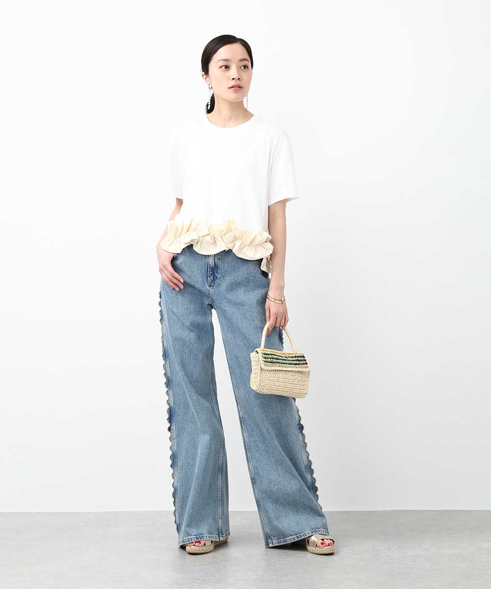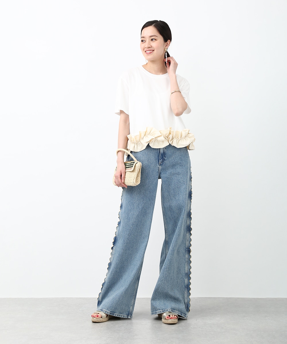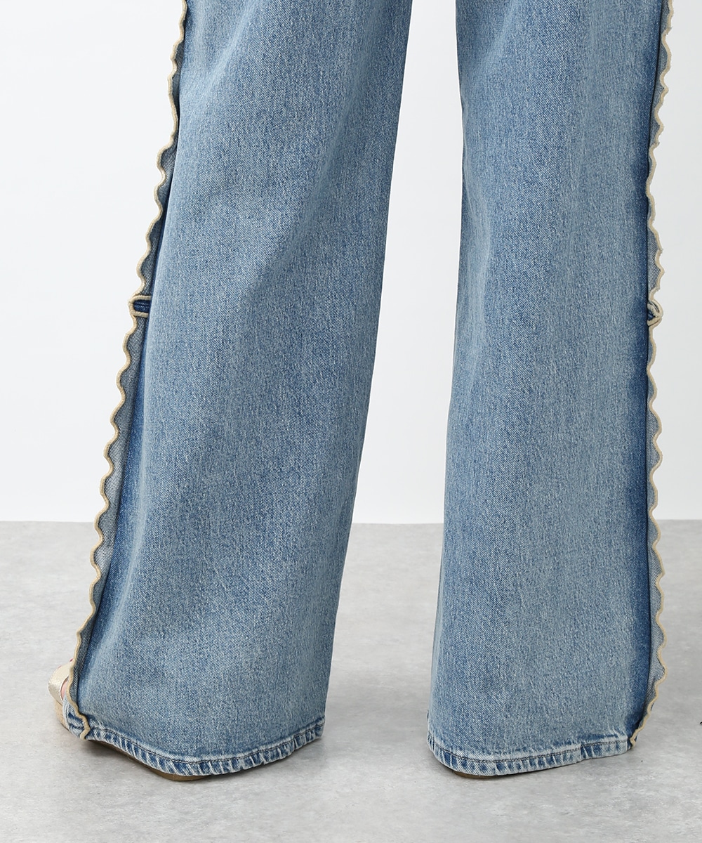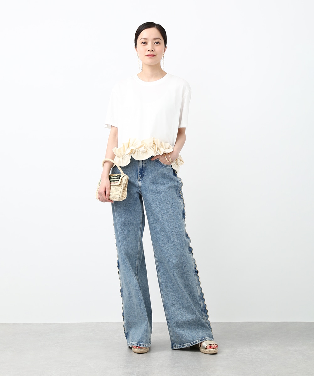 サイドにウェーブデザインを施した、存在感のあるデニムパンツ。ほどよくゆとりのあるシルエットで、リラックス感のある穿き心地も魅力。裾をロールUPして穿くことで軽やかな印象に仕上がり、足元の変化も楽しめます。小ぶりのかごバッグを合わせれば抜け感が加わり、コーディネートの主役として活躍する1本です。