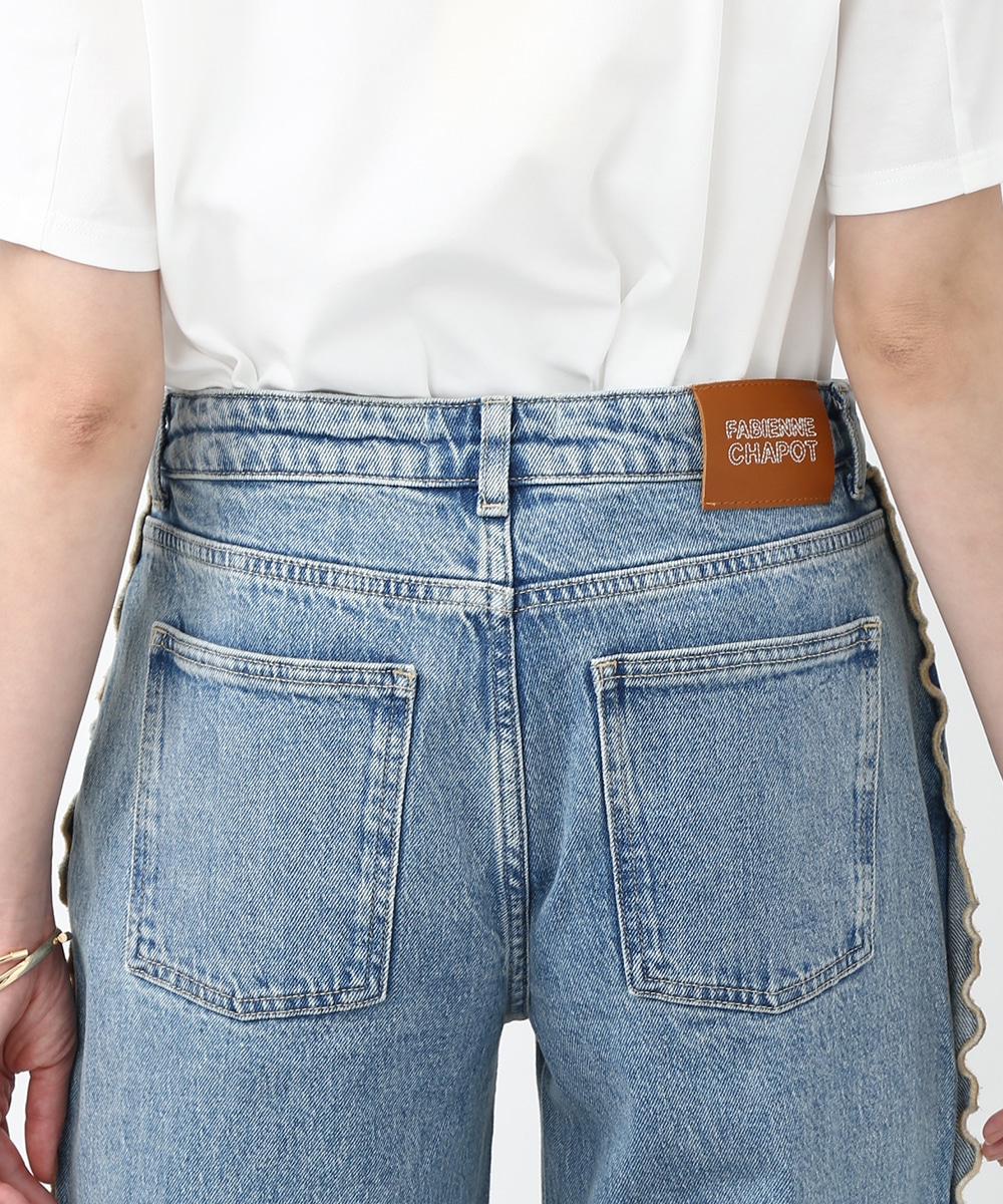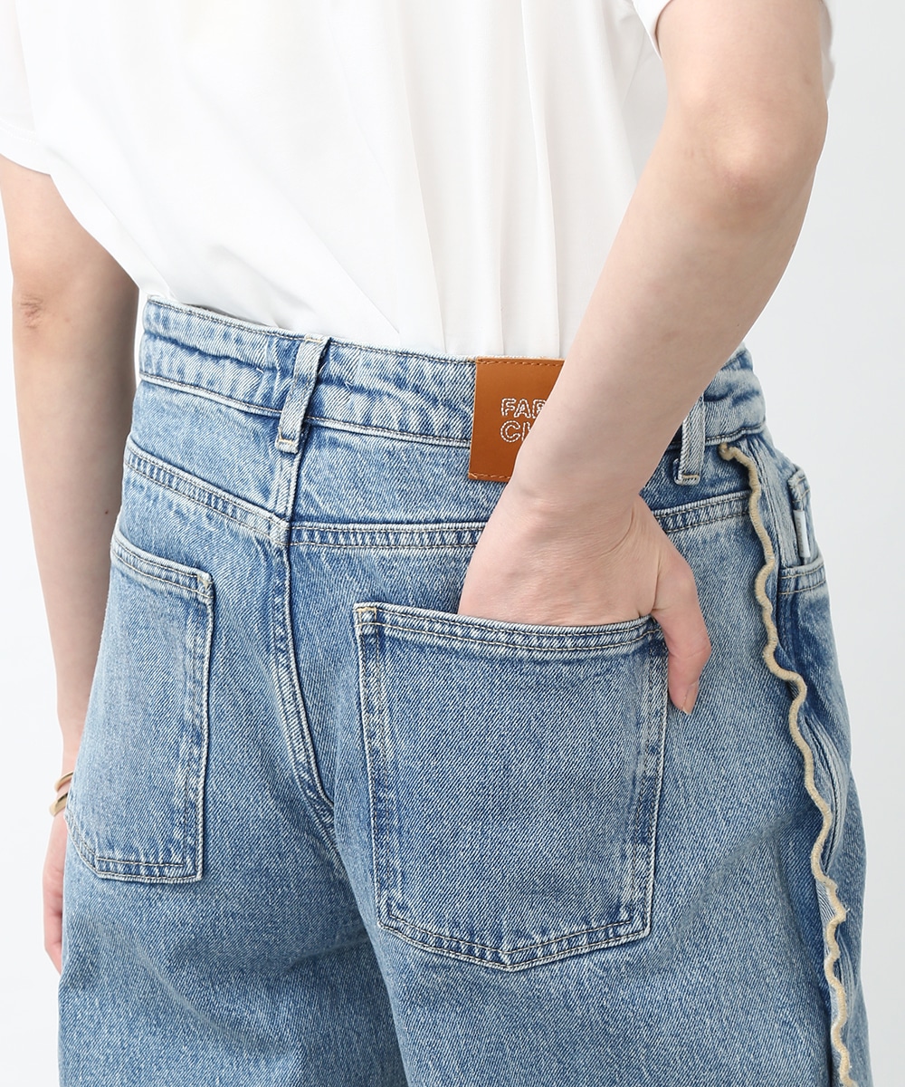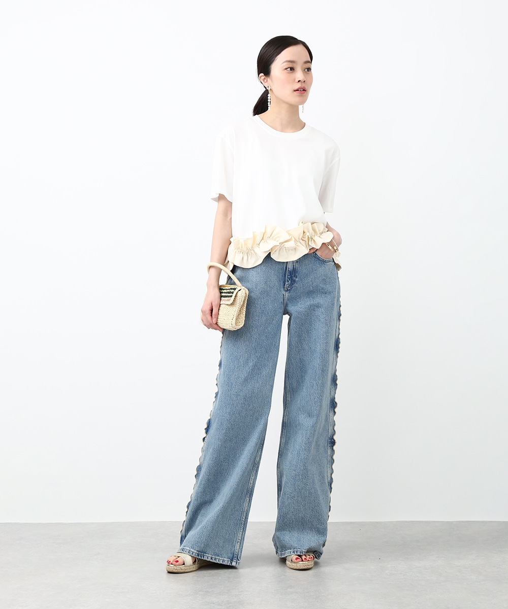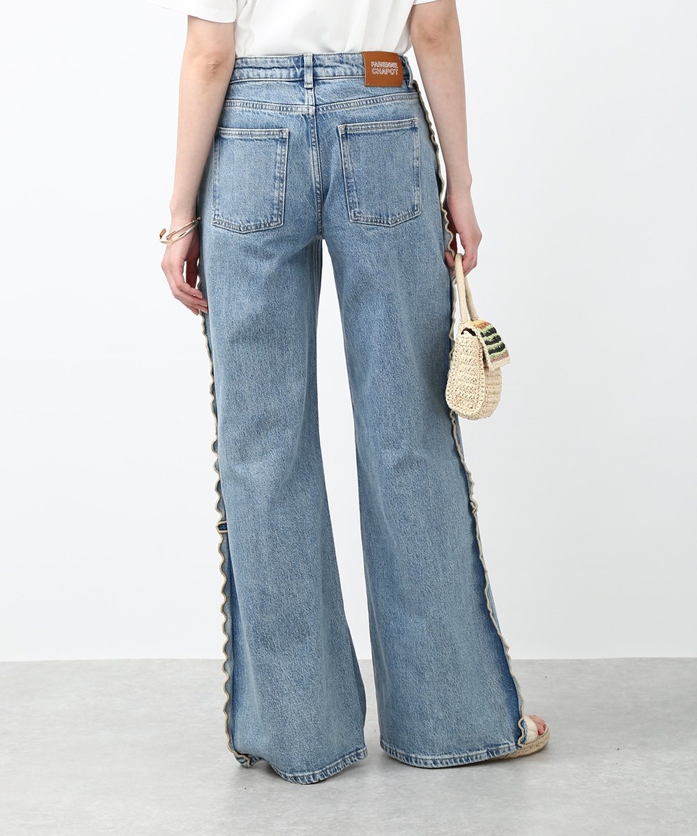 サイドにウェーブデザインを施した、存在感のあるデニムパンツ。ほどよくゆとりのあるシルエットで、リラックス感のある穿き心地も魅力。裾をロールUPして穿くことで軽やかな印象に仕上がり、足元の変化も楽しめます。小ぶりのかごバッグを合わせれば抜け感が加わり、コーディネートの主役として活躍する1本です。