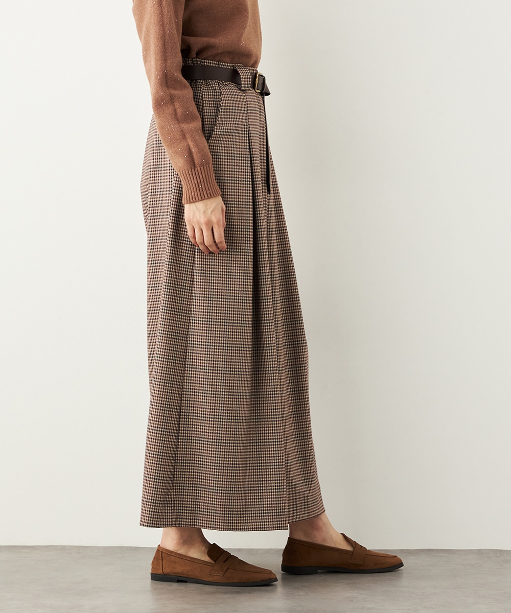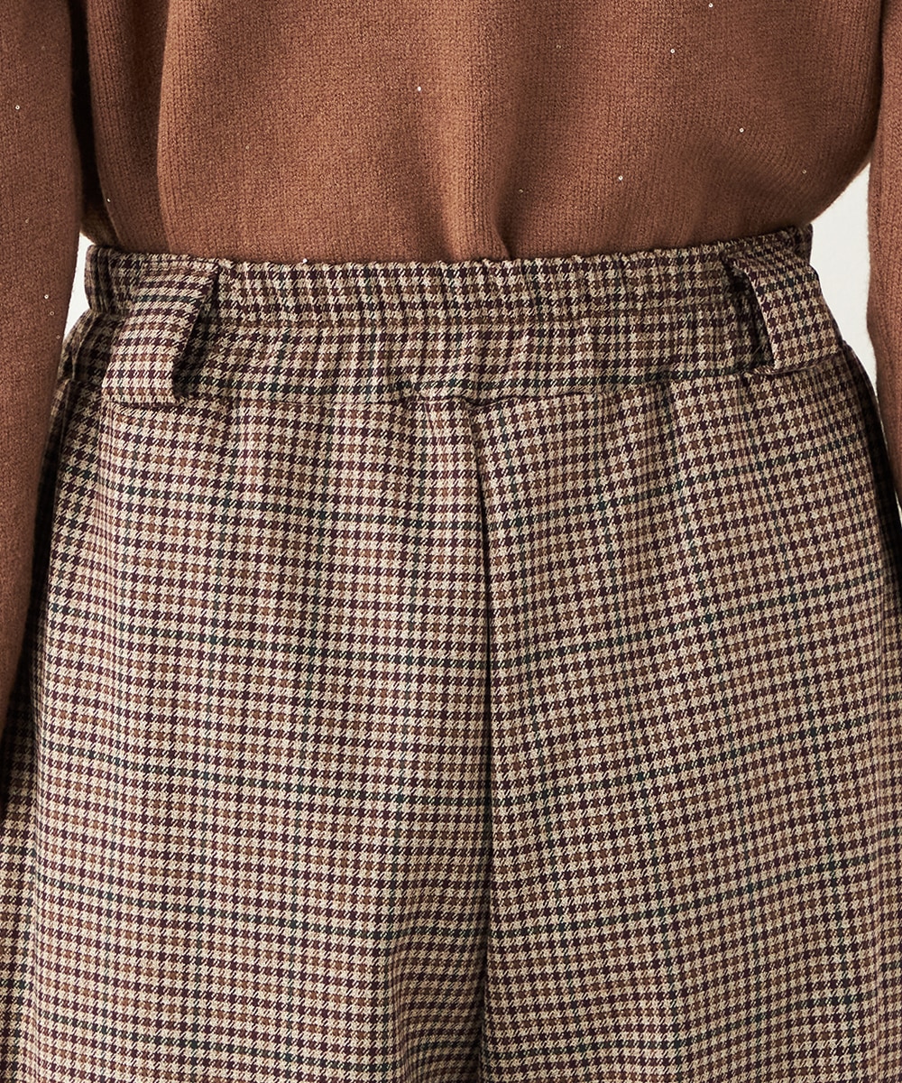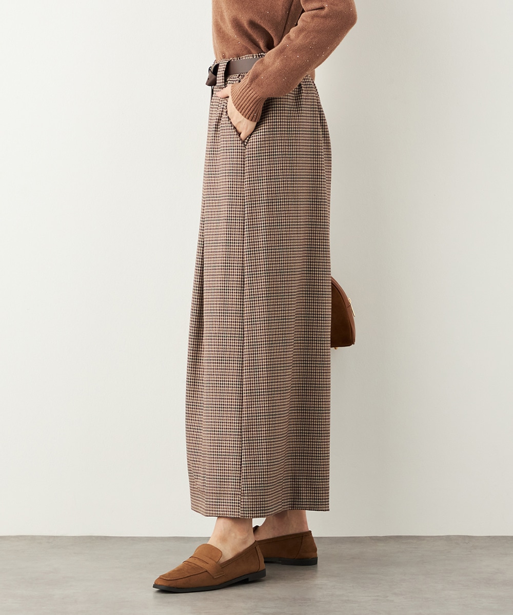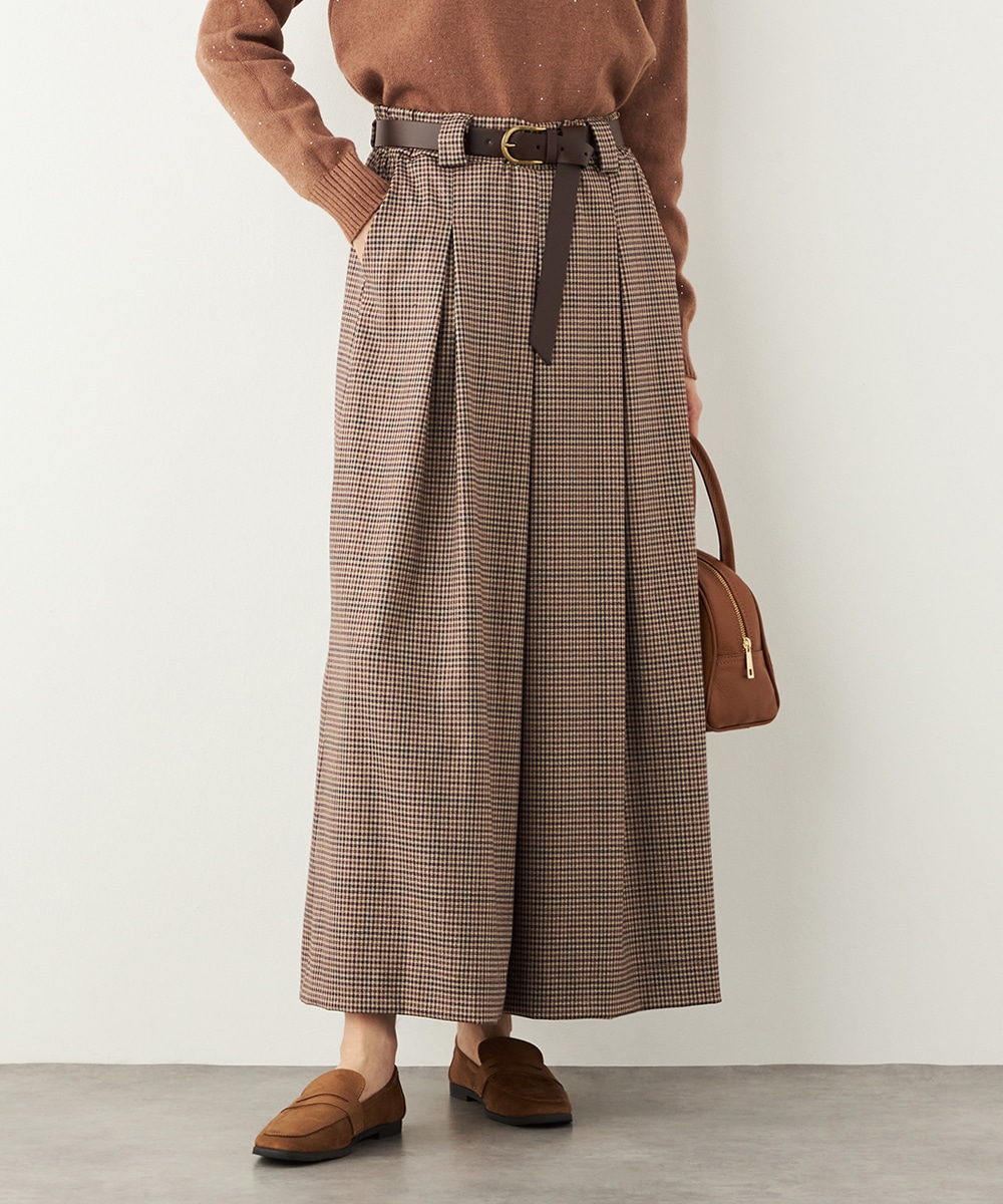 チェック柄のトラディショナルな雰囲気が大人のコーディネートにぴったりな1本。フロントに太めのタックを施して、モード感あふれるワイドなシルエットを作り出しています。ウエストはゴムが入ってフィット感良く着用できます。アレンジの幅が広がるベルト付きです。