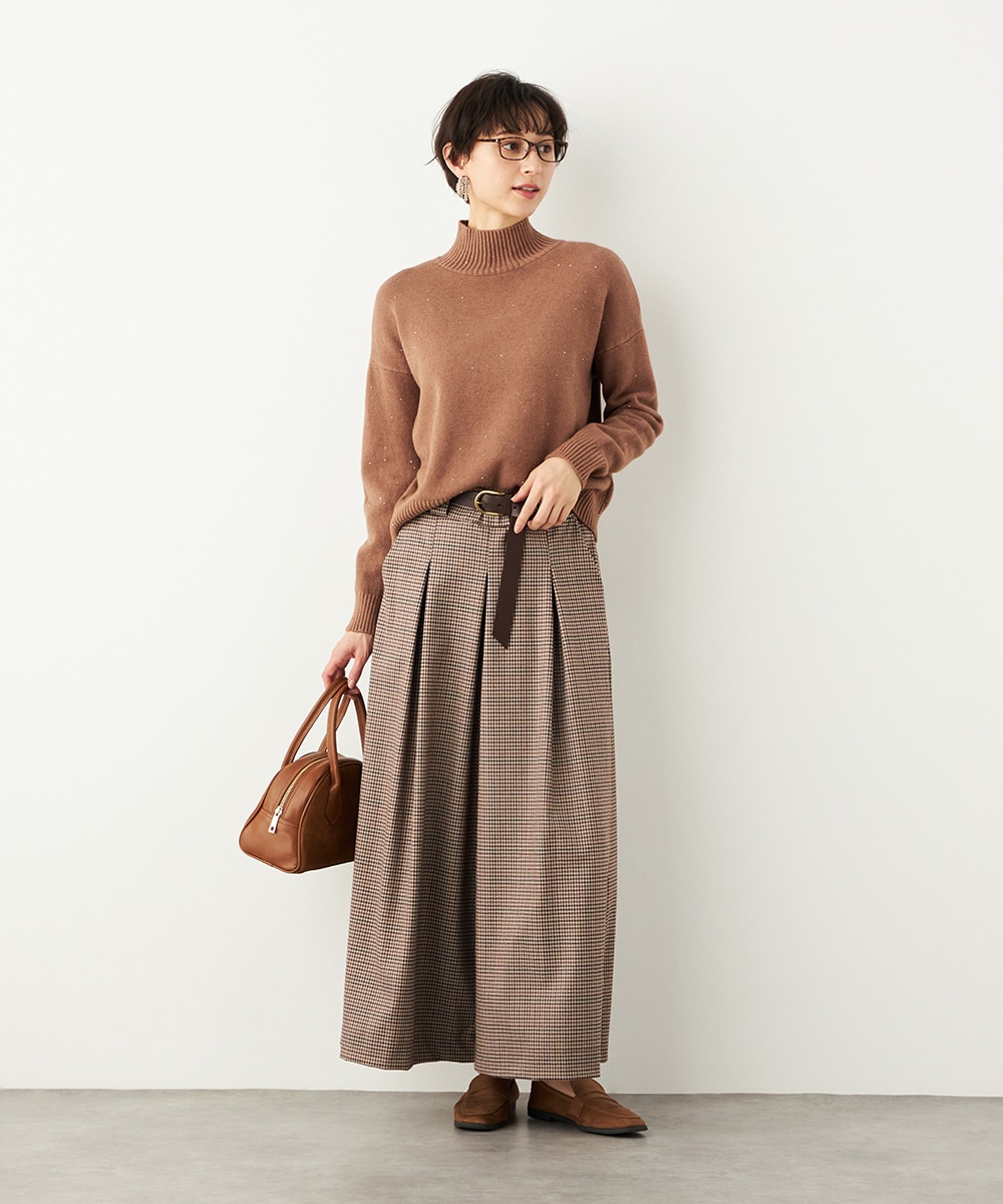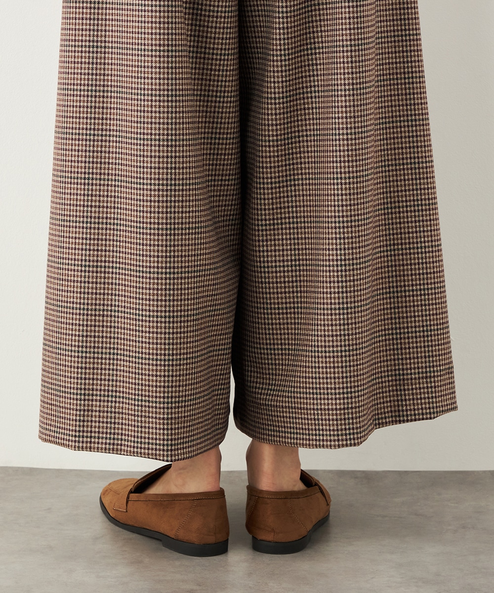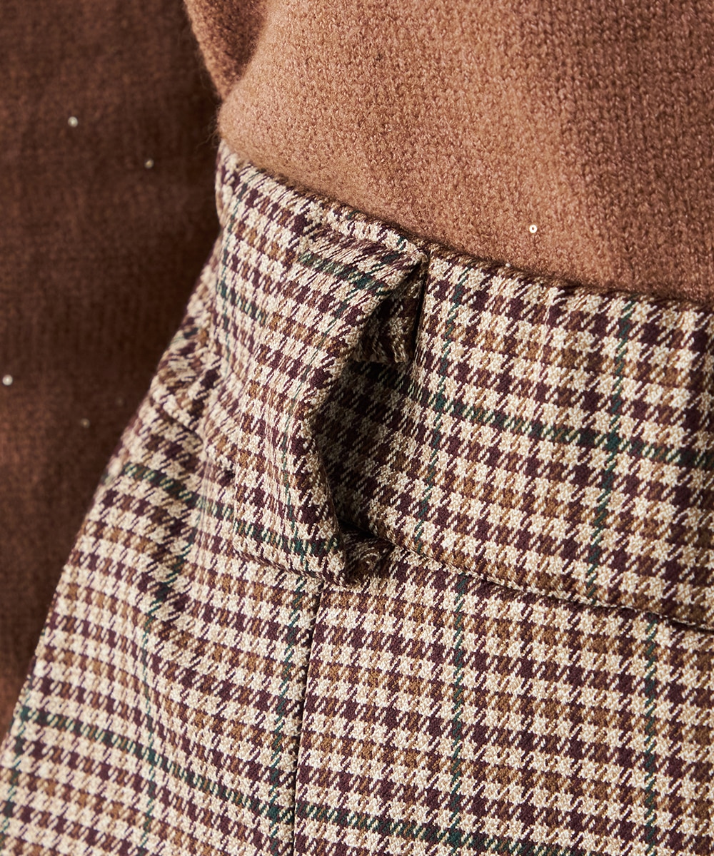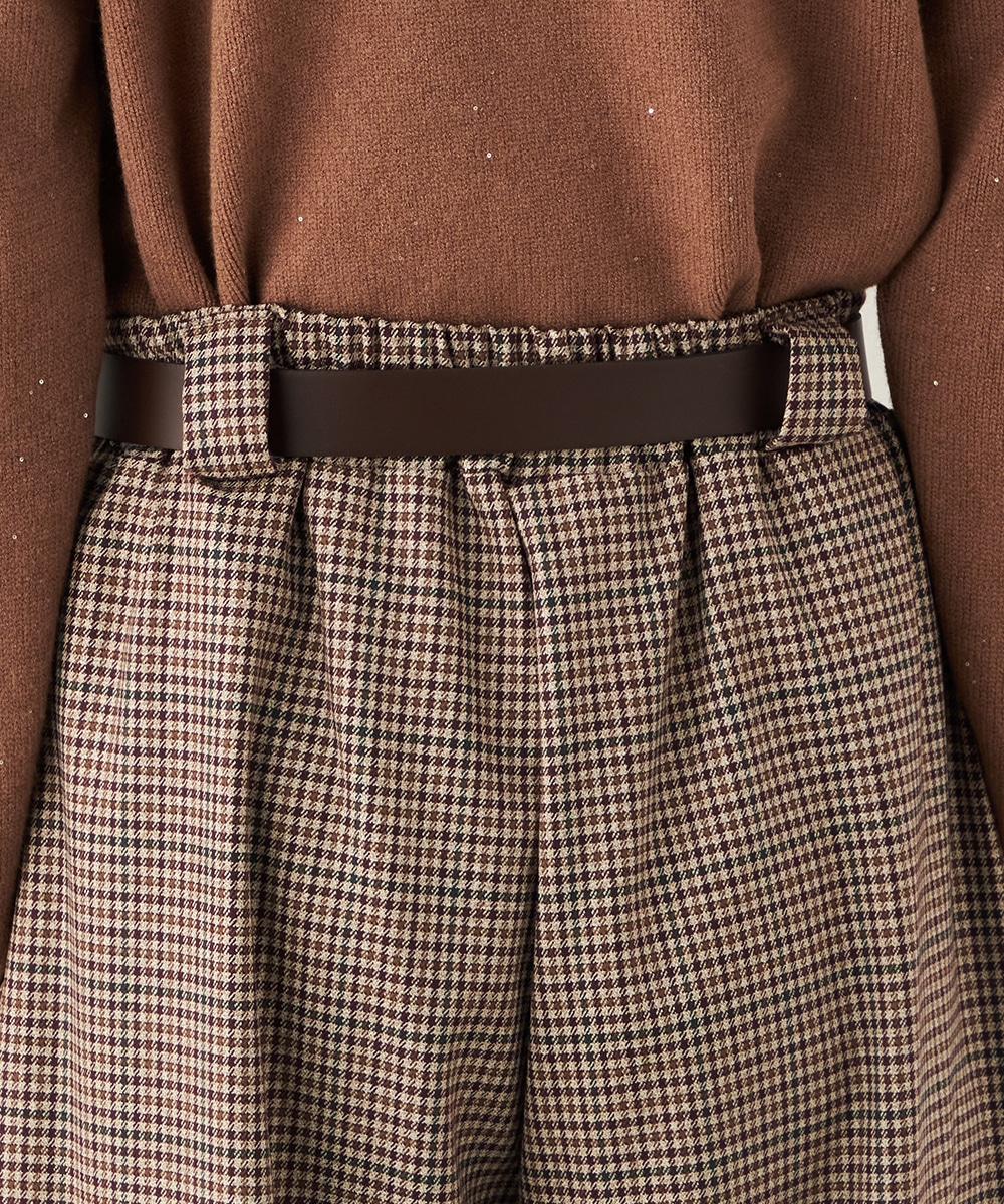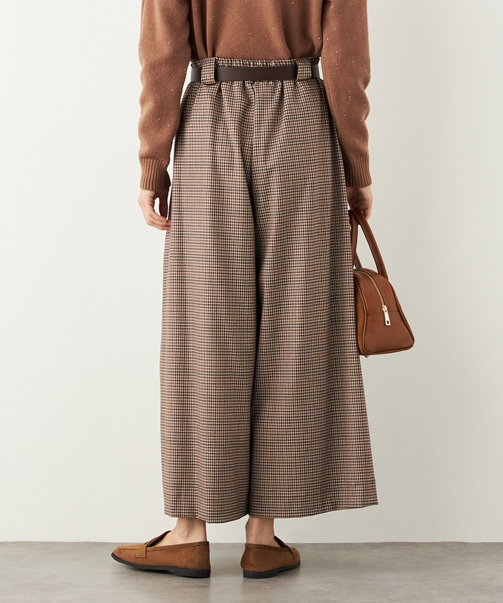 チェック柄のトラディショナルな雰囲気が大人のコーディネートにぴったりな1本。フロントに太めのタックを施して、モード感あふれるワイドなシルエットを作り出しています。ウエストはゴムが入ってフィット感良く着用できます。アレンジの幅が広がるベルト付きです。