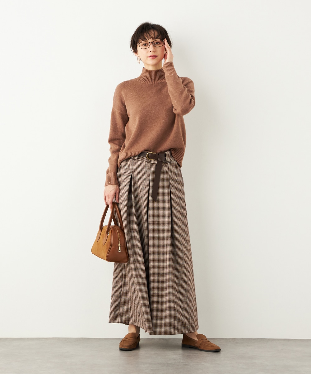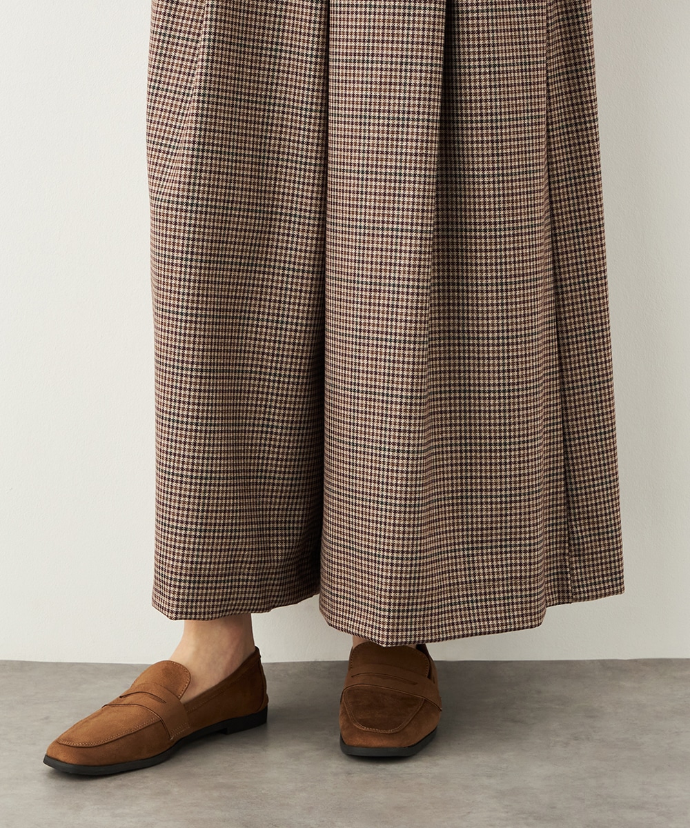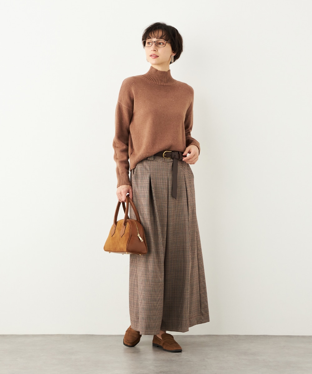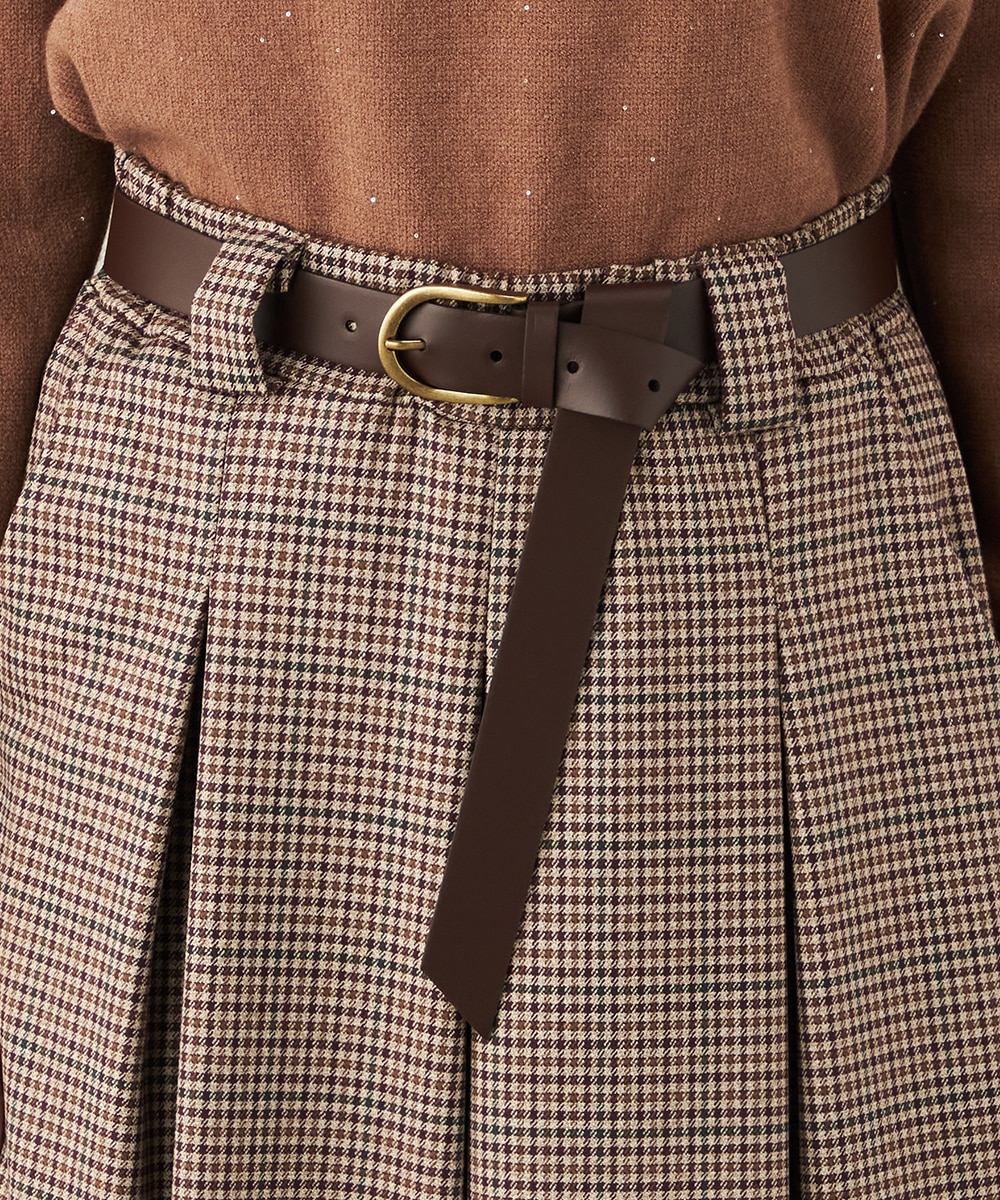 チェック柄のトラディショナルな雰囲気が大人のコーディネートにぴったりな1本。フロントに太めのタックを施して、モード感あふれるワイドなシルエットを作り出しています。ウエストはゴムが入ってフィット感良く着用できます。アレンジの幅が広がるベルト付きです。