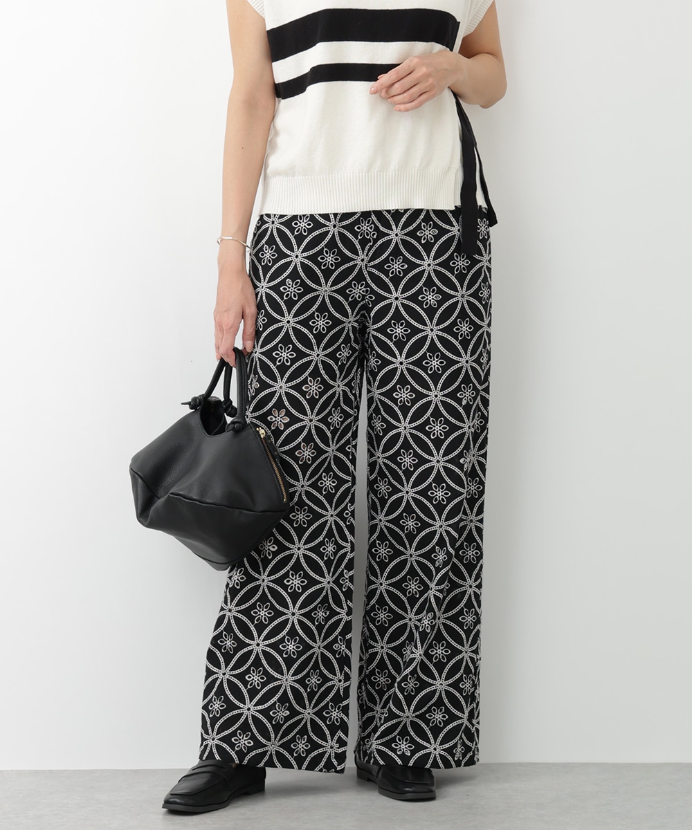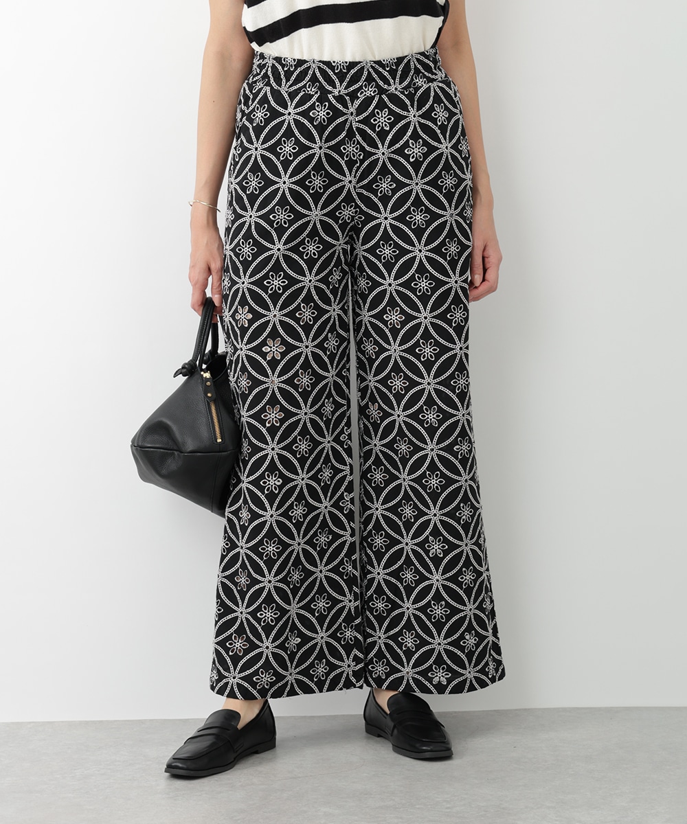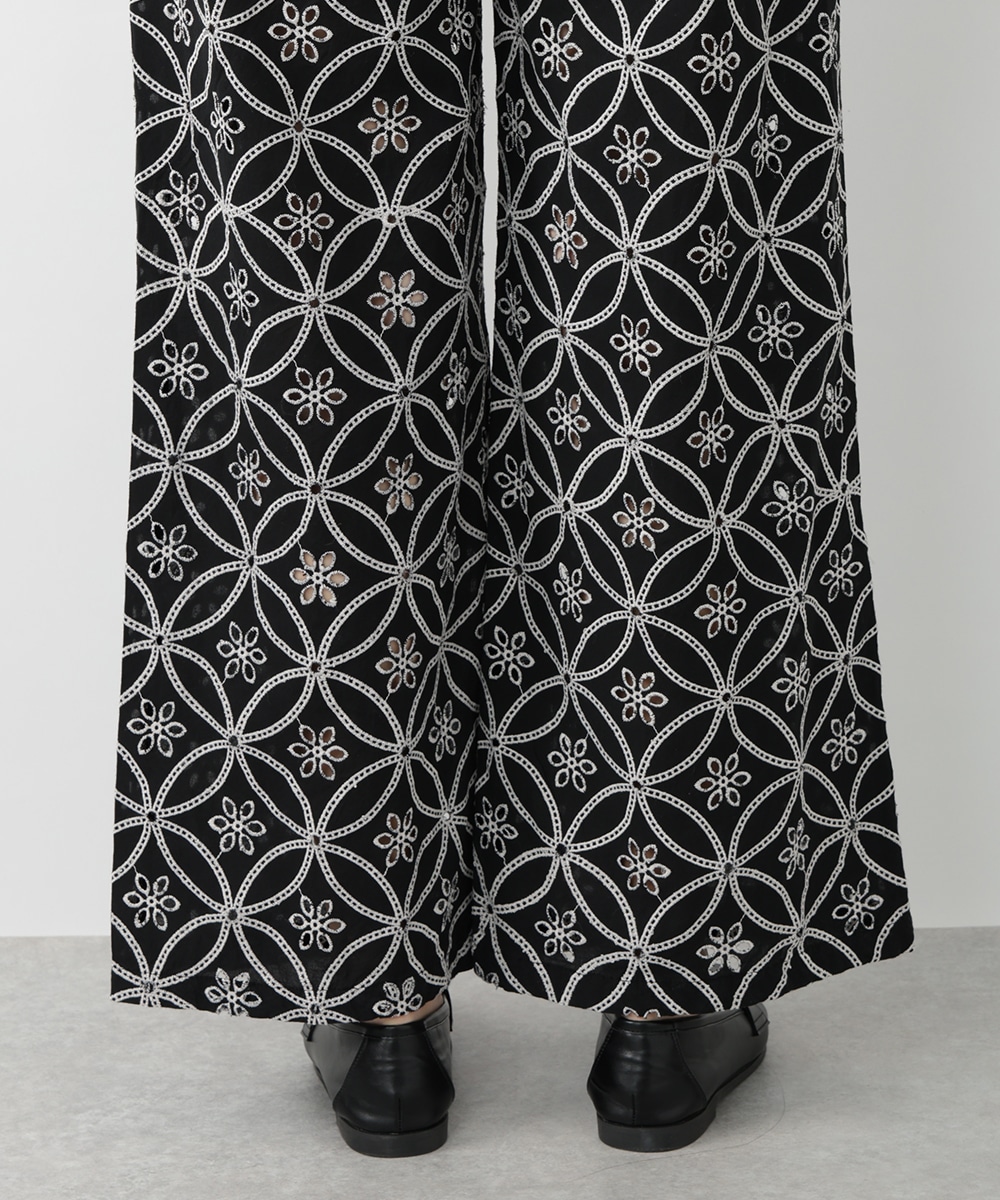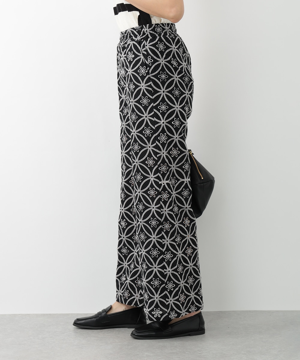 フラワー刺繍が女性らしさを際立たせるワイドパンツ。ゆったりとしたシルエットでありながら上品な着こなしを楽しむことができ、体型カバーも期待できます。さらりとした軽やかな素材がリラックスした着心地を実現。カジュアルやモノトーンコーデまで、幅広く対応するアイテムです。