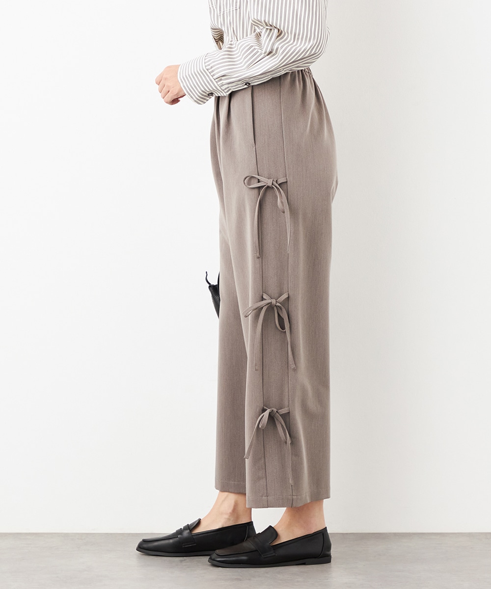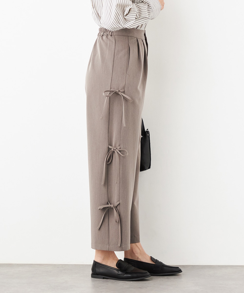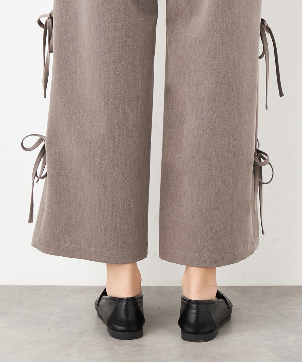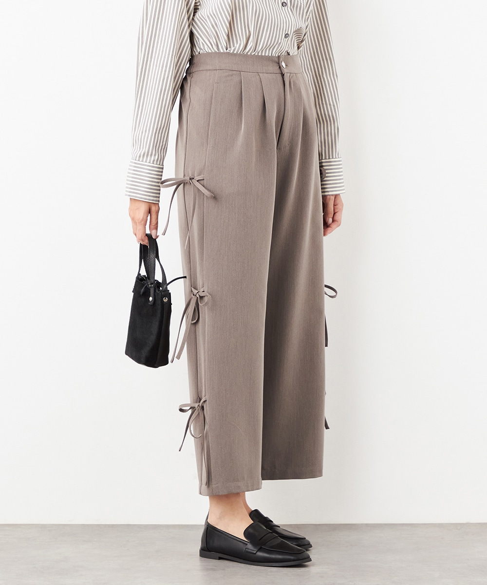 サイドに3つずつ並ぶリボンがポイント。フェミニンにもモードにも着用できるデザインのパンツ。