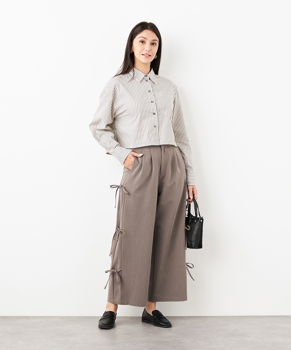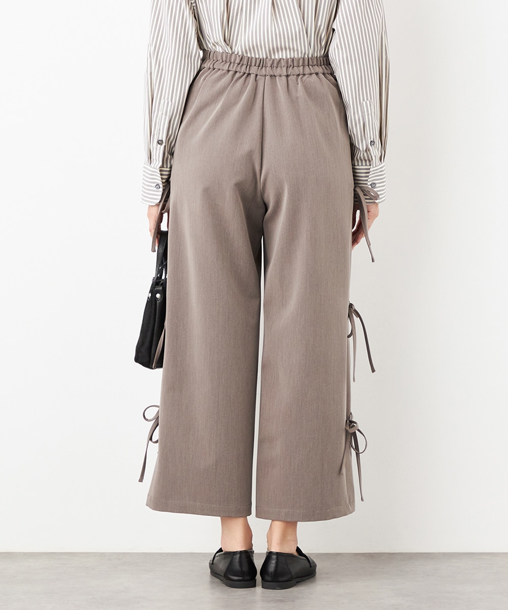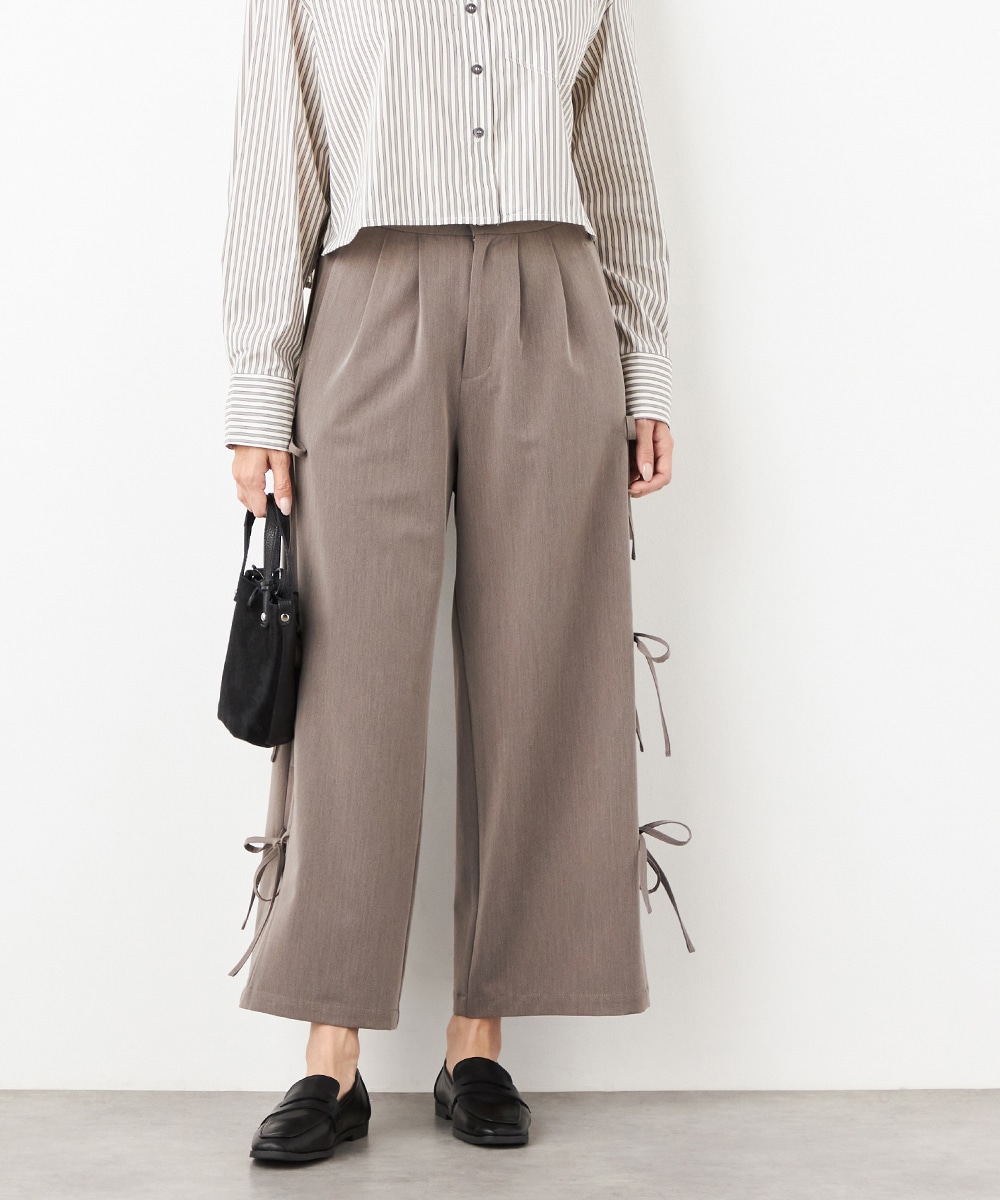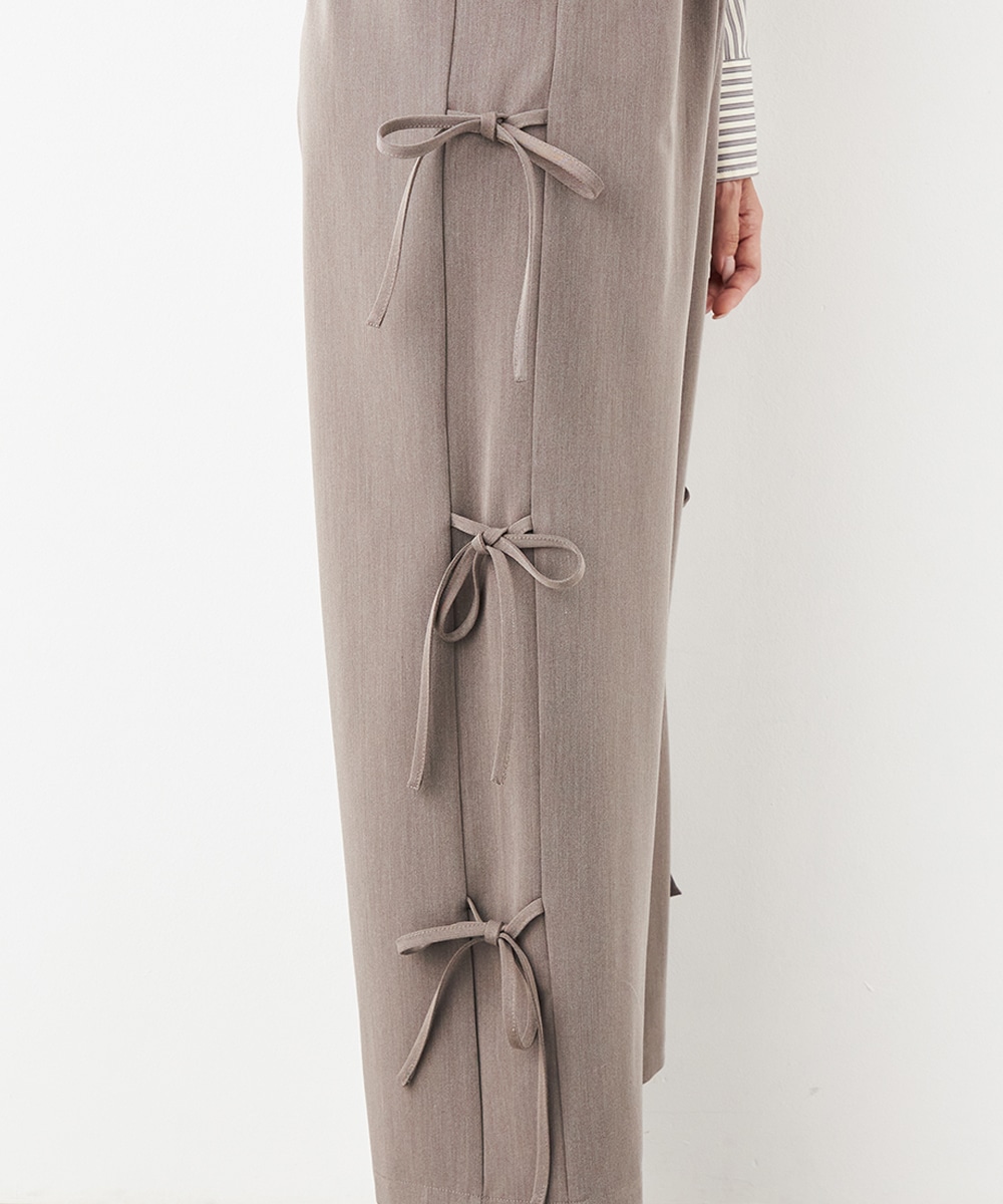 サイドに3つずつ並ぶリボンがポイント。フェミニンにもモードにも着用できるデザインのパンツ。