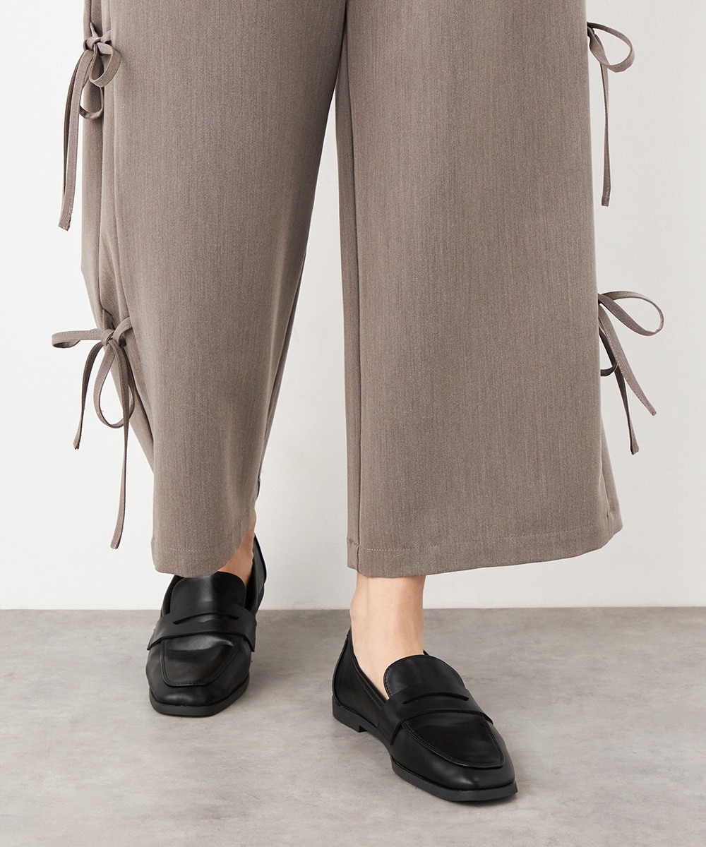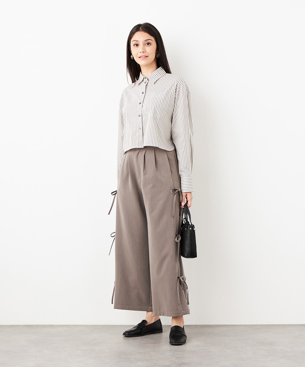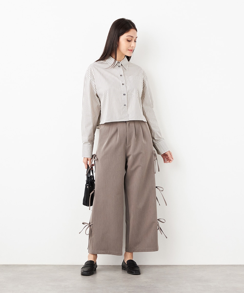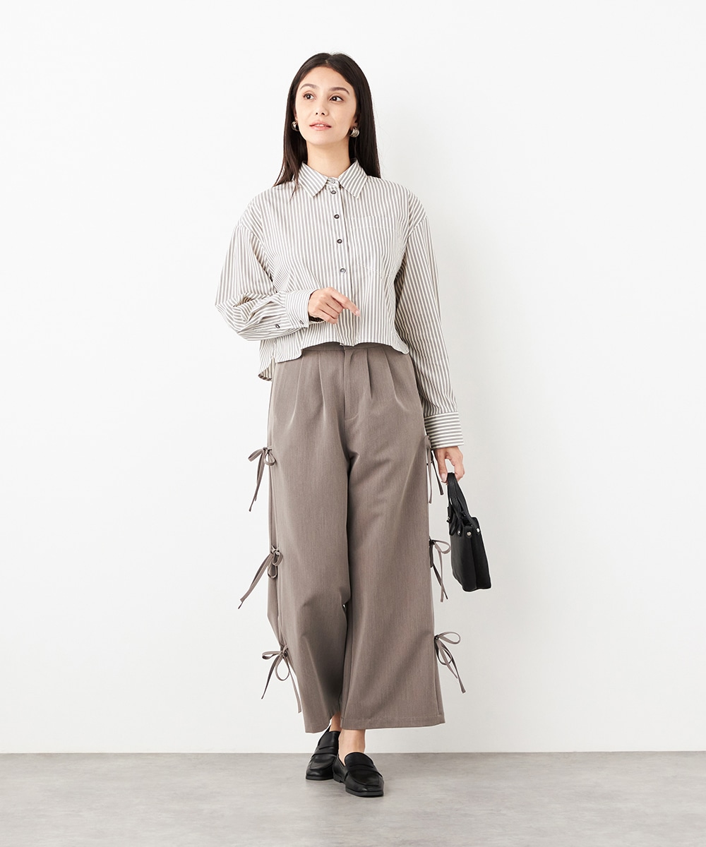 サイドに3つずつ並ぶリボンがポイント。フェミニンにもモードにも着用できるデザインのパンツ。