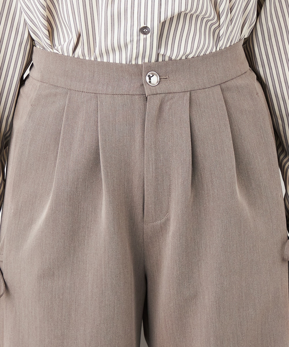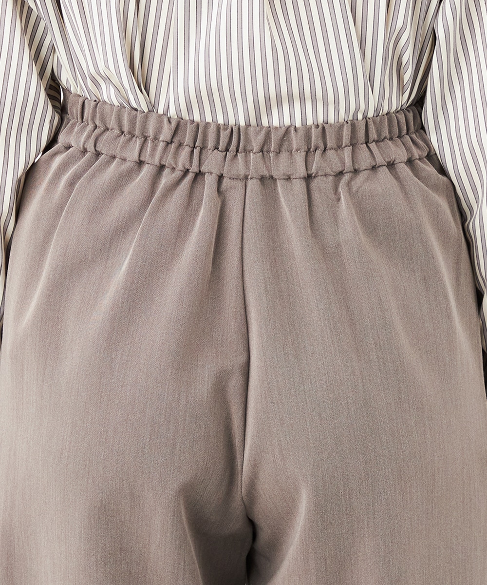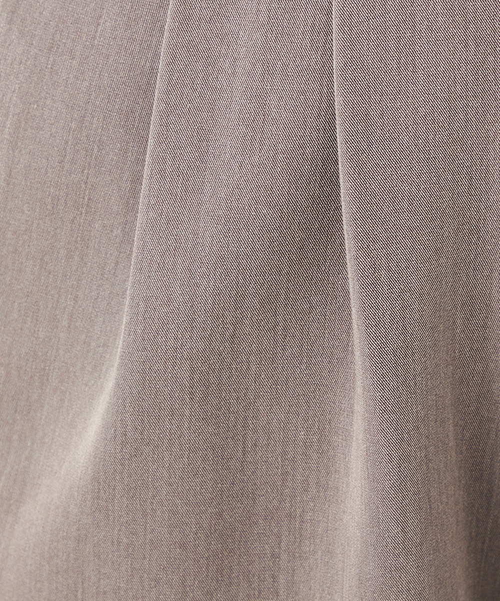 華やかな光沢のあるフロントボタンも印象的です。腰回りにはタックを施して、ほどよいゆとりを持たせています。後ろウエストはゴムが入って快適なフィット感。さらっとして落ち感のある生地を使用しており、裾が広がりすぎないのも特徴です。スマートフォンなどの小物の収納に便利なサイドポケットを備えています。
