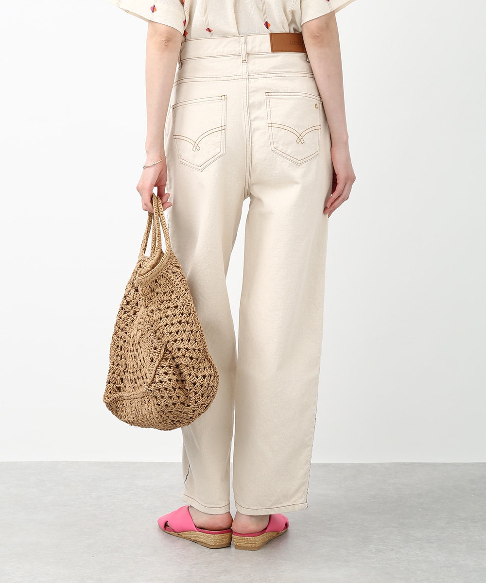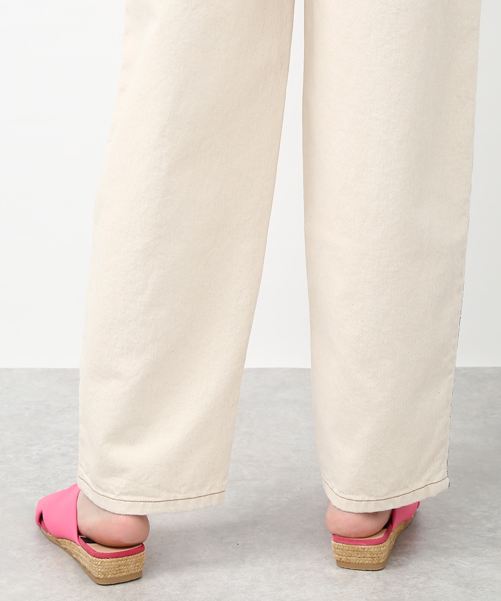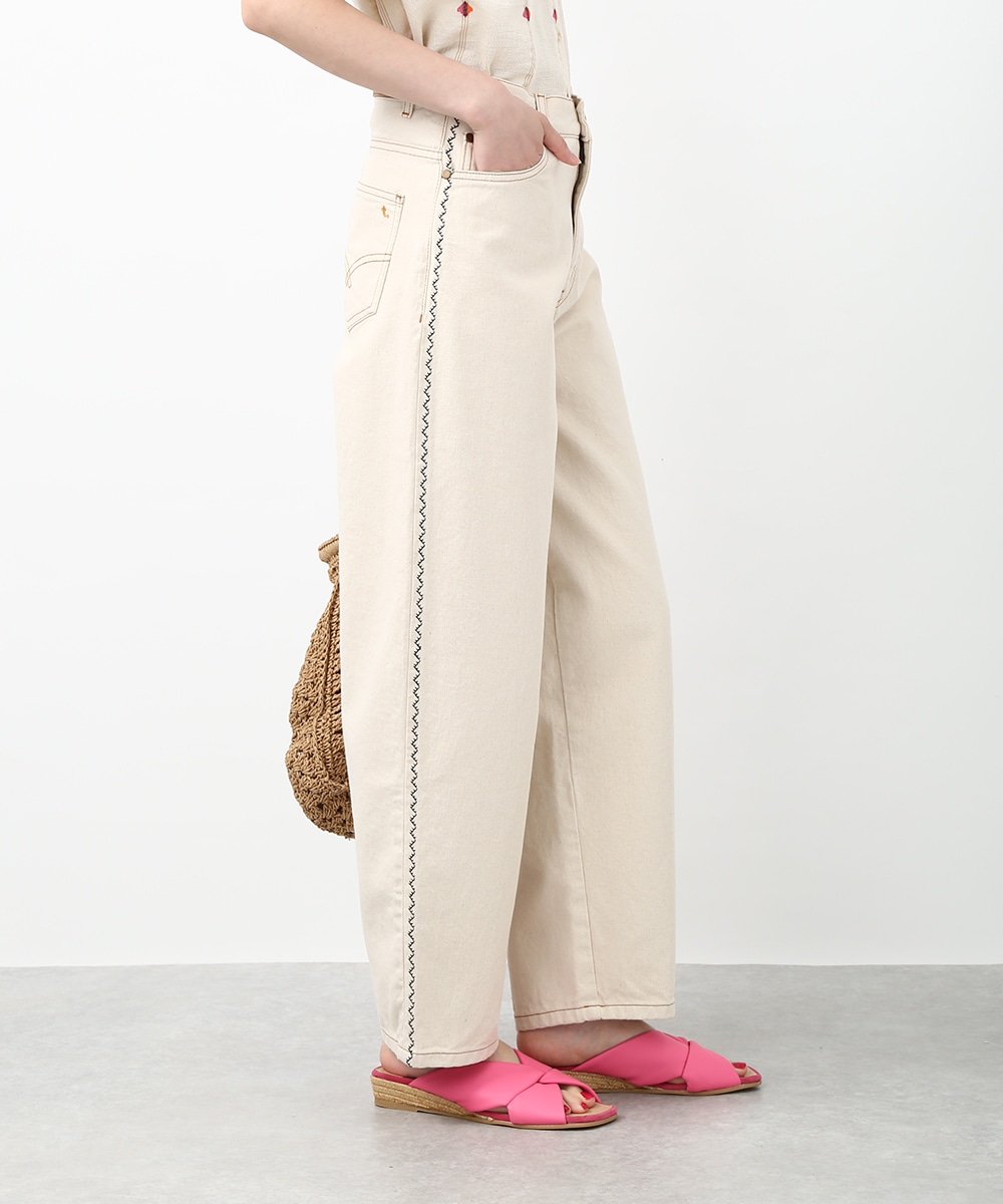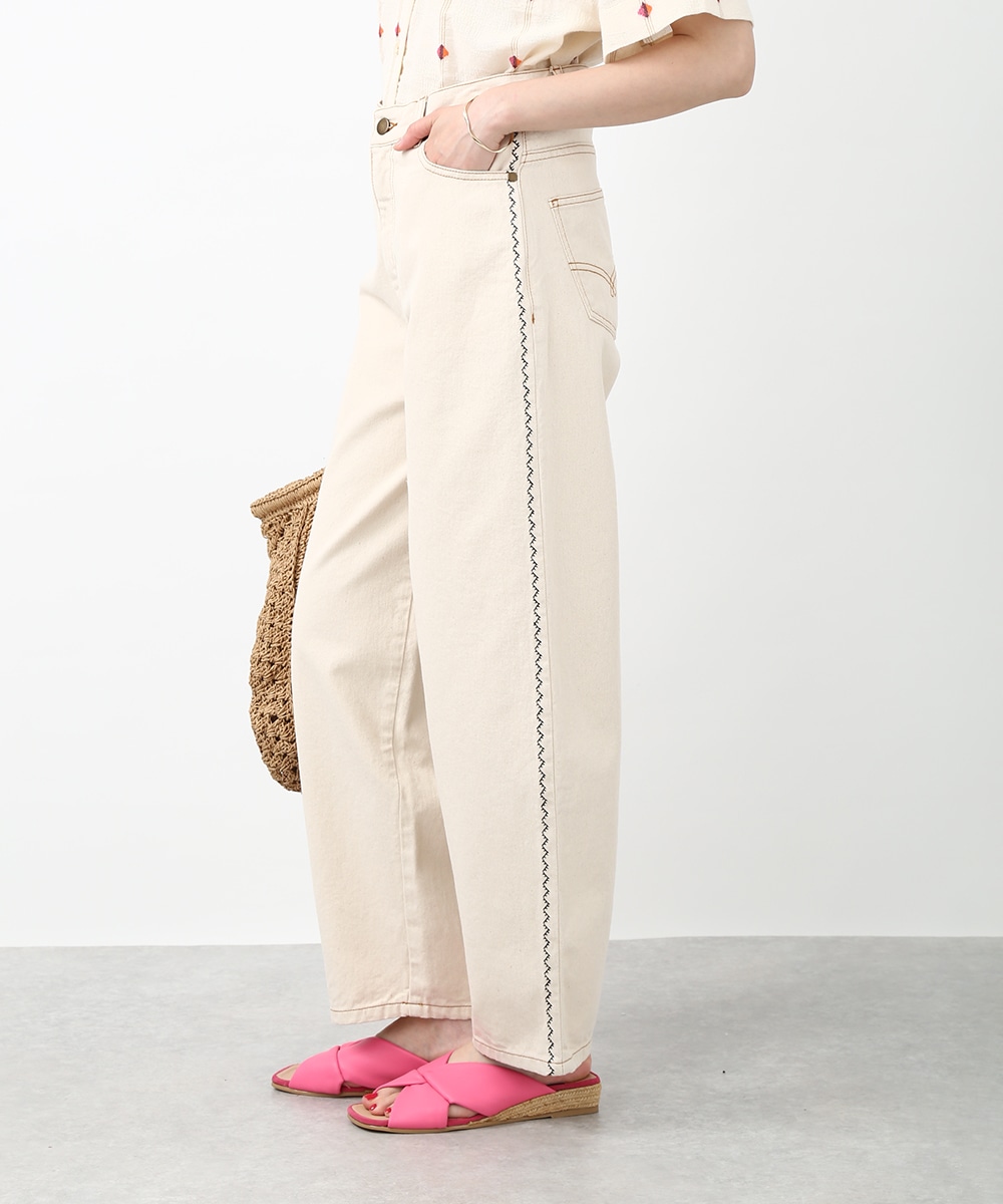 トレンド感のあるカーブシルエットが特徴のパンツ。ゆるやかに丸みを持たせたラインで、穿くだけでこなれた印象に仕上がります。サイドの配色ステッチがさりげないアクセントに。同素材のジャケットを羽織ってセットアップ風にまとめることで、フレンチカジュアルスタイルを楽しめます。