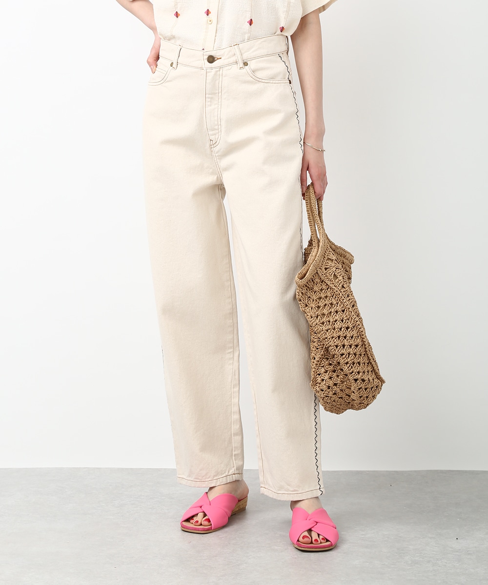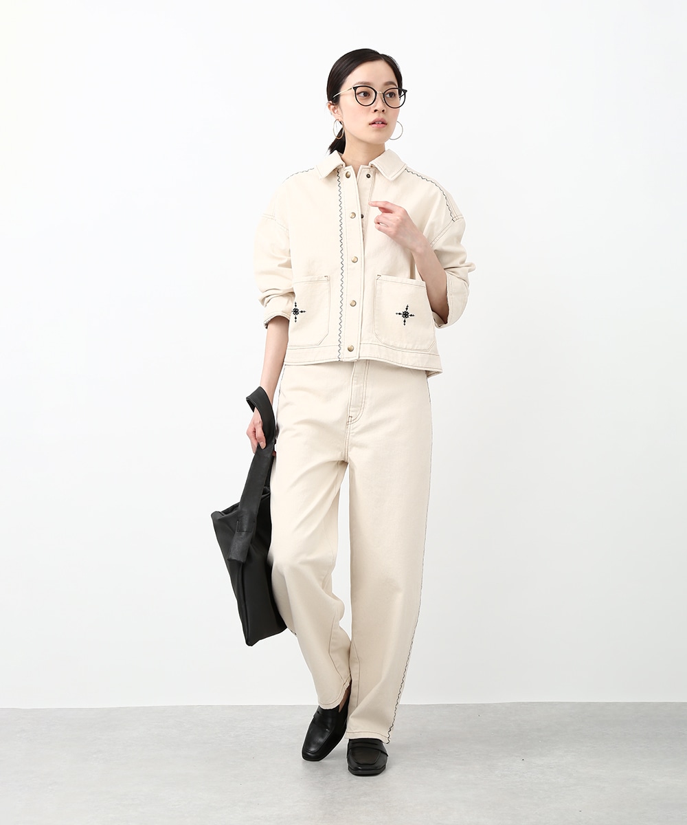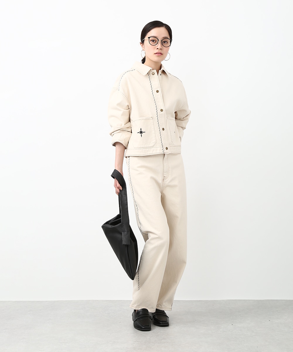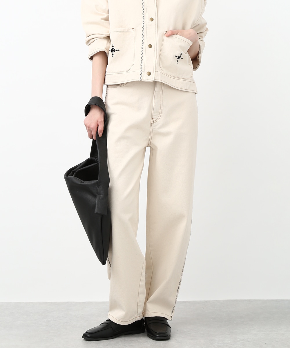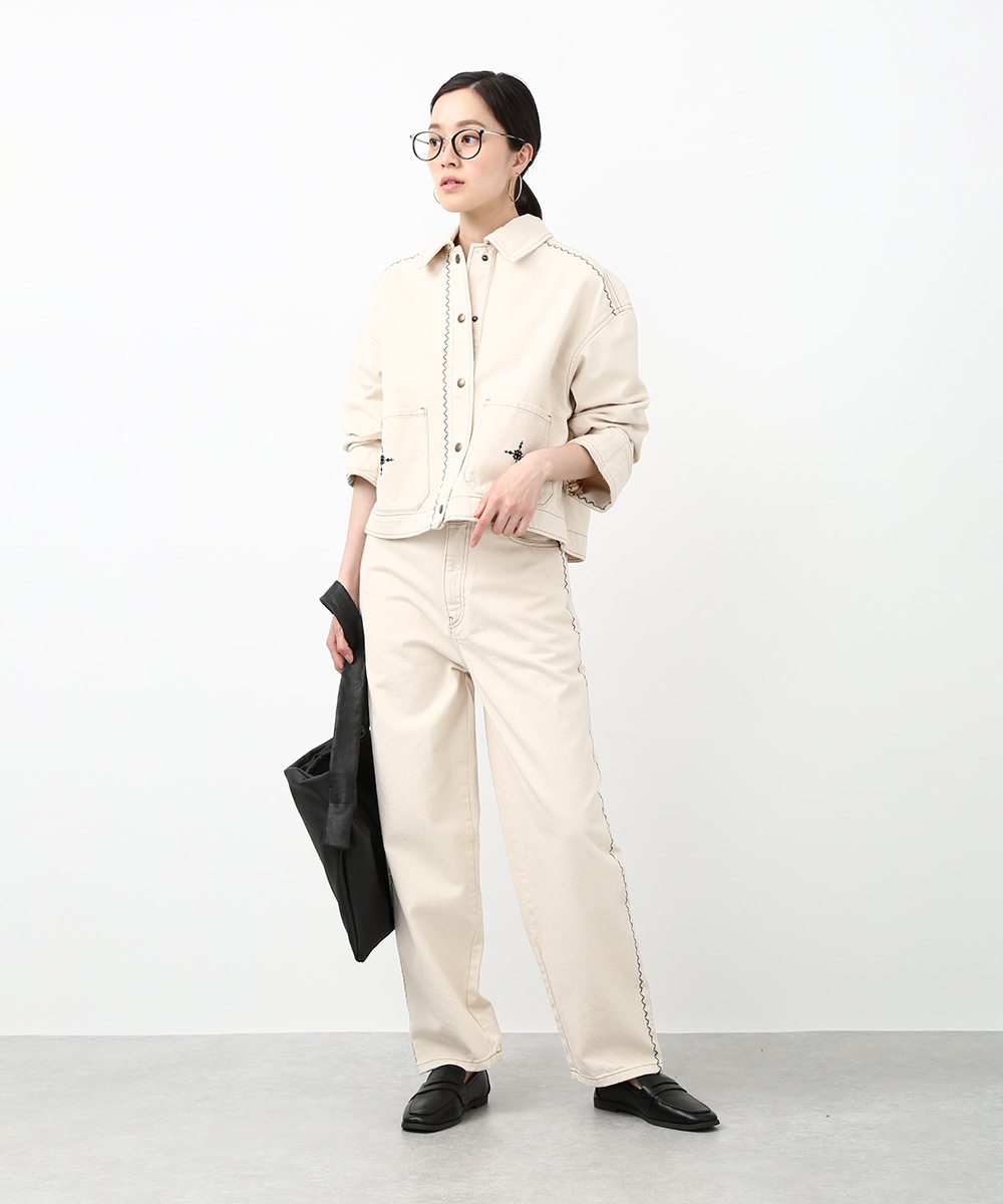 トレンド感のあるカーブシルエットが特徴のパンツ。ゆるやかに丸みを持たせたラインで、穿くだけでこなれた印象に仕上がります。サイドの配色ステッチがさりげないアクセントに。同素材のジャケットを羽織ってセットアップ風にまとめることで、フレンチカジュアルスタイルを楽しめます。