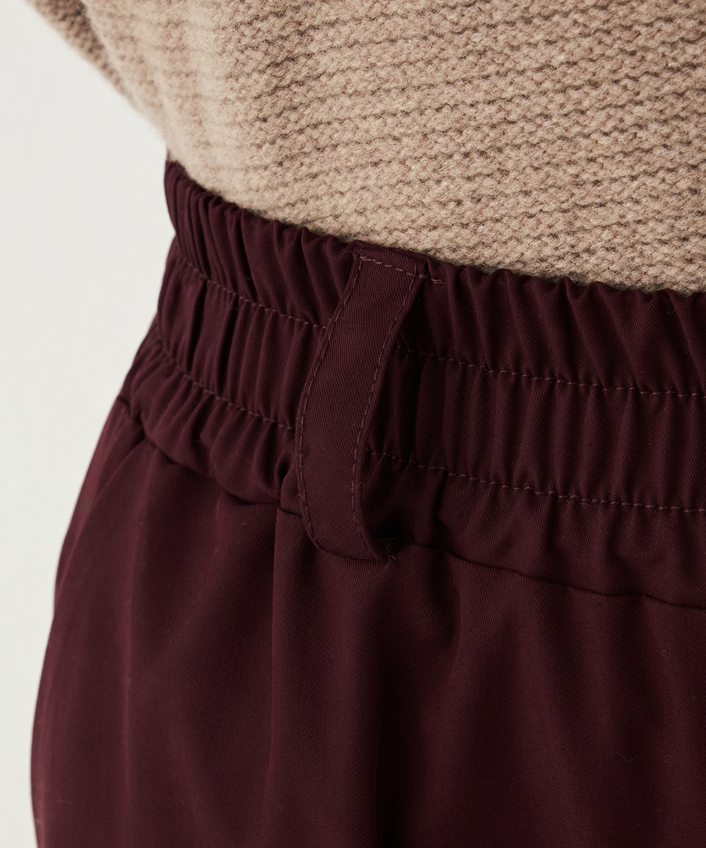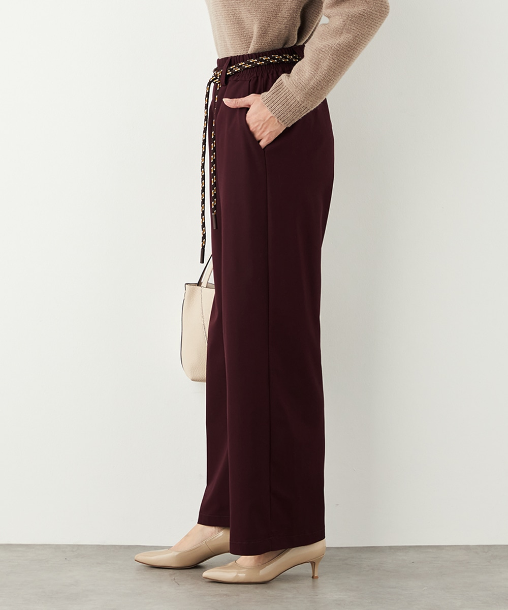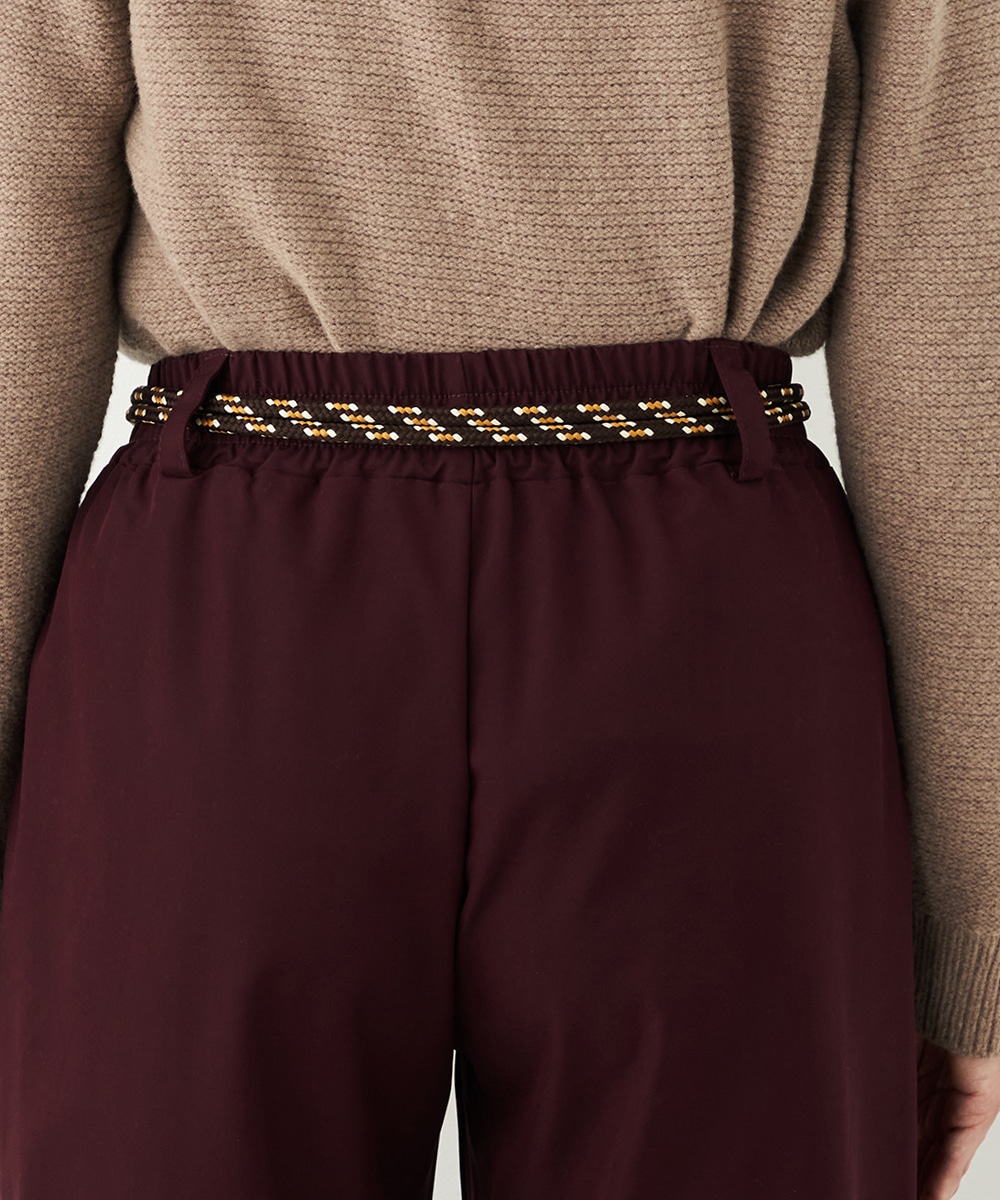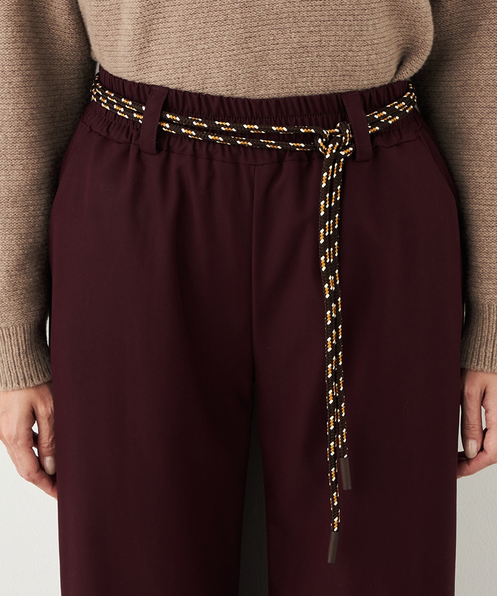 ウエストはフィット感が快適でリラックスできる穿き心地の総ゴム仕様です。キレイ目感のある素材を使用しており、大人のコーディネートを演出できます。ソフトな風合いの揺れ感も魅力です。付属のコードベルトはスポーティ感をプラスするワンポイントとしても働きます。