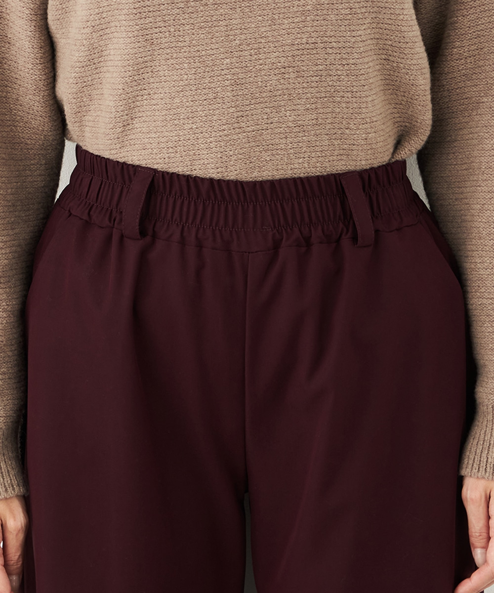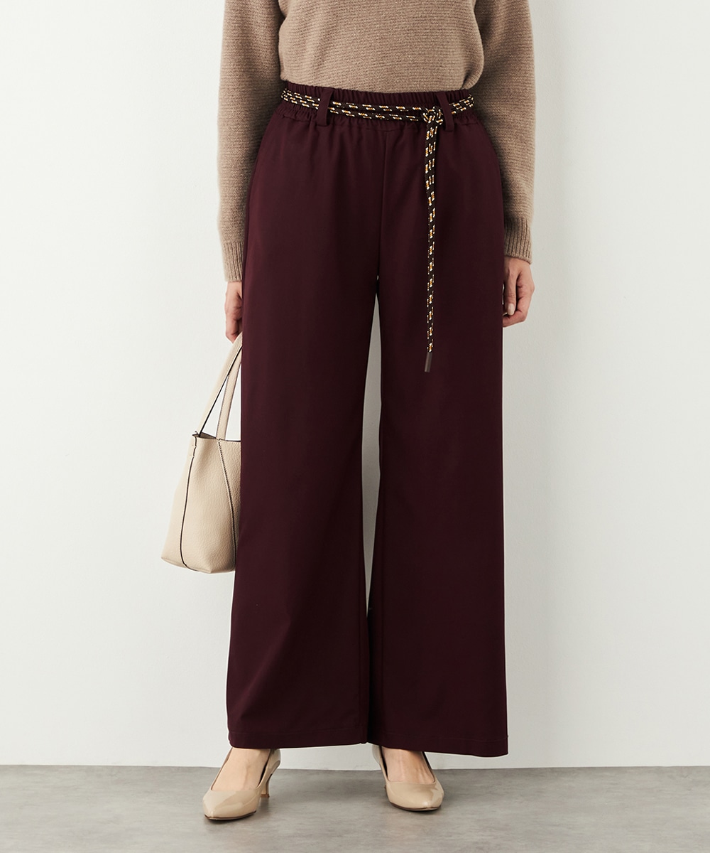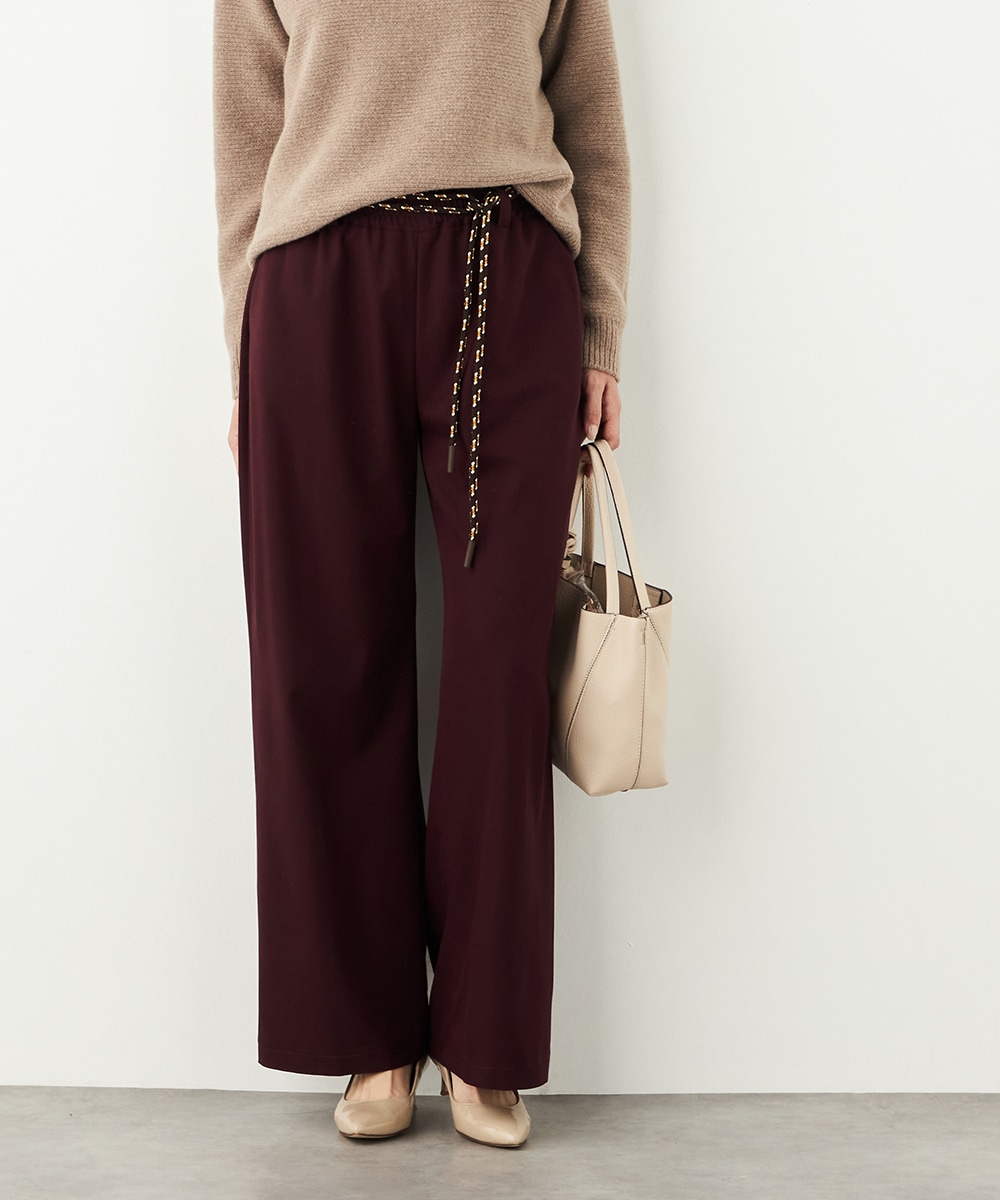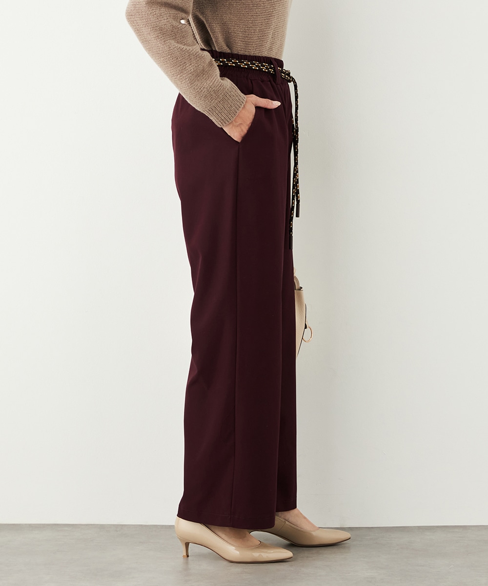 ウエストはフィット感が快適でリラックスできる穿き心地の総ゴム仕様です。キレイ目感のある素材を使用しており、大人のコーディネートを演出できます。ソフトな風合いの揺れ感も魅力です。付属のコードベルトはスポーティ感をプラスするワンポイントとしても働きます。