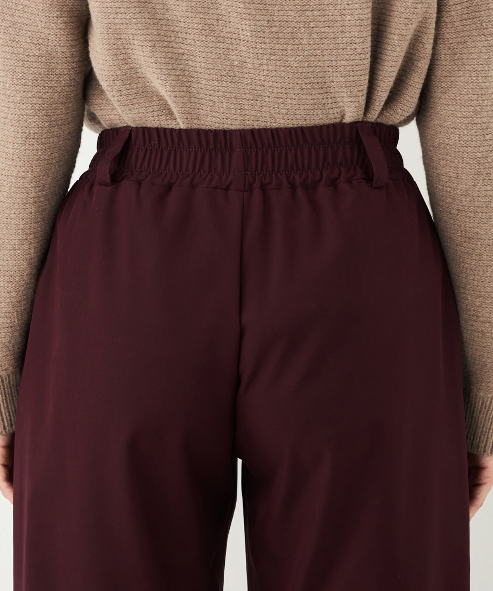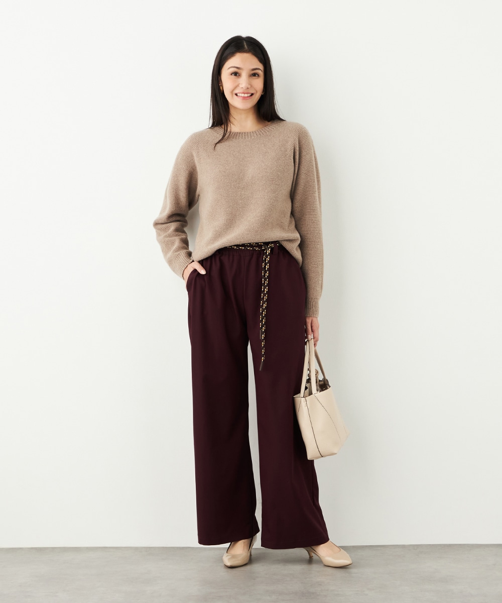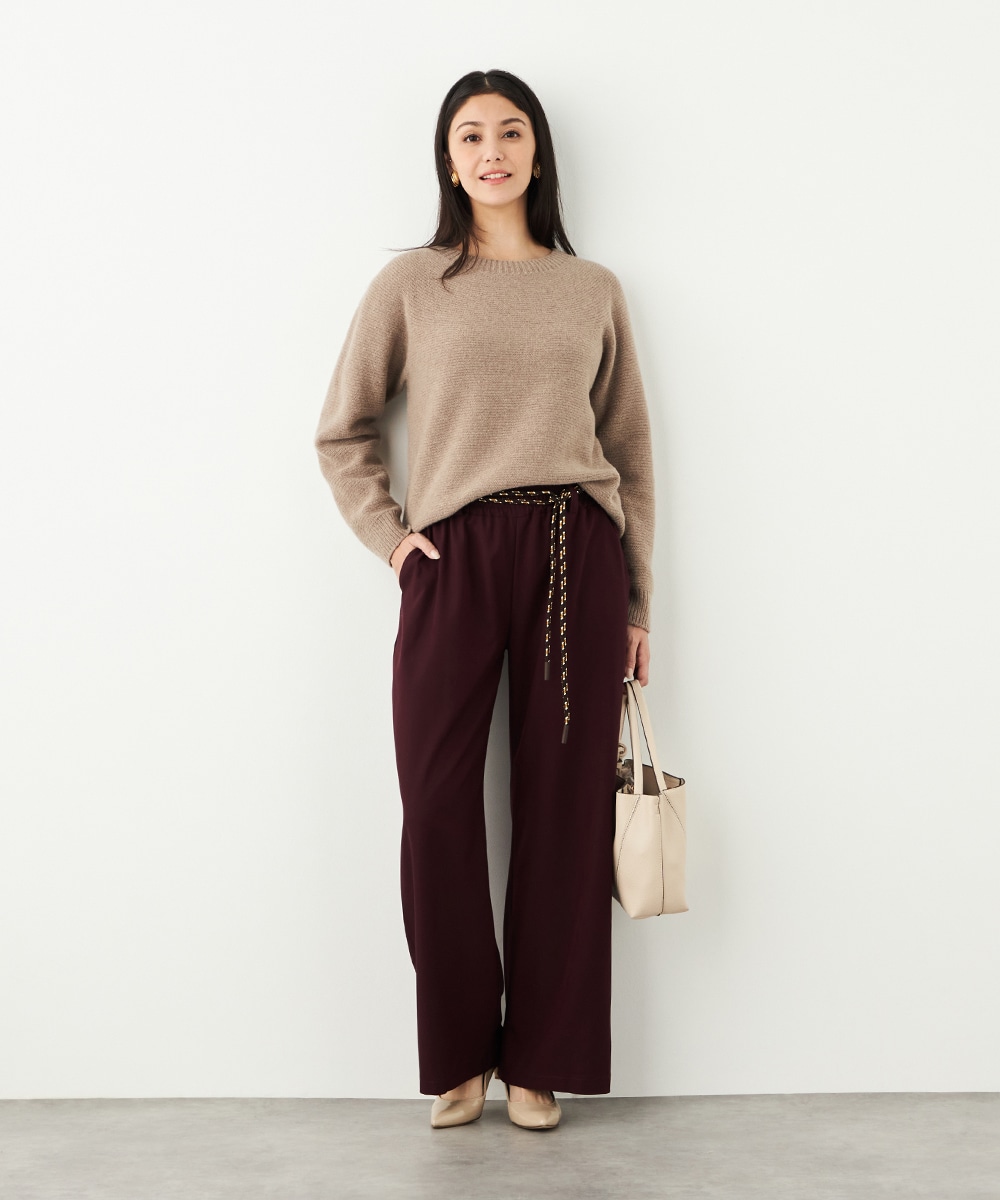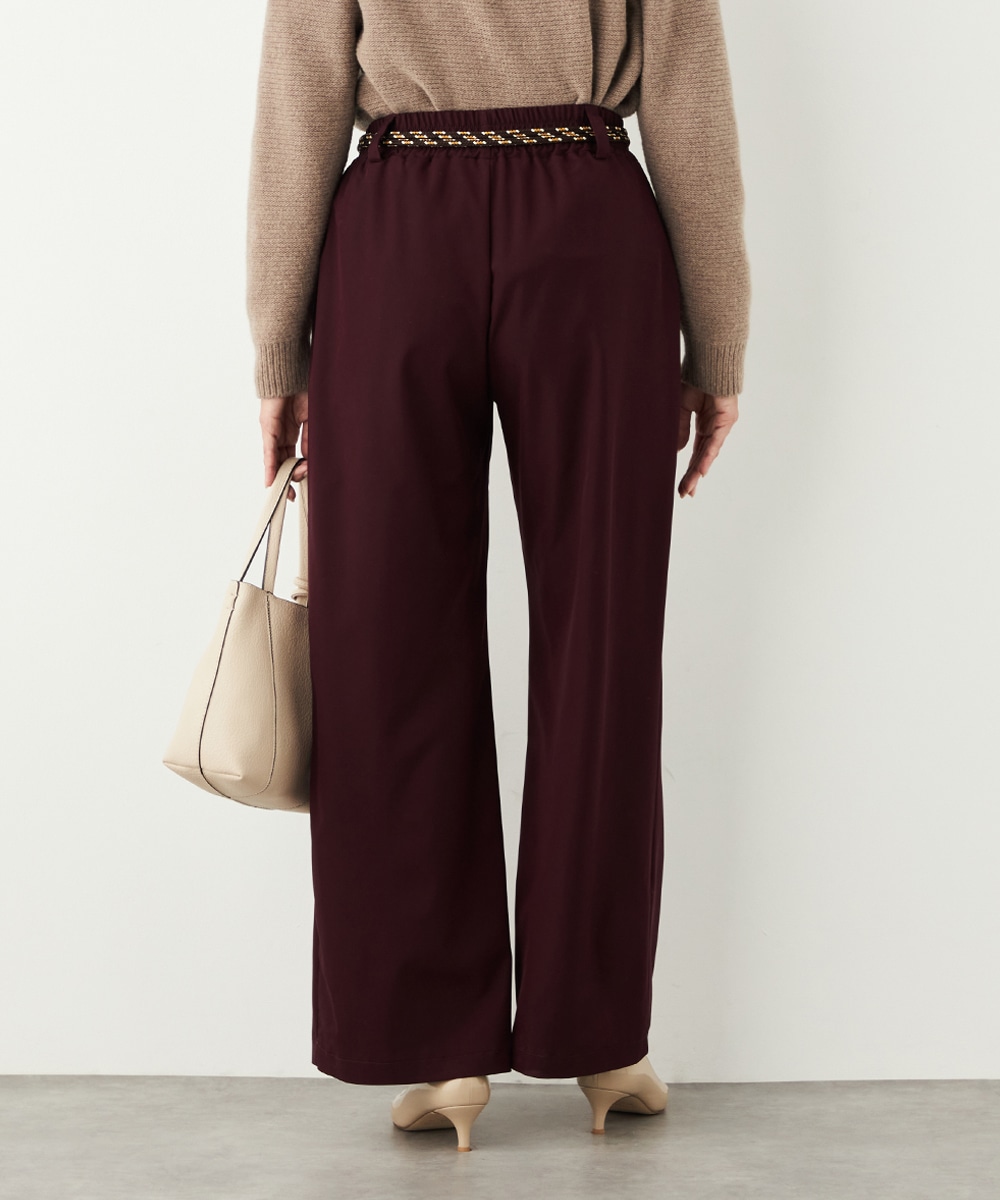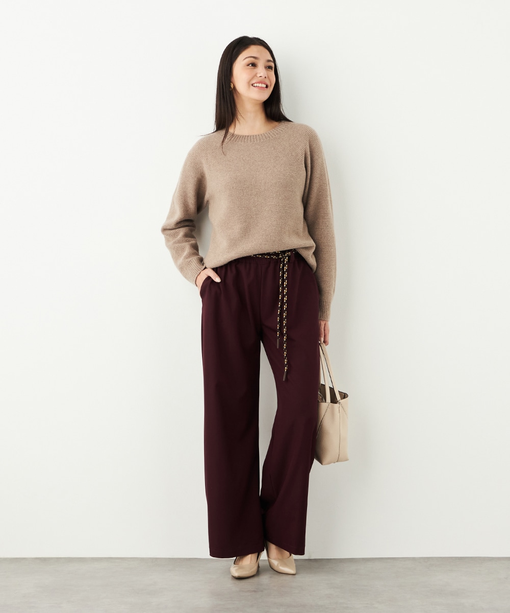 ウエストはフィット感が快適でリラックスできる穿き心地の総ゴム仕様です。キレイ目感のある素材を使用しており、大人のコーディネートを演出できます。ソフトな風合いの揺れ感も魅力です。付属のコードベルトはスポーティ感をプラスするワンポイントとしても働きます。