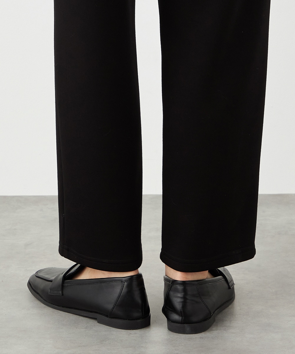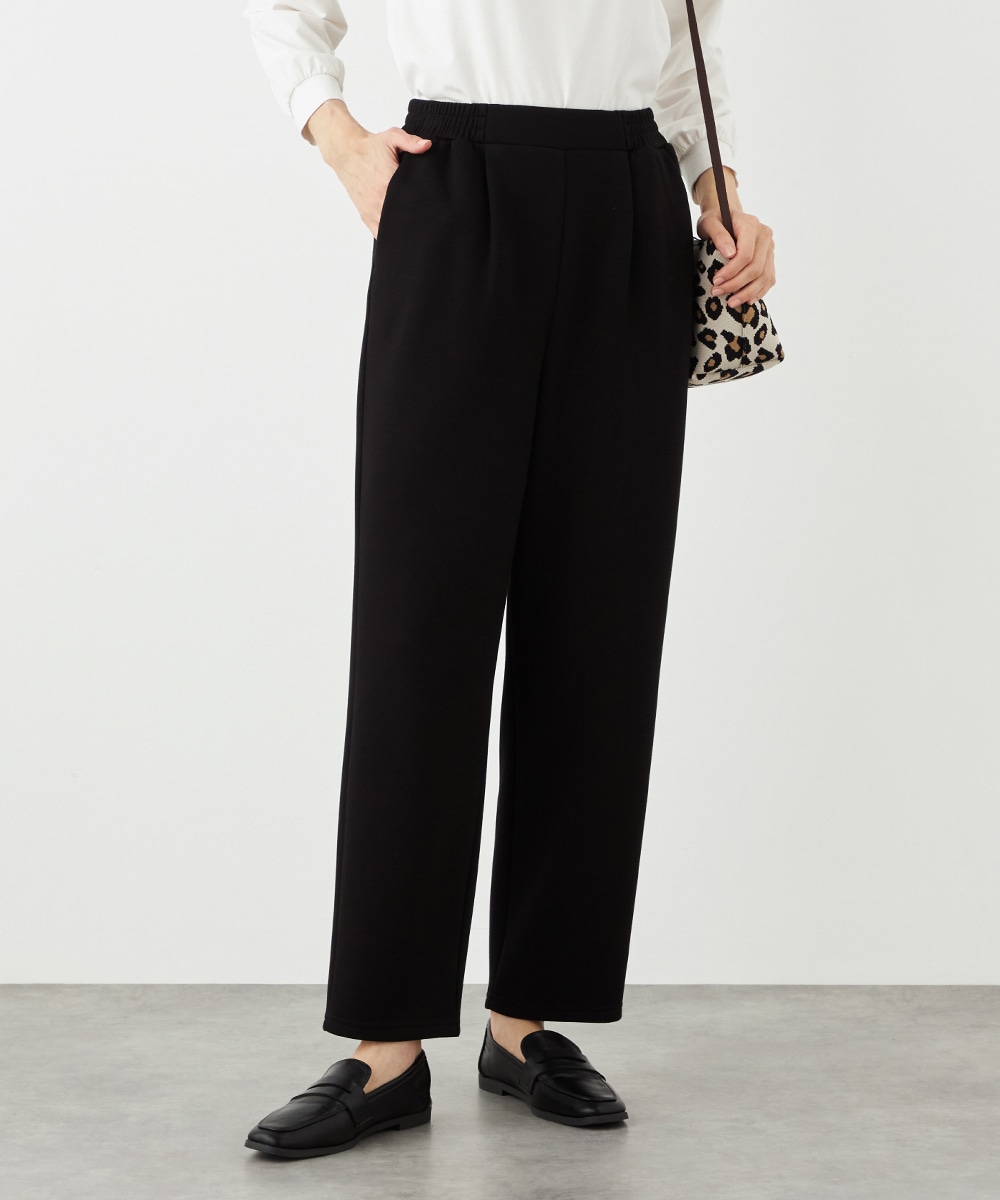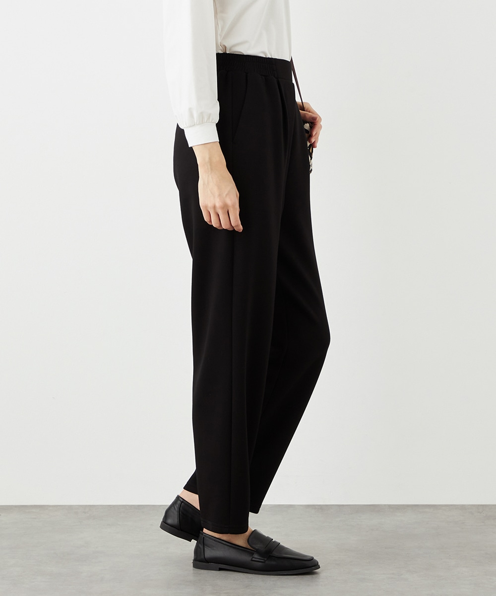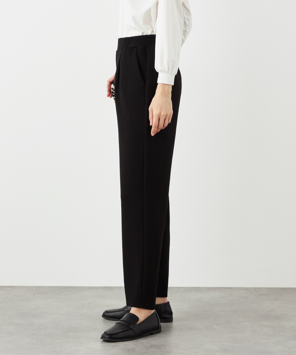 デザインはごくシンプルにまとまり、幅広く活用できます。ストレッチが効いて動きやすく、普段使いにもぴったりです。ウエストは両サイドからバックにかけてゴム仕様で、フィット感良く着用できます。チュニック丈のニットと合わせるのがおすすめのコーディネートです。