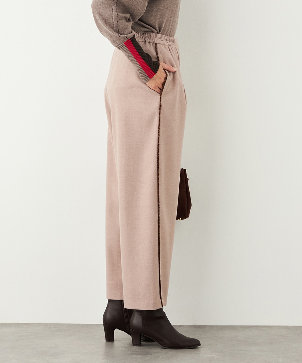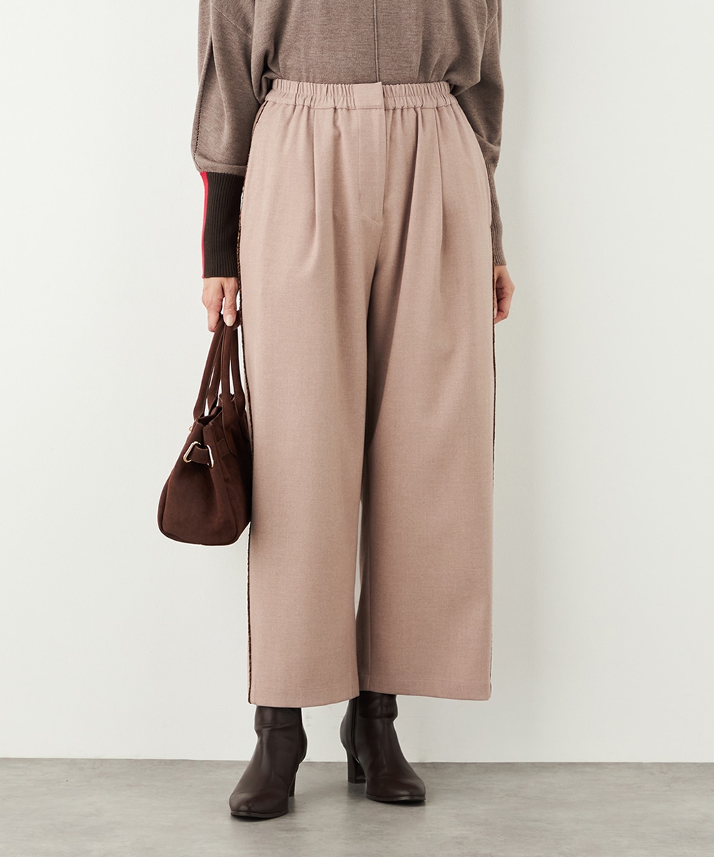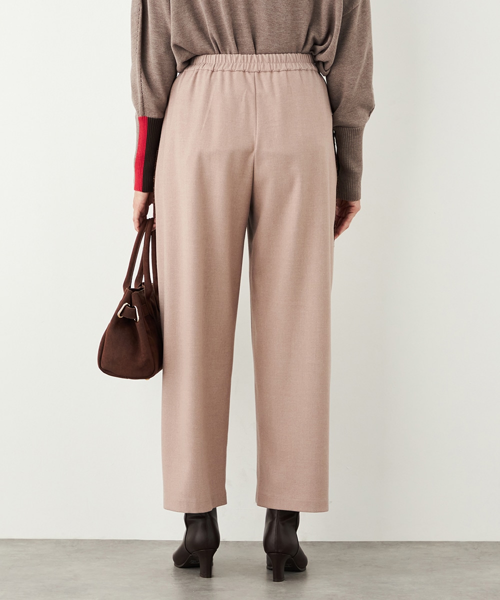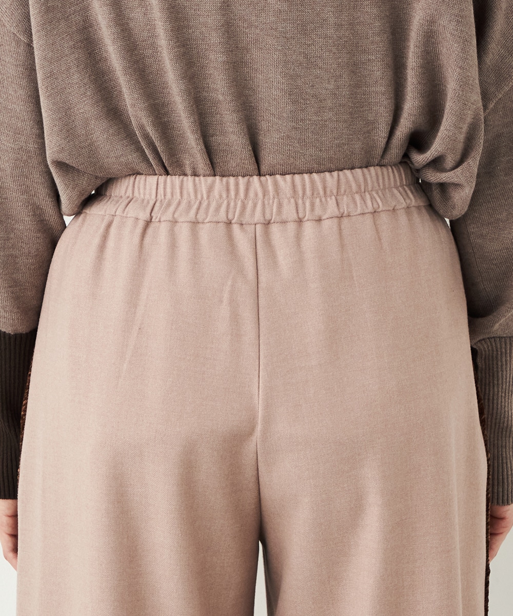 ほどよいワイドシルエットがモード感を演出します。しなやかな風合いによる揺れ感やドレープがエレガンスをプラスするポイントです。ウエストにはゴムが入り、フィット感良く着用できます。きれいな色味のニットトップスと合わせるのがおすすめのコーディネートです。