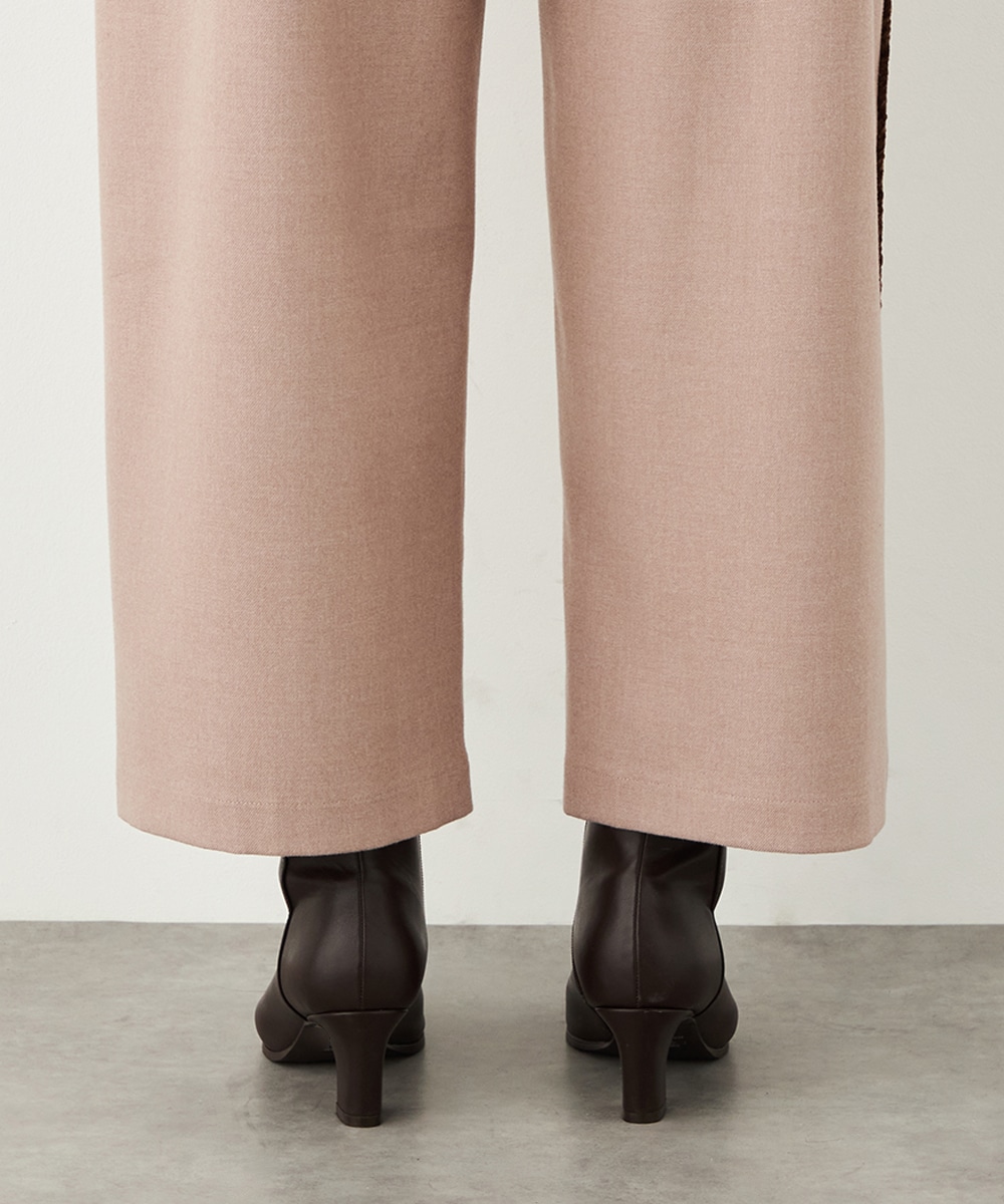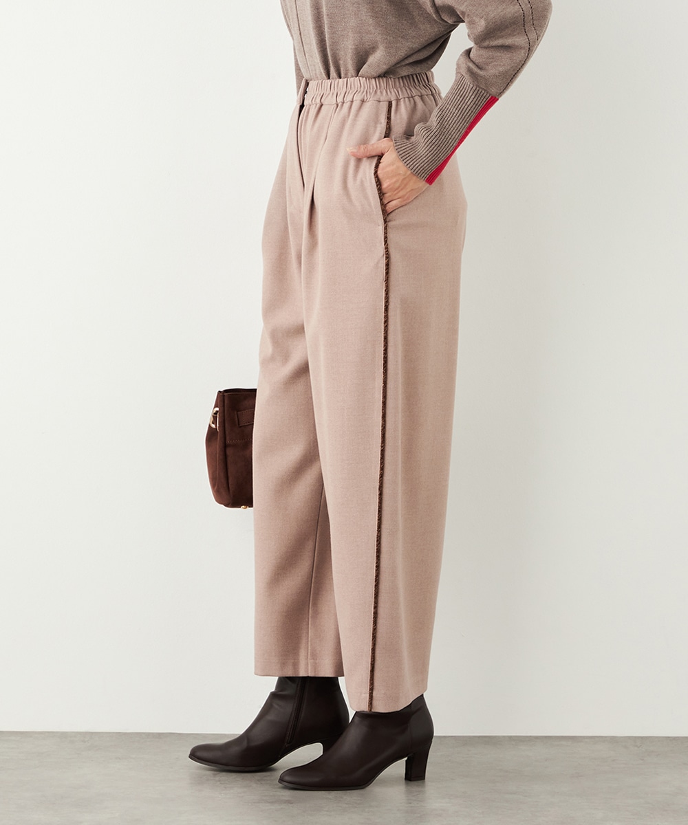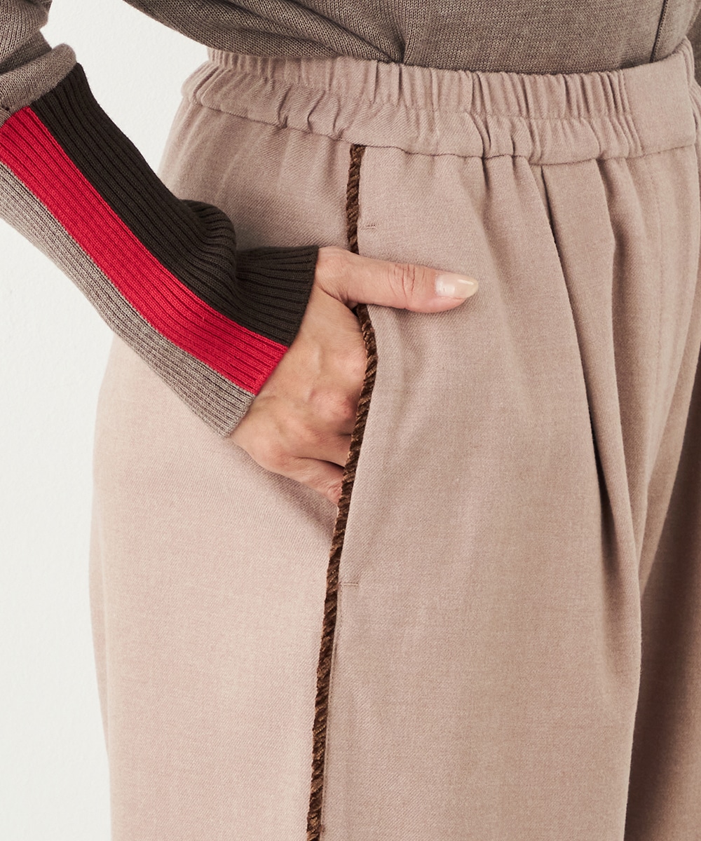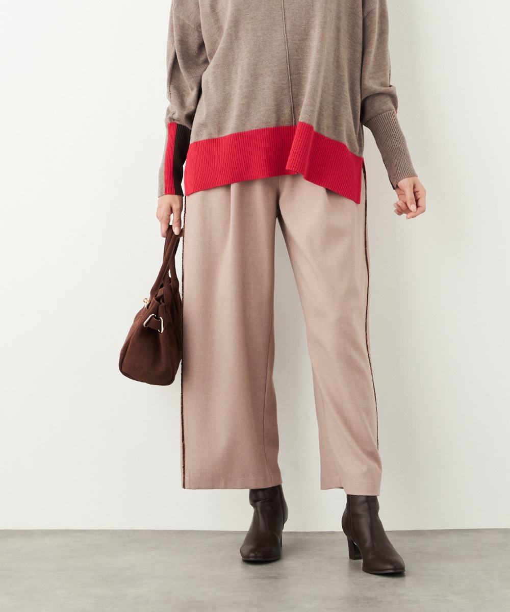 ほどよいワイドシルエットがモード感を演出します。しなやかな風合いによる揺れ感やドレープがエレガンスをプラスするポイントです。ウエストにはゴムが入り、フィット感良く着用できます。きれいな色味のニットトップスと合わせるのがおすすめのコーディネートです。