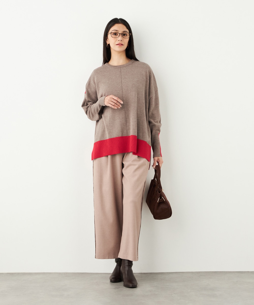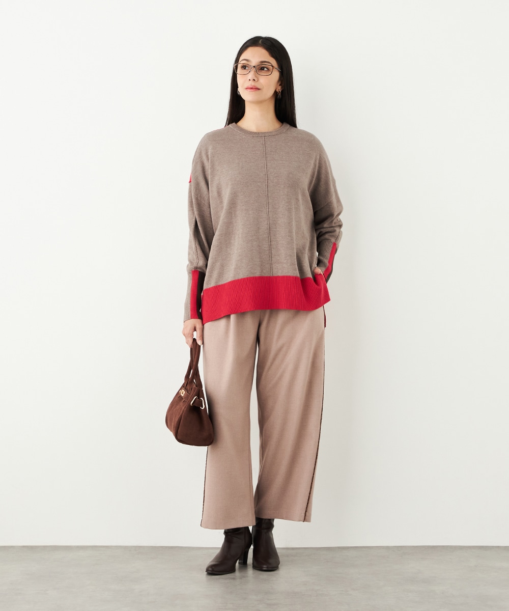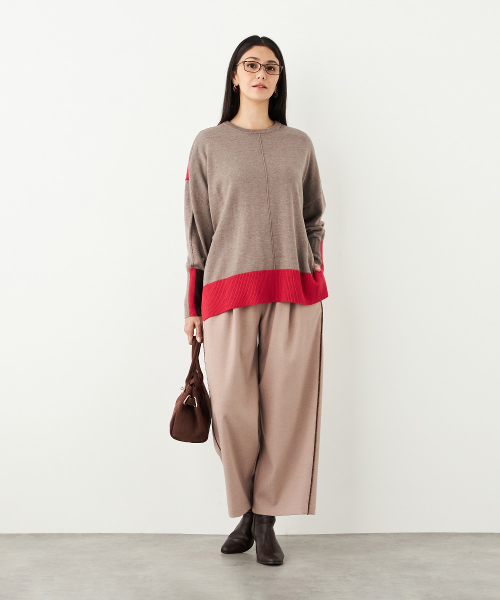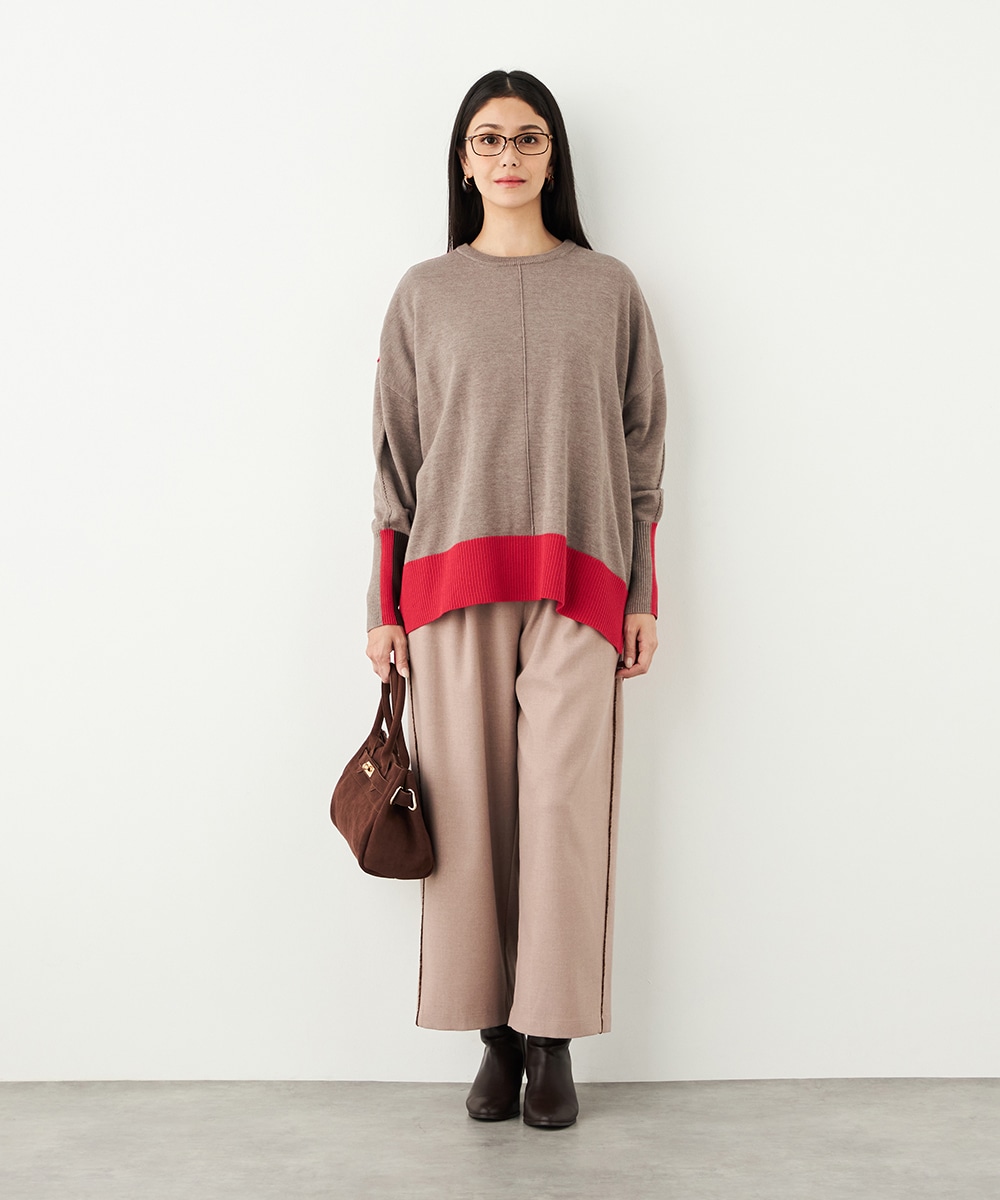 ほどよいワイドシルエットがモード感を演出します。しなやかな風合いによる揺れ感やドレープがエレガンスをプラスするポイントです。ウエストにはゴムが入り、フィット感良く着用できます。きれいな色味のニットトップスと合わせるのがおすすめのコーディネートです。