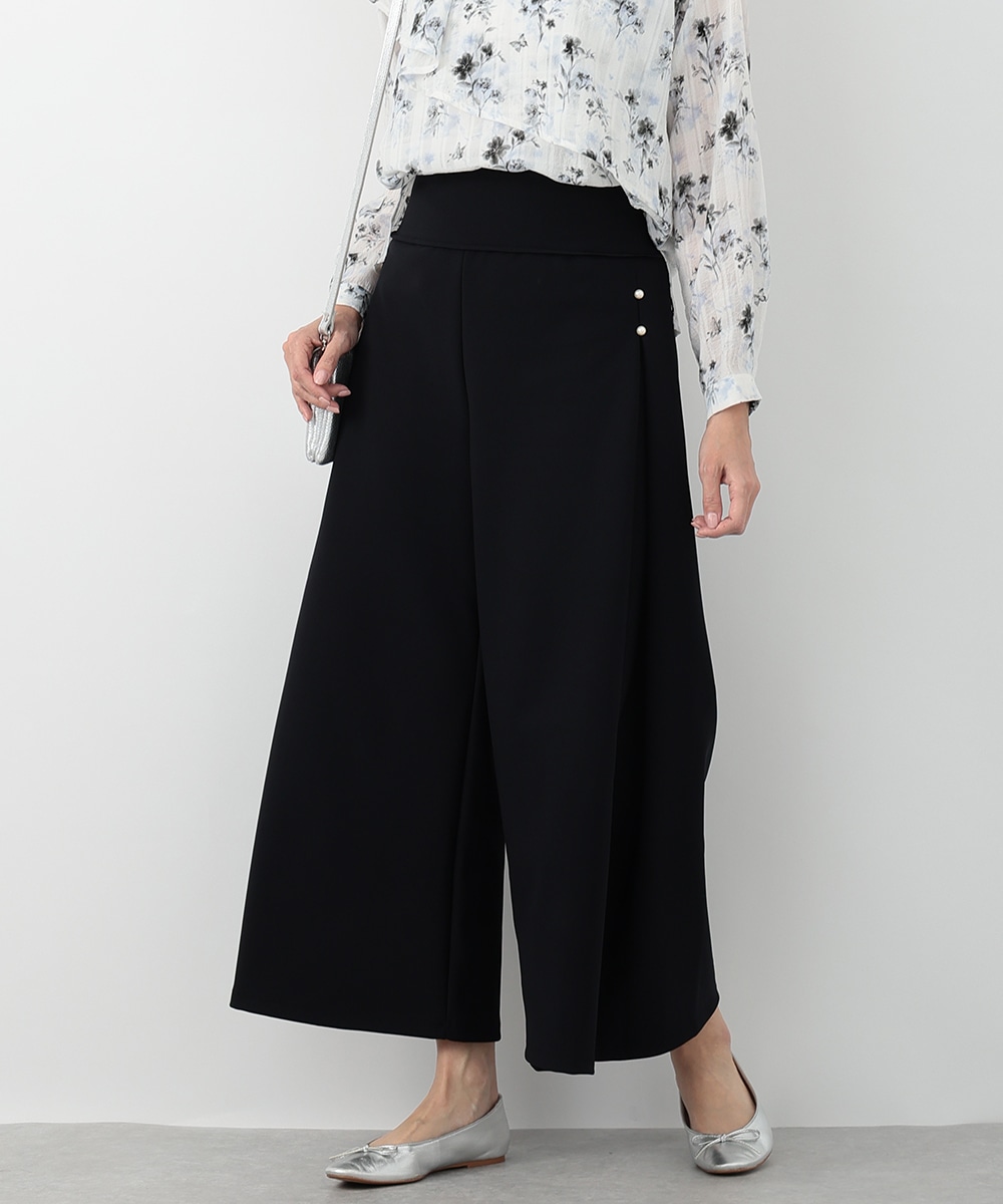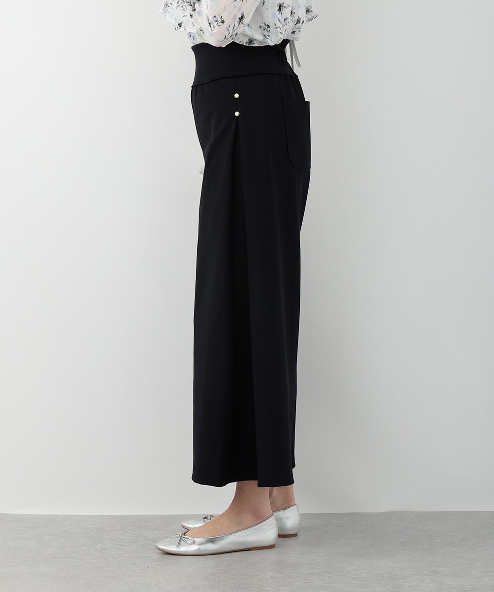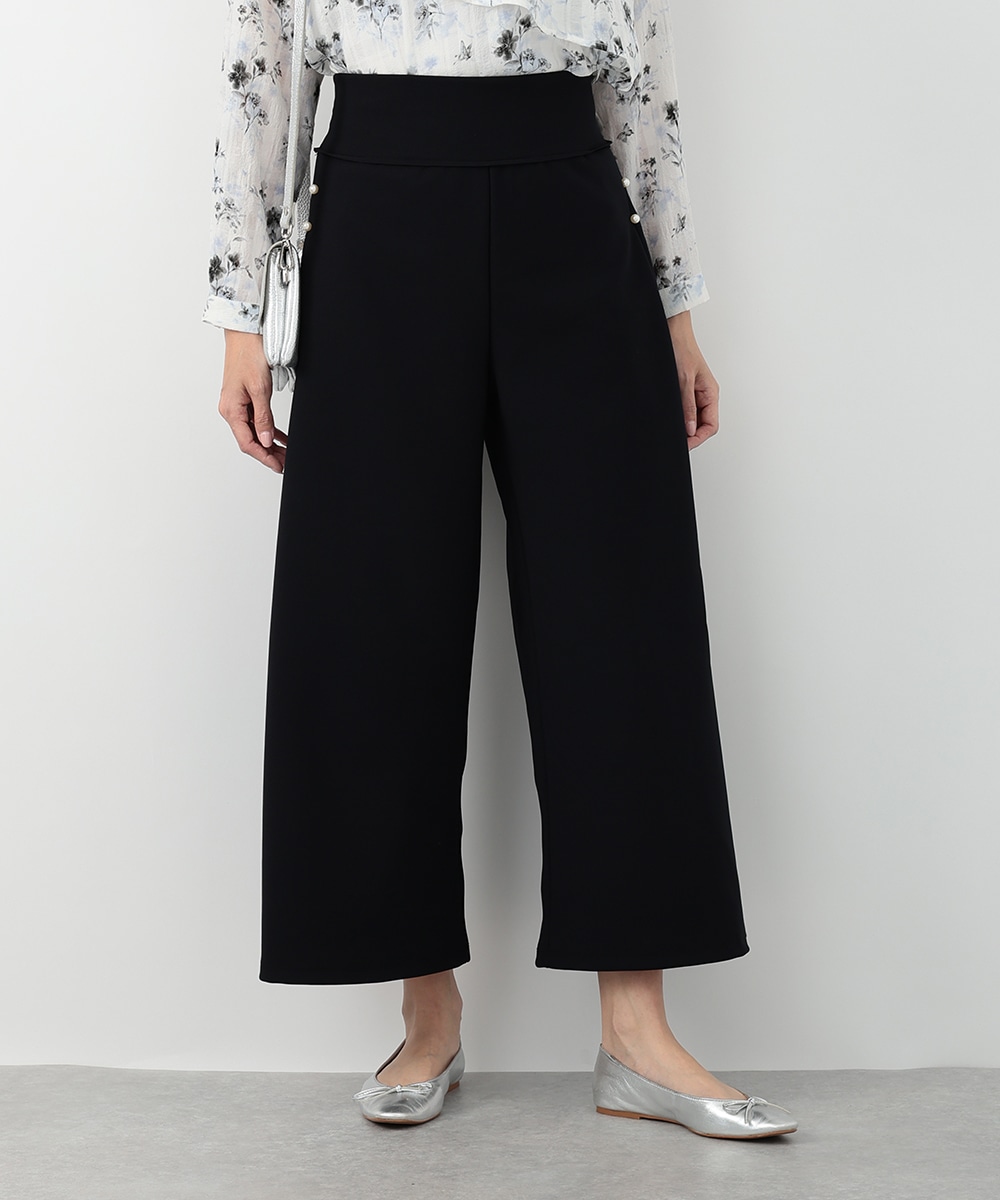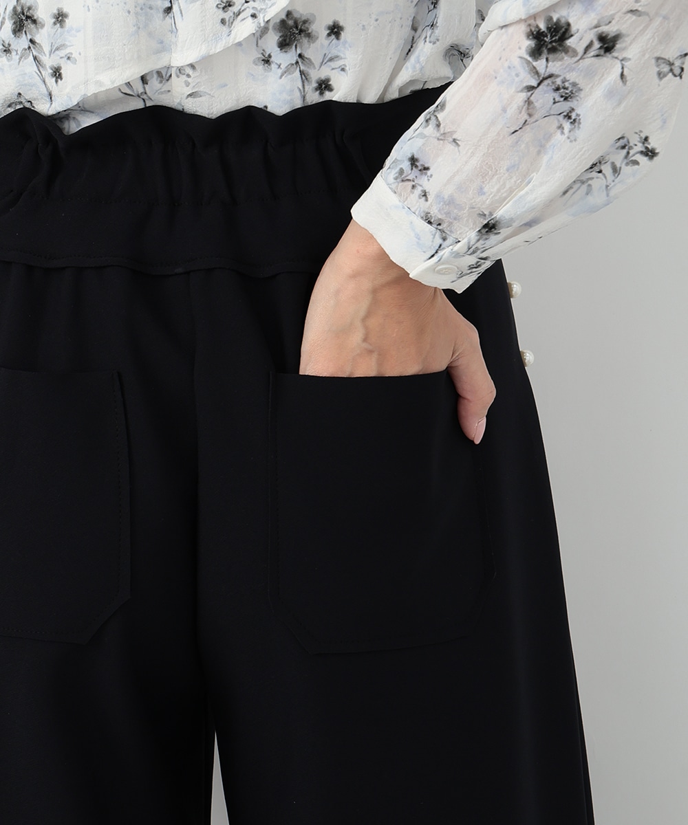 サイドのパール飾りがさりげないワンポイントになるジャージパンツ。タックの入ったワイドなシルエットが特徴的で、リラックス感がありつつ美しい脚のラインを演出します。タックインスタイルも楽しめるハイウエストのデザインが魅力。足元はパンプスと合わせたきれいめなスタイリングがおすすめです。