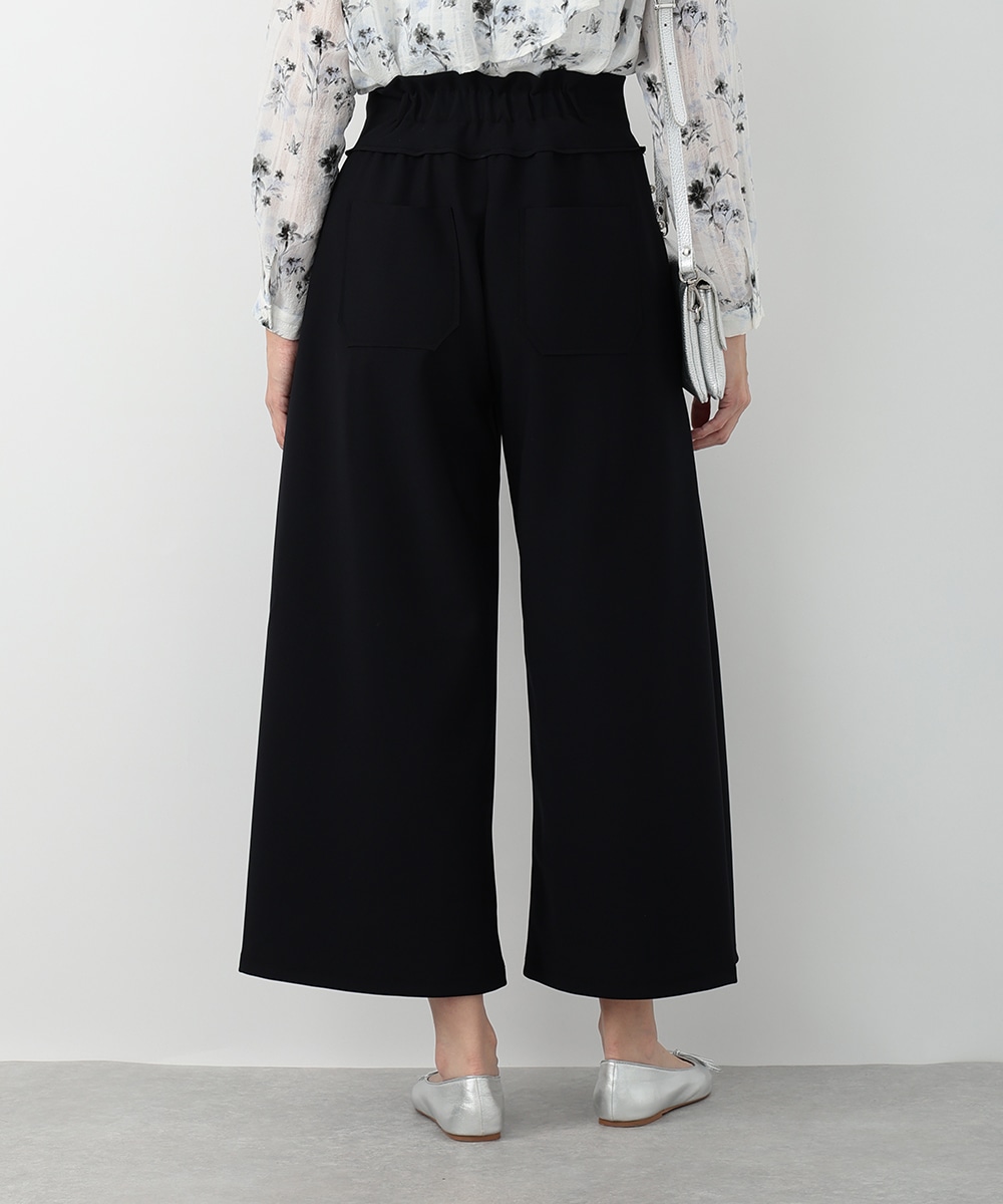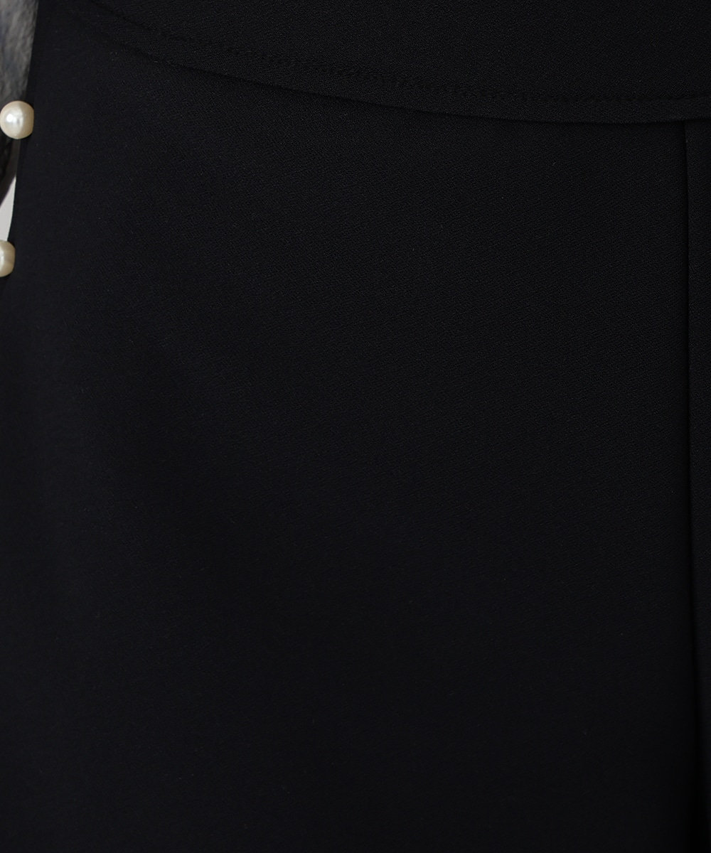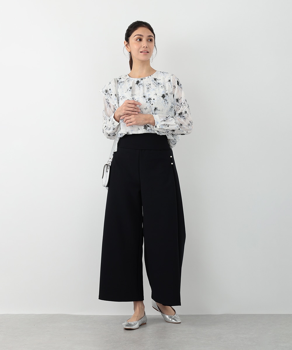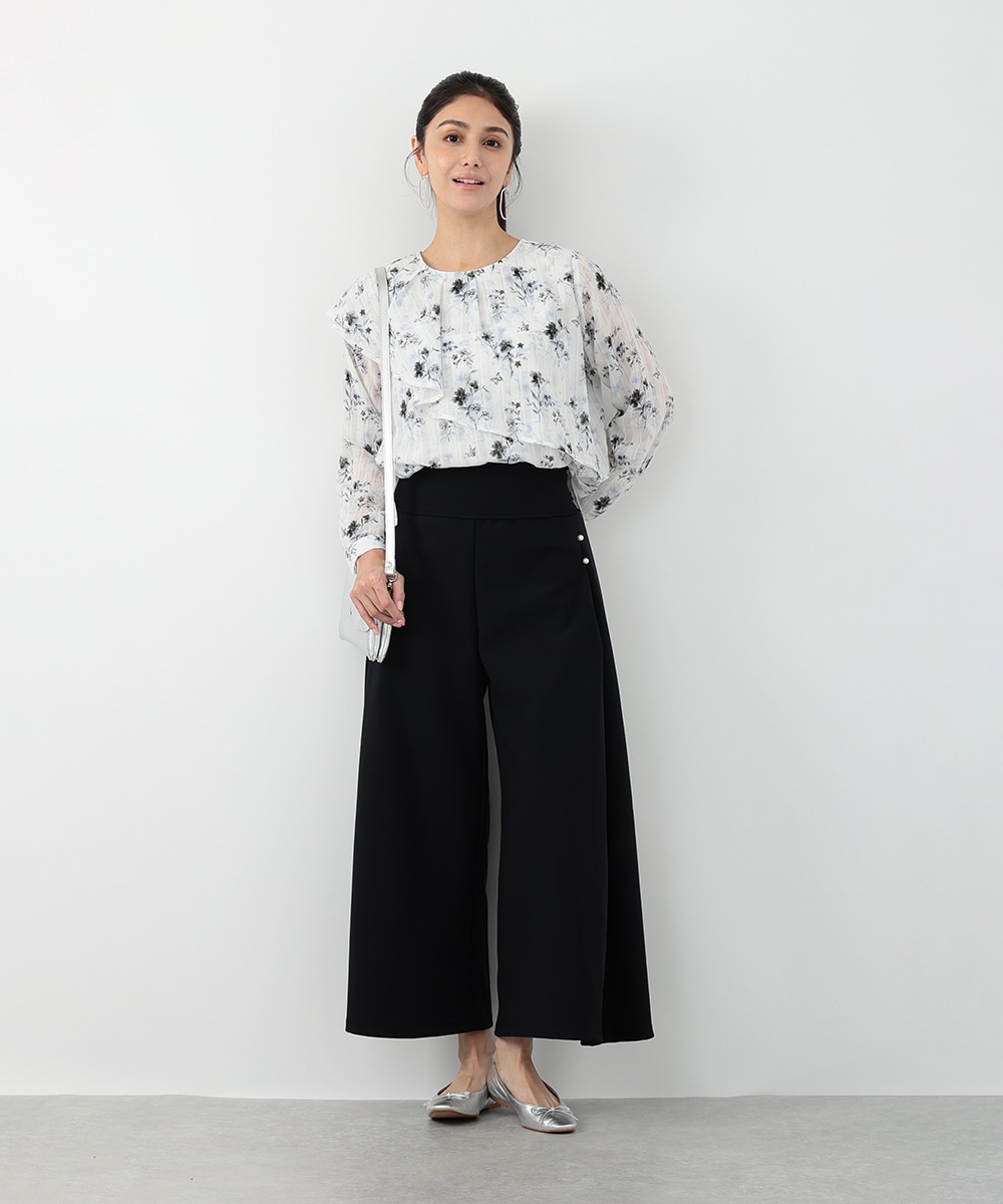 サイドのパール飾りがさりげないワンポイントになるジャージパンツ。タックの入ったワイドなシルエットが特徴的で、リラックス感がありつつ美しい脚のラインを演出します。タックインスタイルも楽しめるハイウエストのデザインが魅力。足元はパンプスと合わせたきれいめなスタイリングがおすすめです。