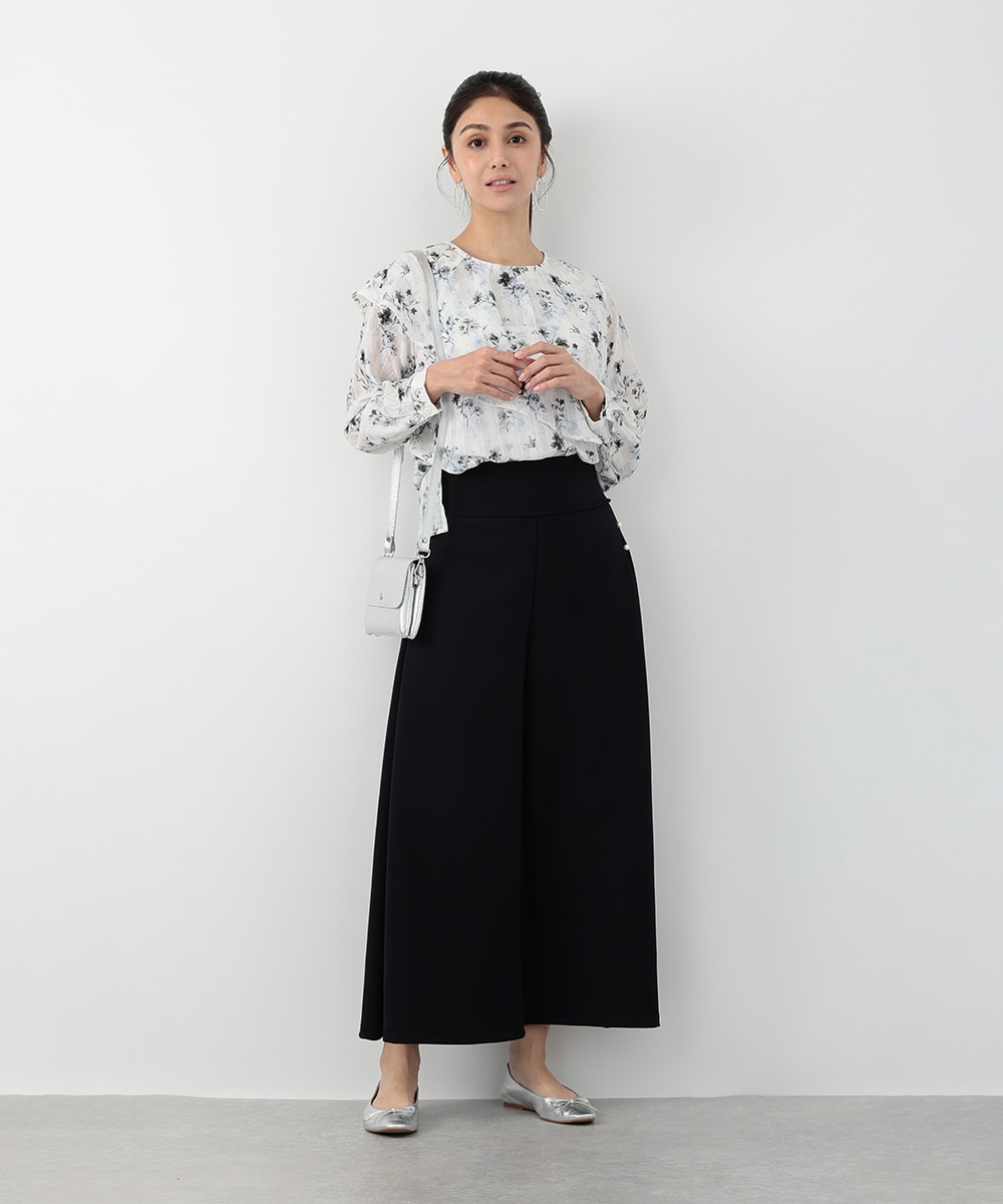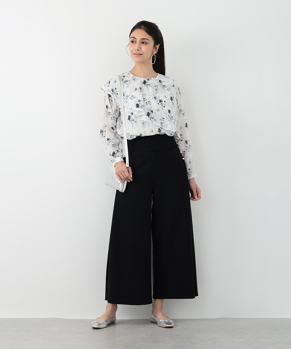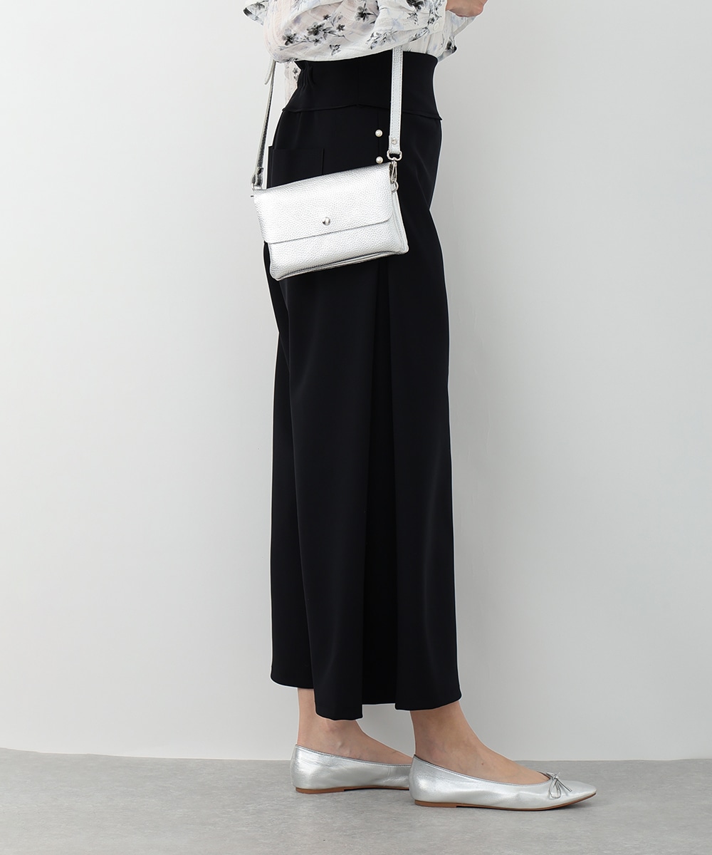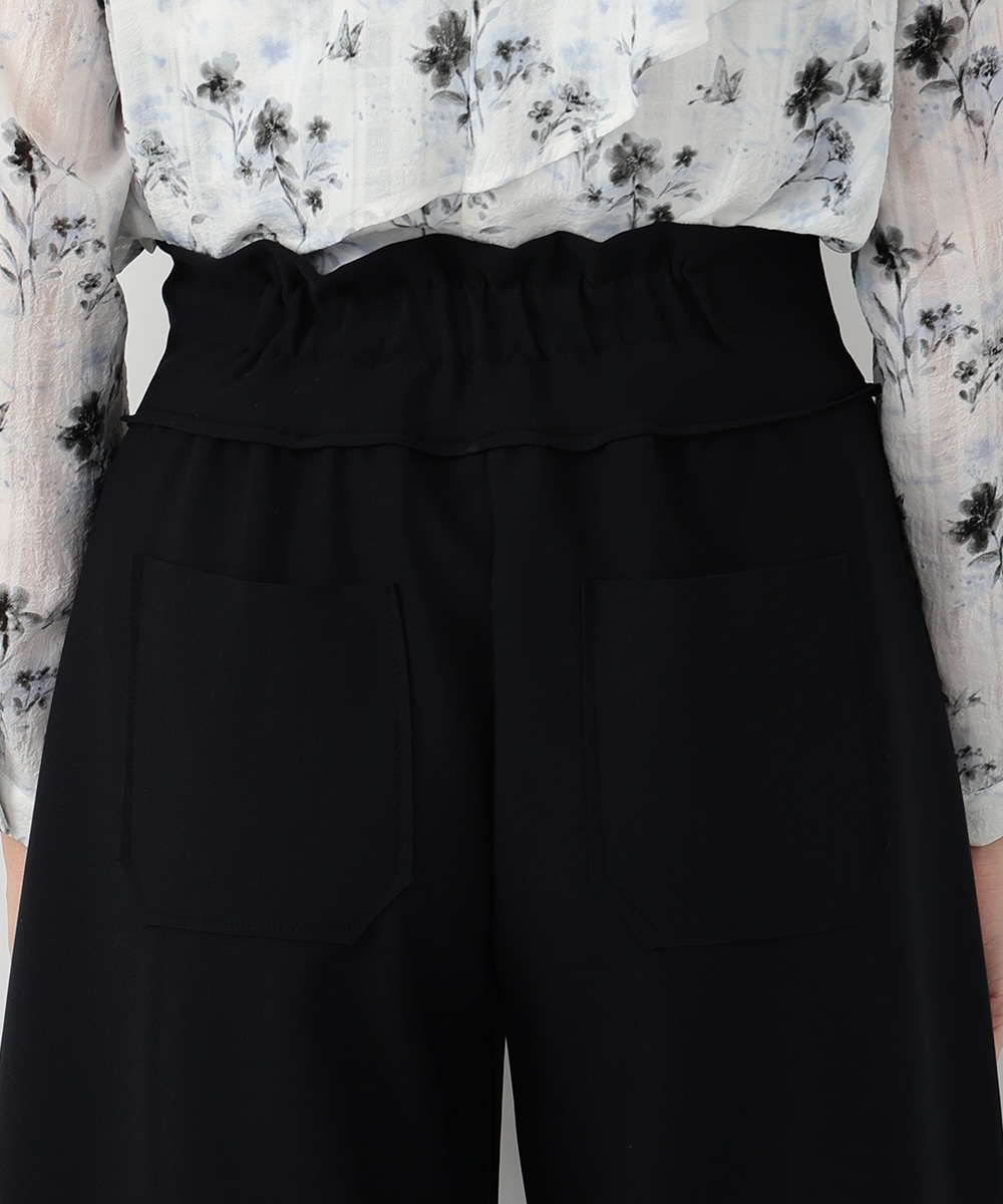 サイドのパール飾りがさりげないワンポイントになるジャージパンツ。タックの入ったワイドなシルエットが特徴的で、リラックス感がありつつ美しい脚のラインを演出します。タックインスタイルも楽しめるハイウエストのデザインが魅力。足元はパンプスと合わせたきれいめなスタイリングがおすすめです。