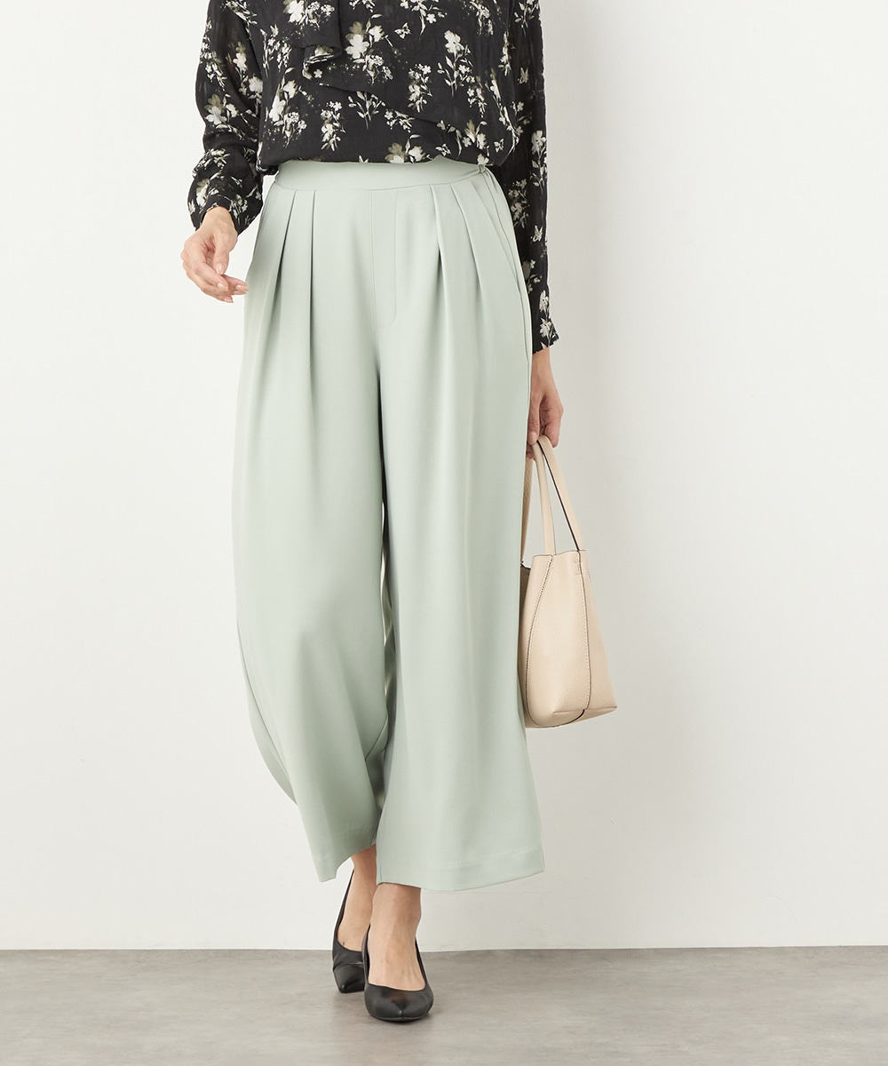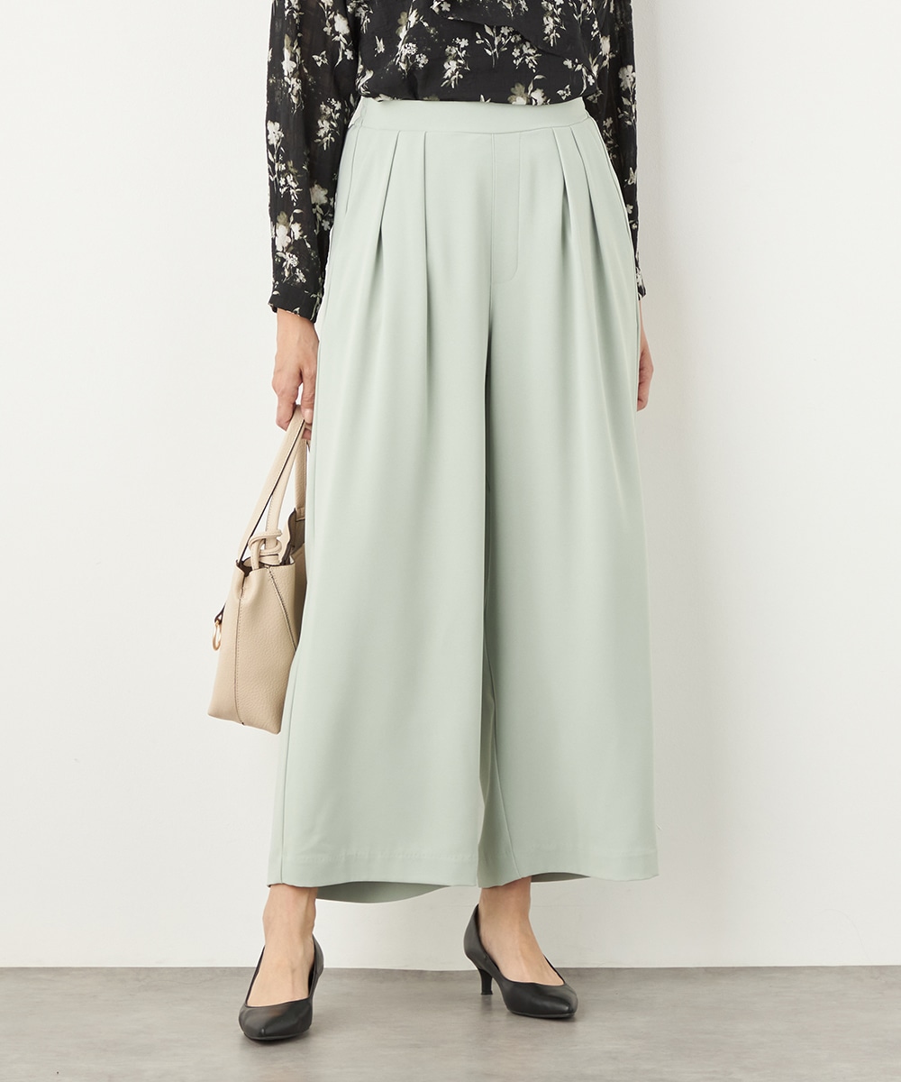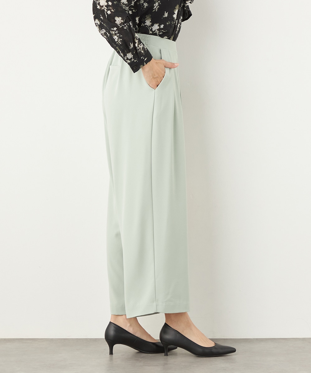 トップスや足元のアレンジ次第でオンオフを問わず取り入れられる便利なアイテムです。今季のトレンドカラーであるグリーンは、コーディネートの差し色としても重宝します。後ろウエストはゴム仕様でフィット感良く着用できます。