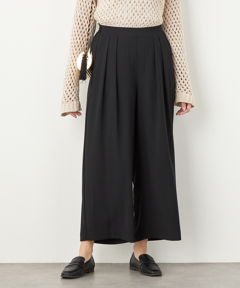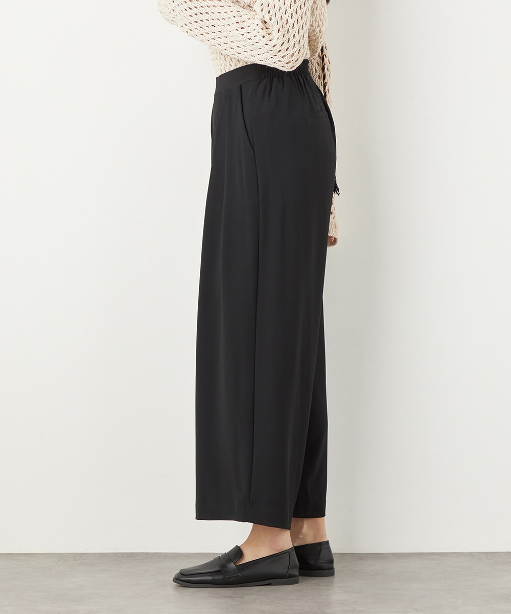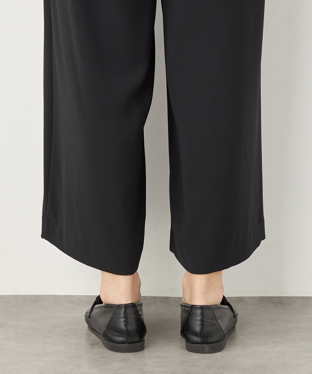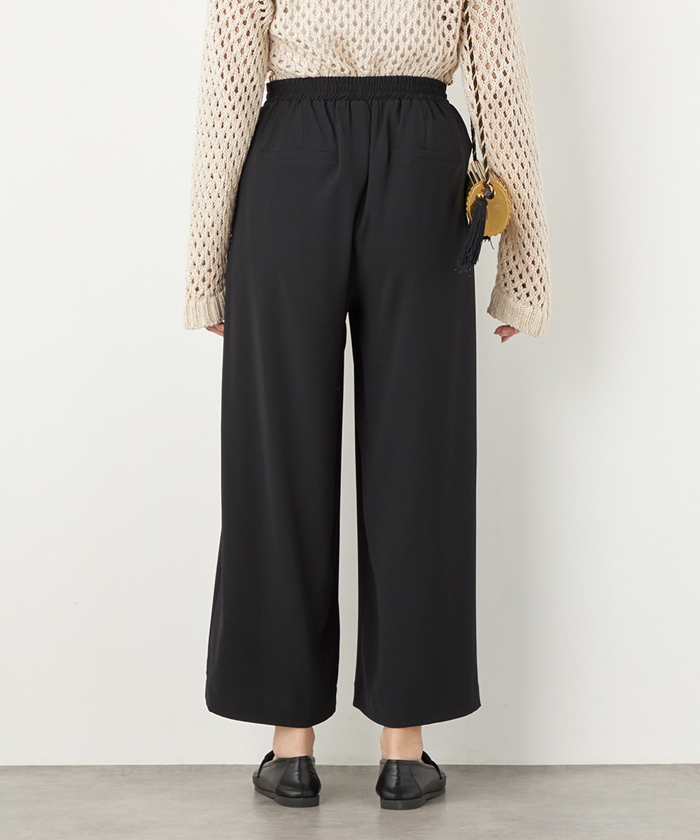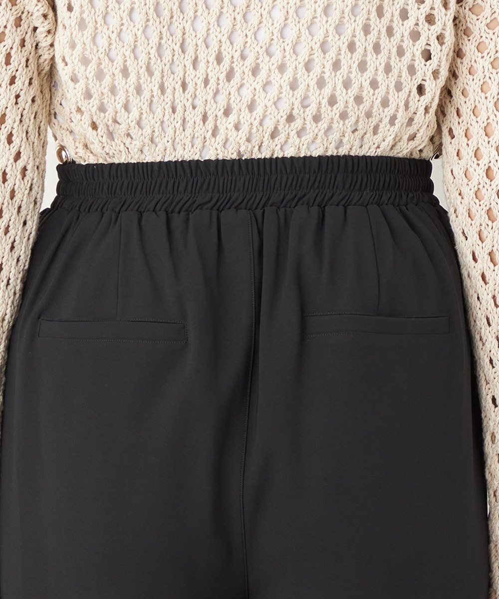トップスや足元のアレンジ次第でオンオフを問わず取り入れられる便利なアイテムです。コーディネート全体を引き締めてくれるシックなブラックは、すっきりとした着こなしを叶えてくれます。後ろウエストはゴム仕様でフィット感良く着用できます。
