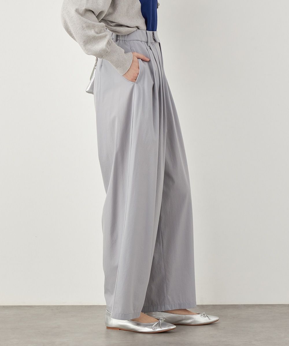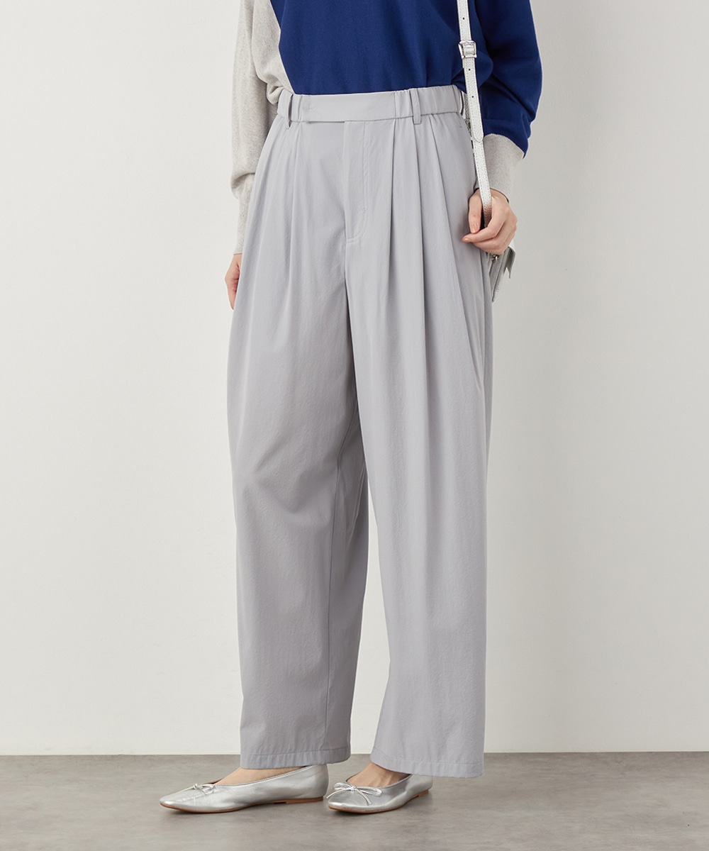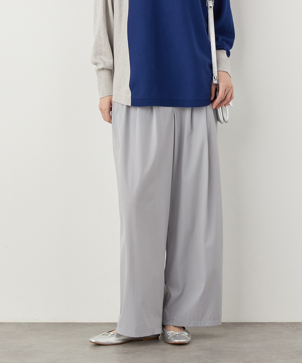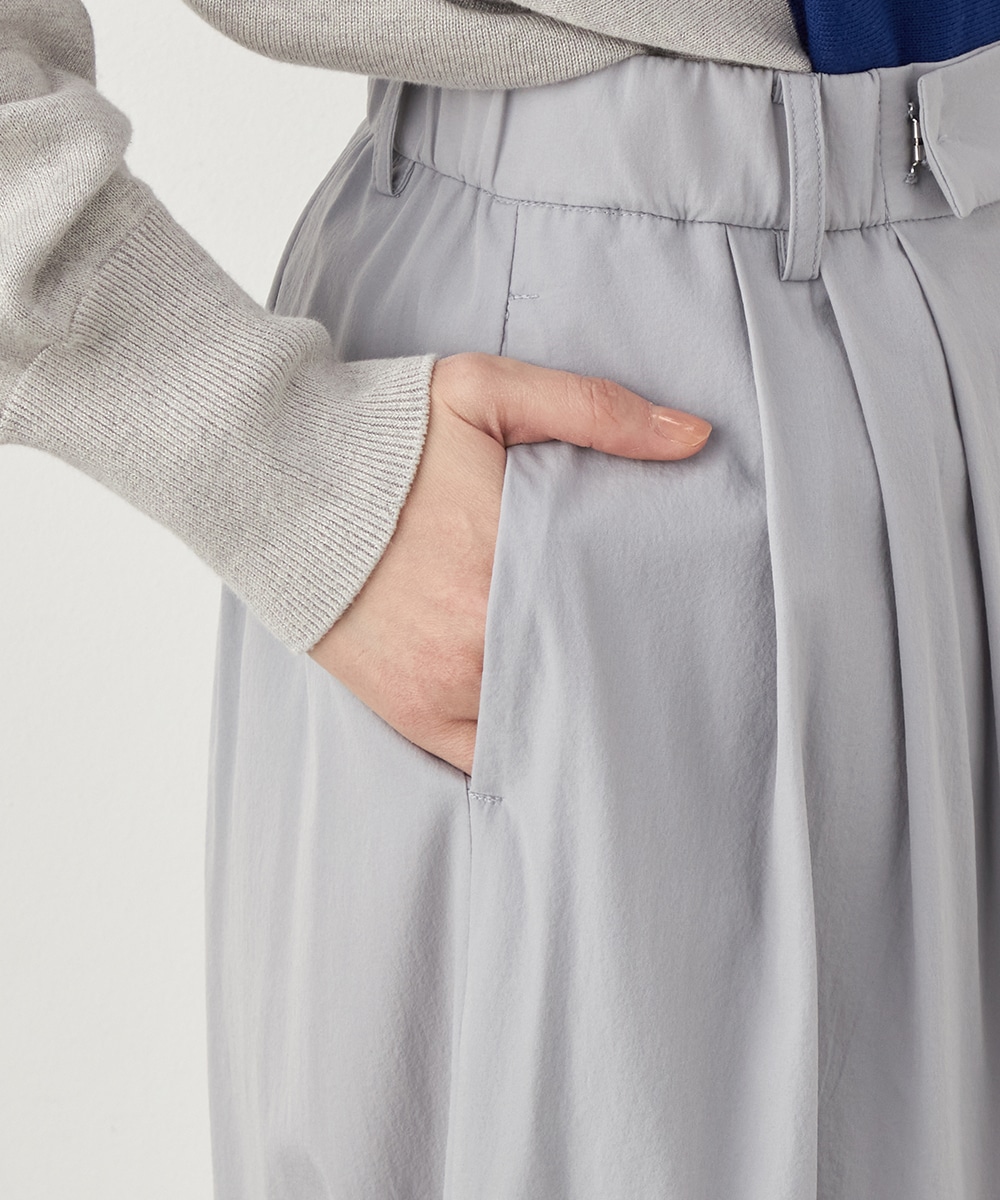 腰回りにはタックを施して、ワイド感を持たせています。シルエットのボリュームがきれいに表現されており、シンプルながらも印象的な1本です。後ろウエストにはゴムが入ってフィット感も良好。スマートフォンなど小物の収納に便利なサイドポケットを備えています。トレンドのサックスと穿きこなしやすいカーキの2色展開です。