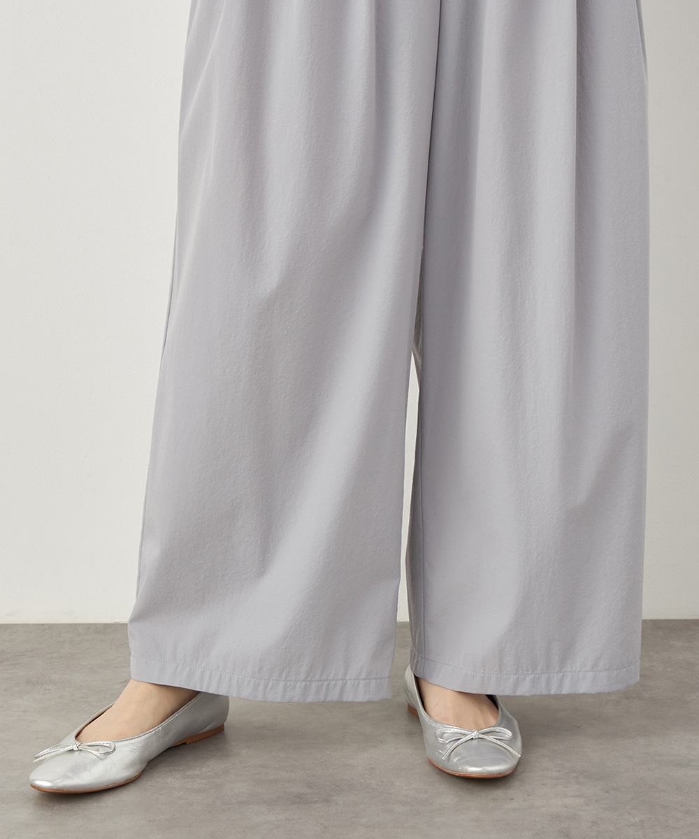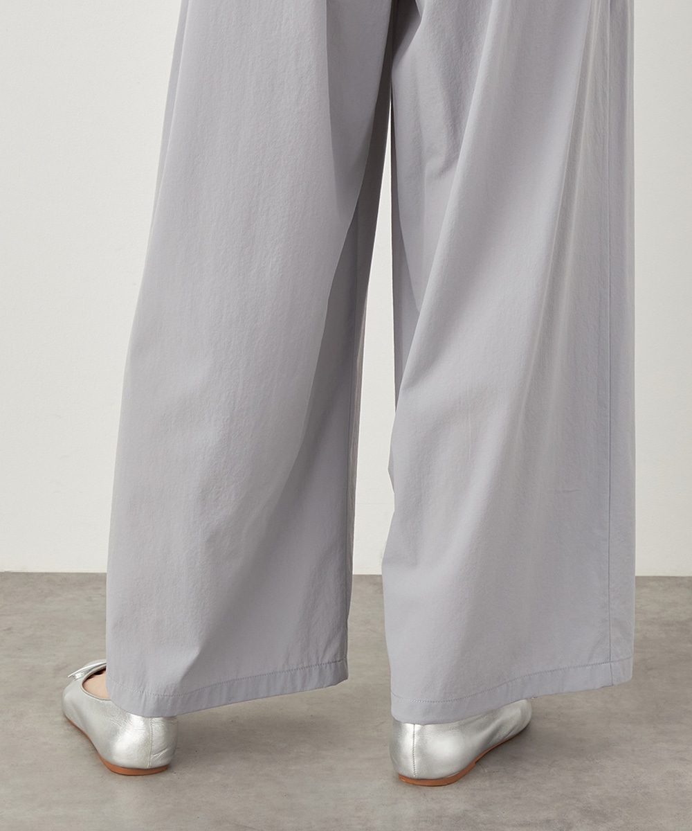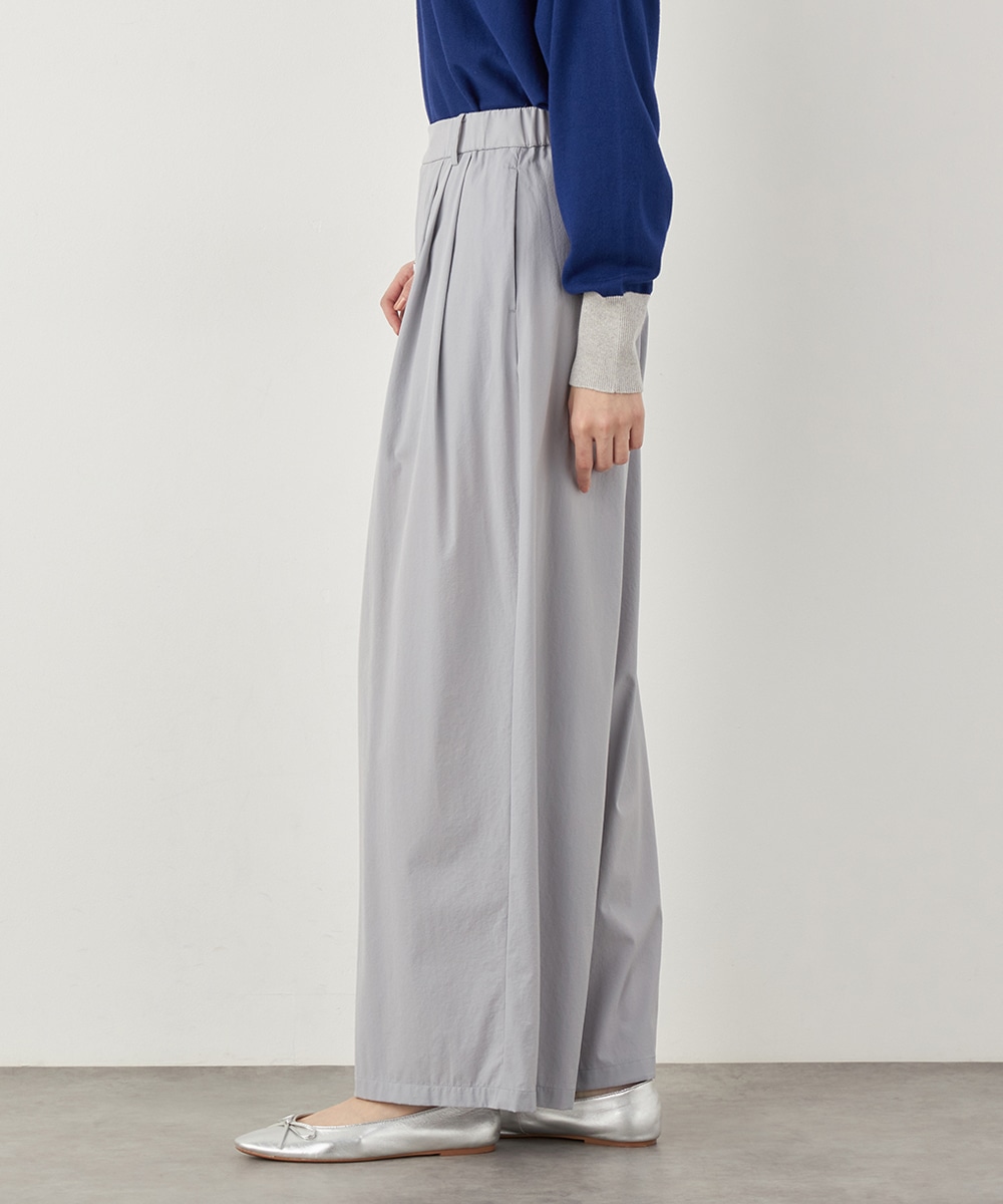 腰回りにはタックを施して、ワイド感を持たせています。シルエットのボリュームがきれいに表現されており、シンプルながらも印象的な1本です。後ろウエストにはゴムが入ってフィット感も良好。スマートフォンなど小物の収納に便利なサイドポケットを備えています。トレンドのサックスと穿きこなしやすいカーキの2色展開です。