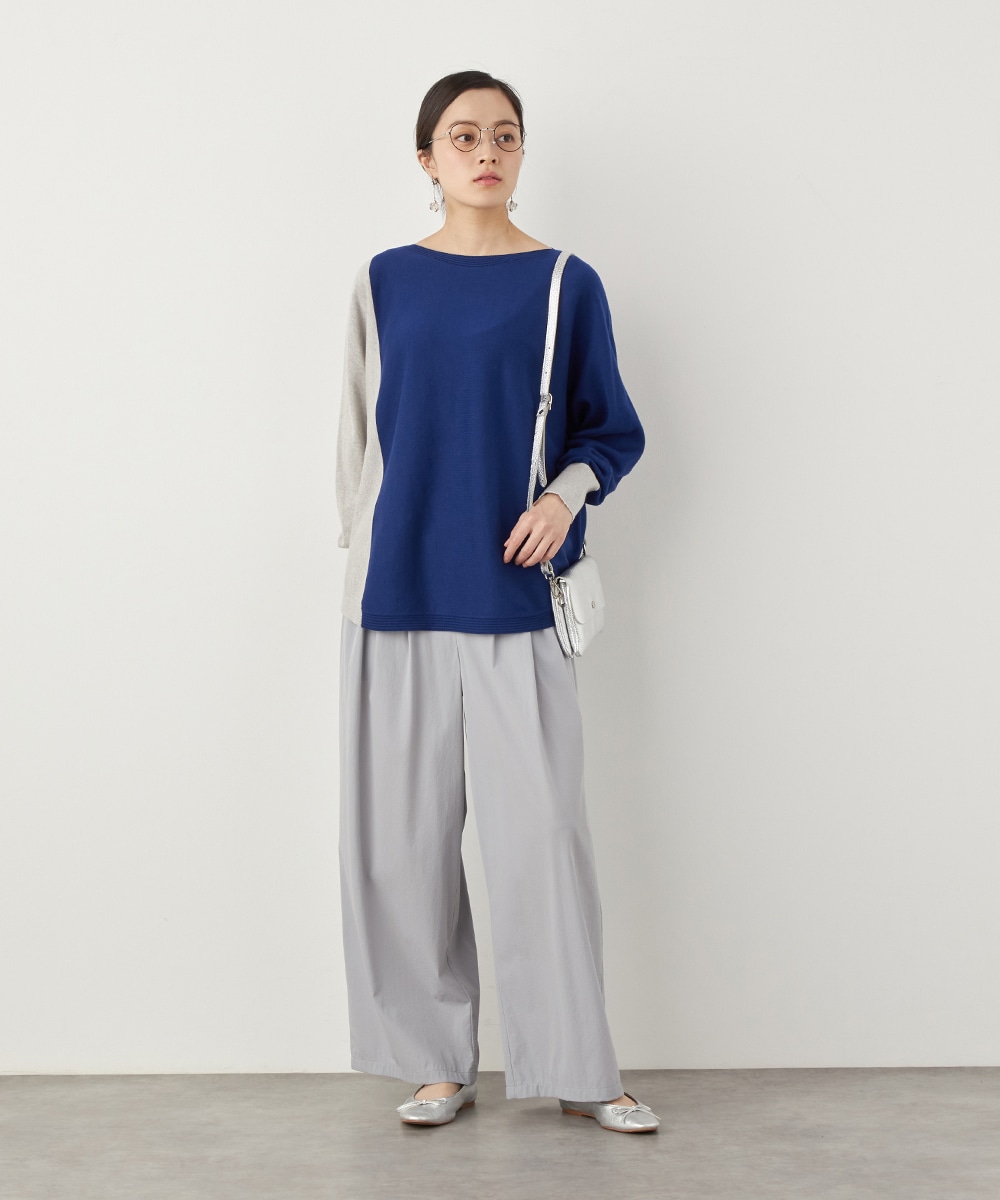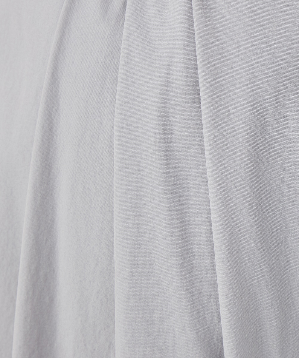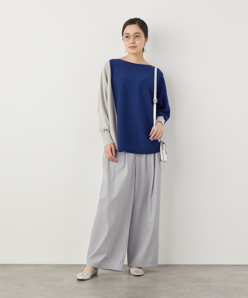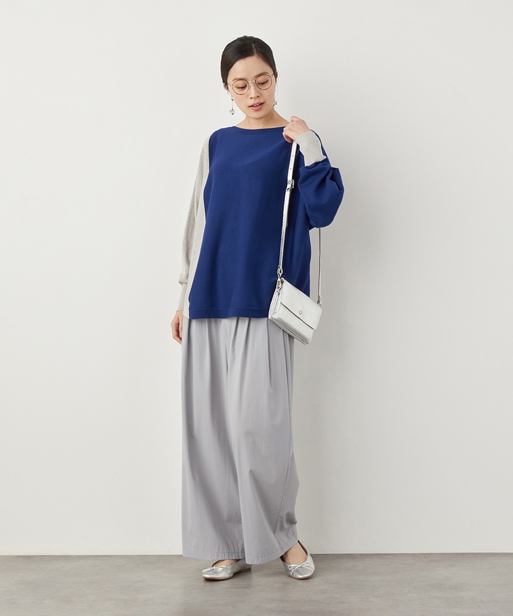 腰回りにはタックを施して、ワイド感を持たせています。シルエットのボリュームがきれいに表現されており、シンプルながらも印象的な1本です。後ろウエストにはゴムが入ってフィット感も良好。スマートフォンなど小物の収納に便利なサイドポケットを備えています。トレンドのサックスと穿きこなしやすいカーキの2色展開です。