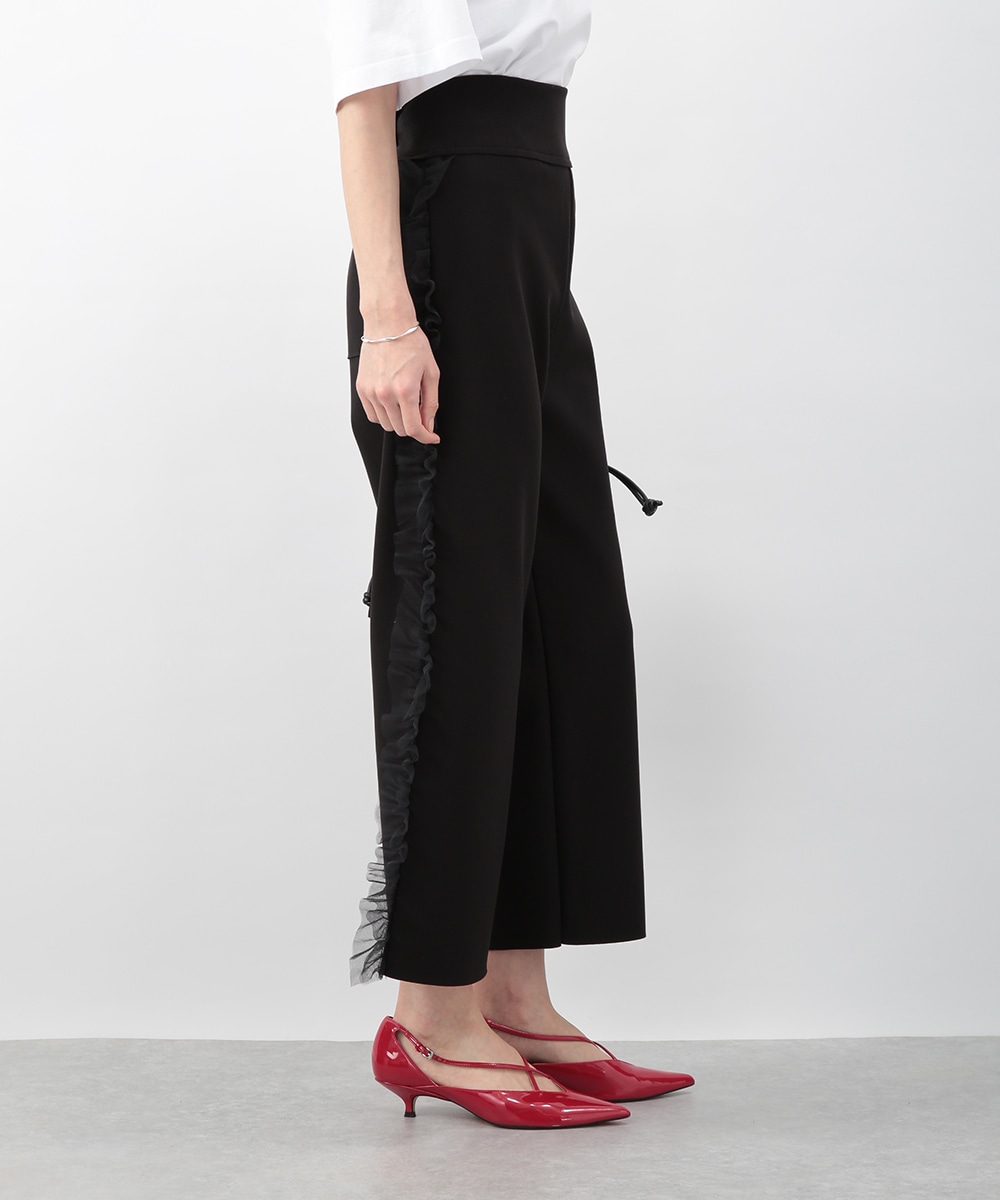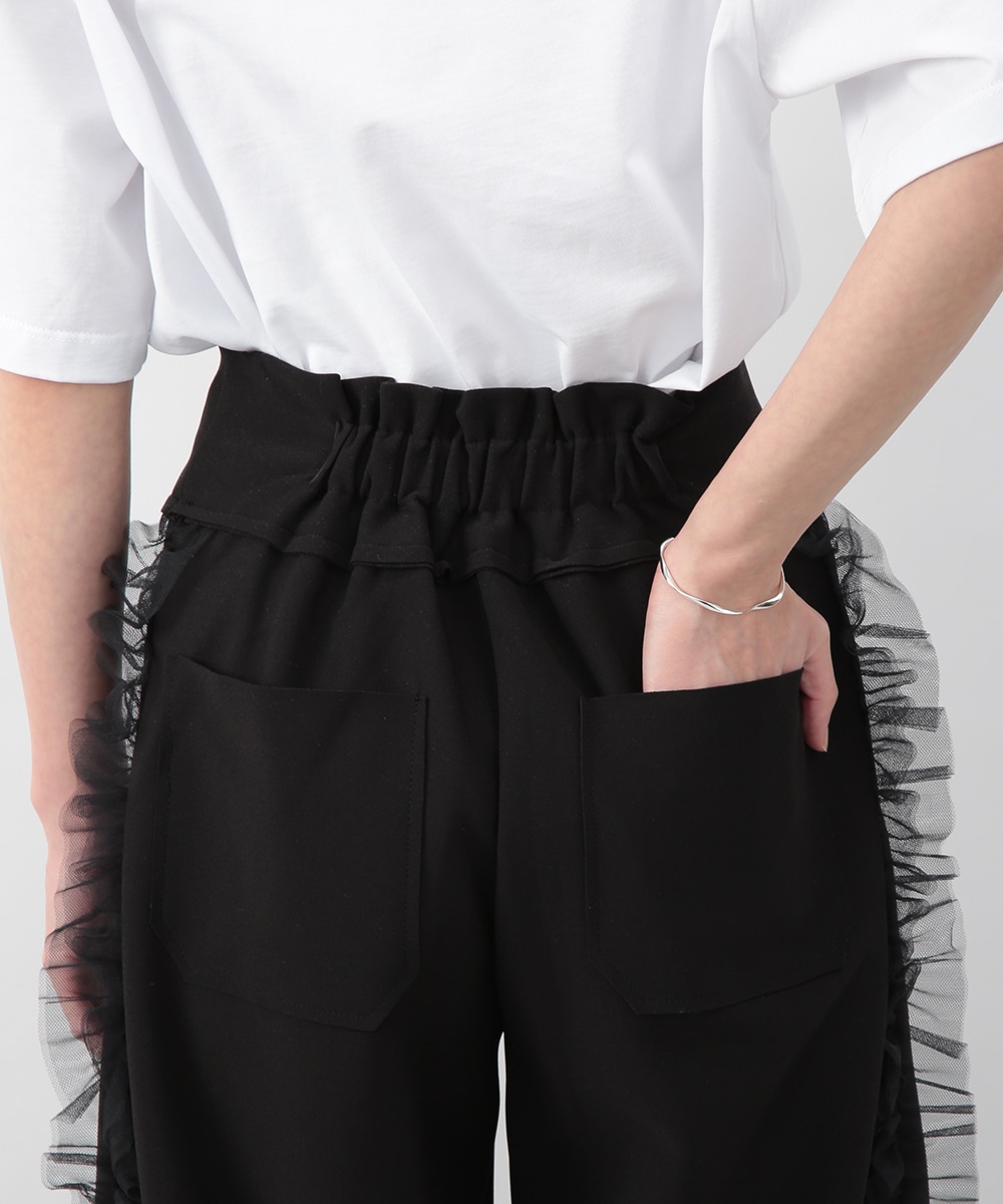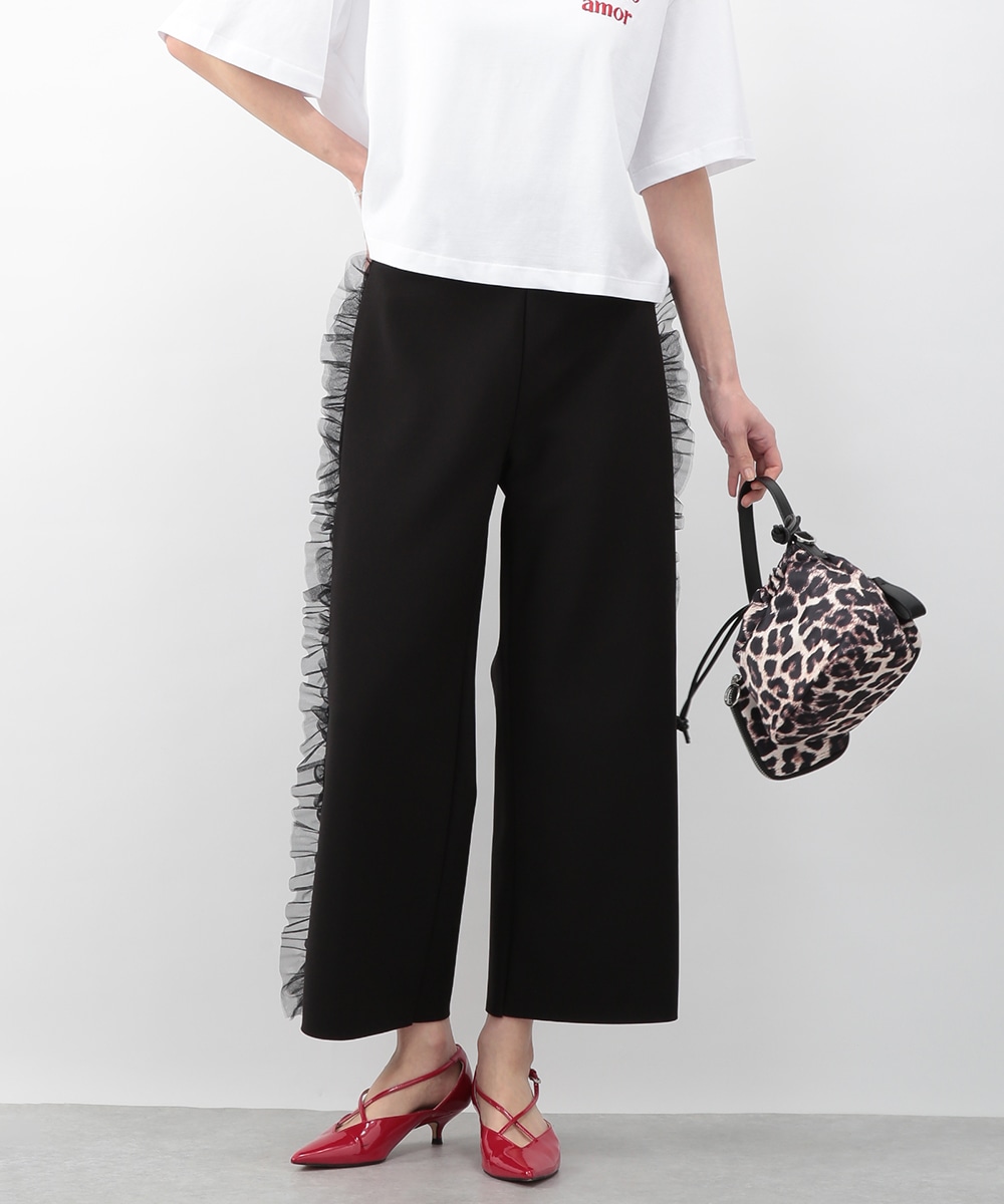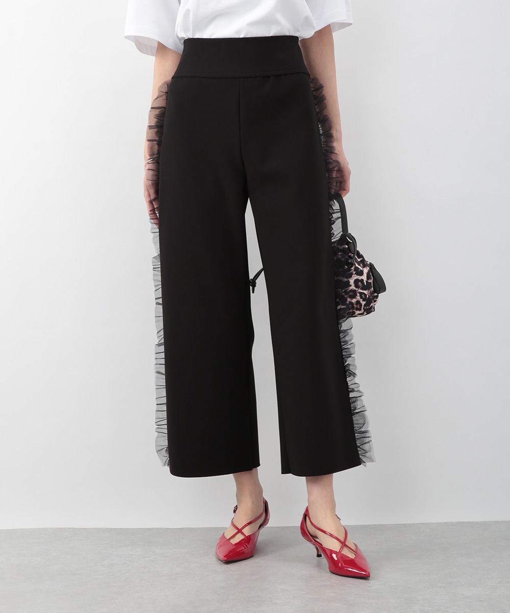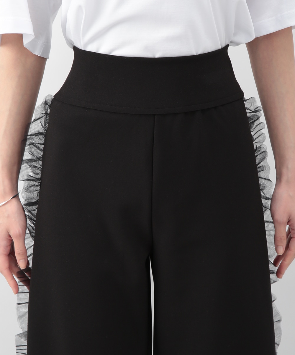サイドにチュールフリルをあしらったカットワイドパンツ。伸びのあるカットソー素材で穿き心地がよく、ラフになり過ぎずきれいめな印象に仕上がります。程よいワイドシルエットが脚のラインを拾いにくく、動くたびに揺れるチュールが華やかなアクセントに。シンプルなトップスを合わせるだけでもバランス良く決まり、デイリーからお出かけまで活躍します。