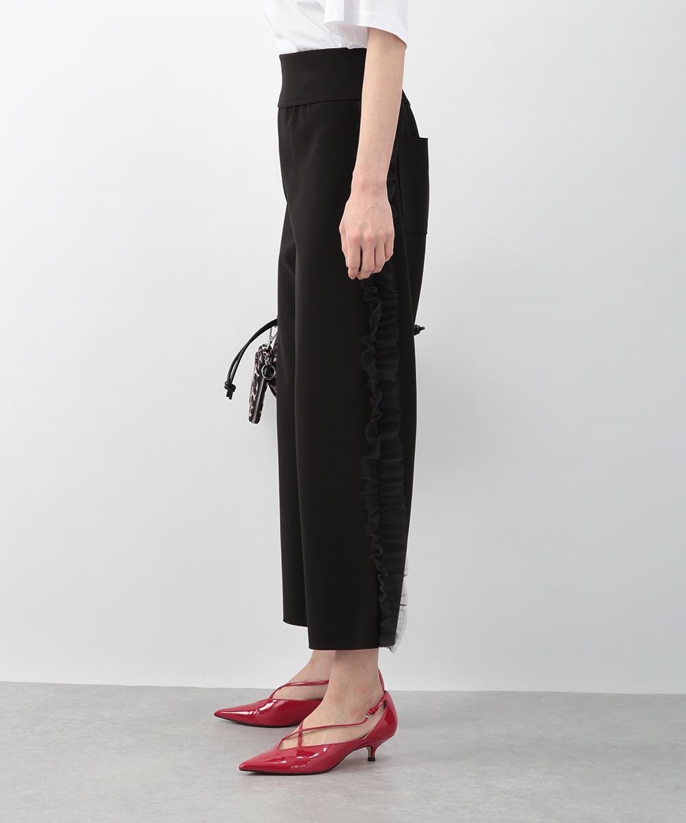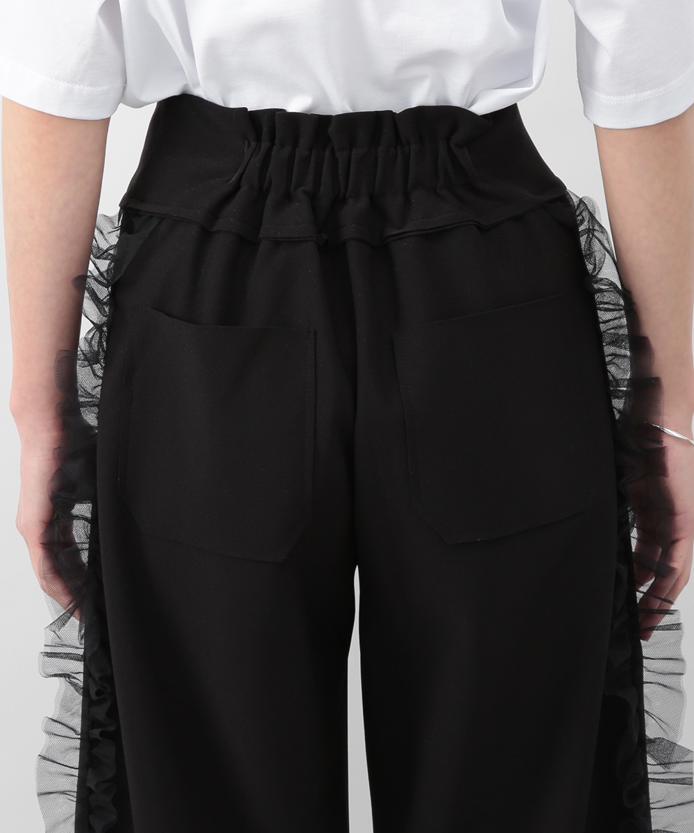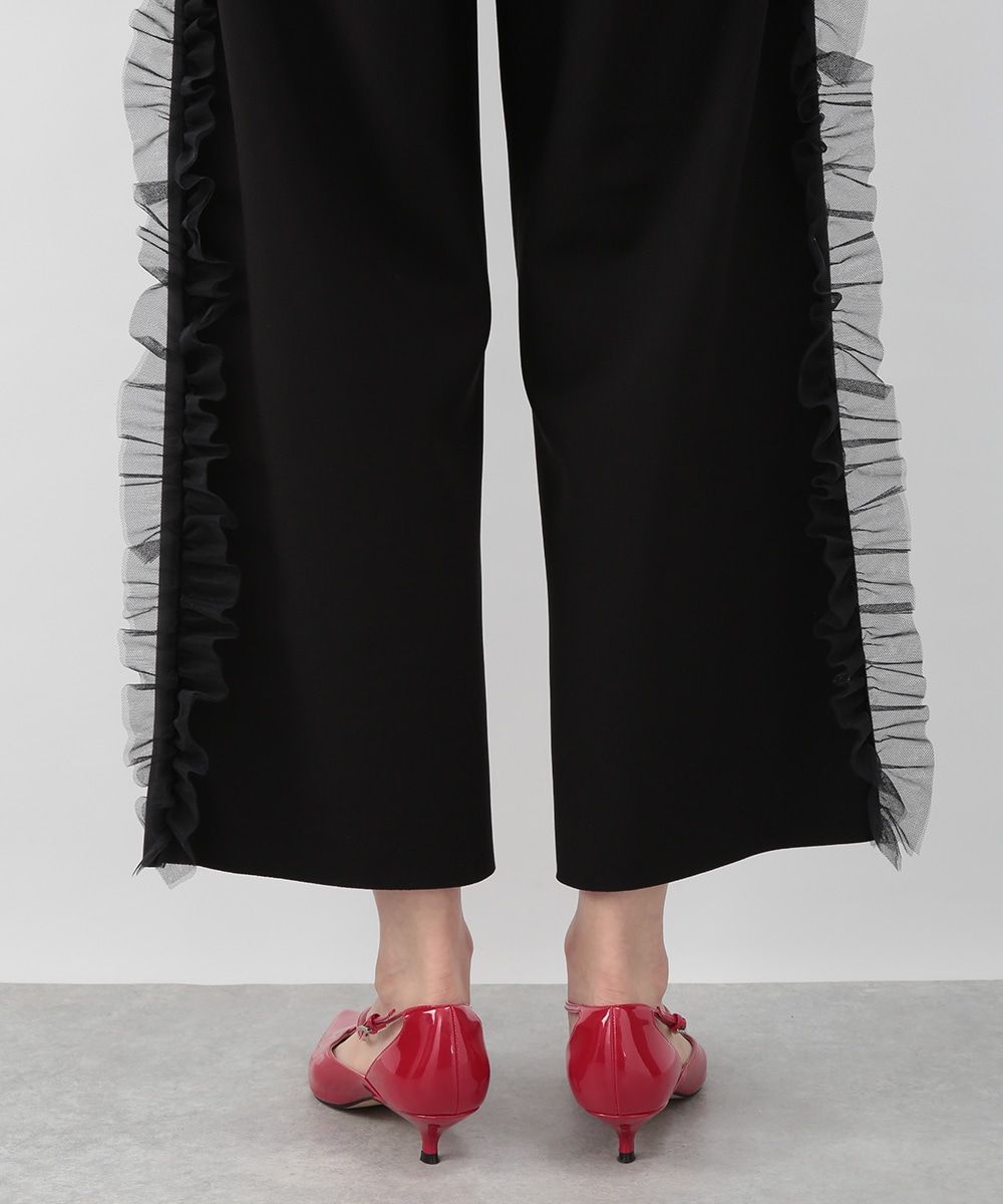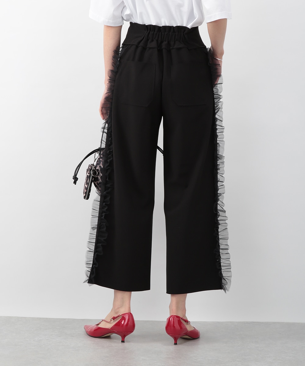 サイドにチュールフリルをあしらったカットワイドパンツ。伸びのあるカットソー素材で穿き心地がよく、ラフになり過ぎずきれいめな印象に仕上がります。程よいワイドシルエットが脚のラインを拾いにくく、動くたびに揺れるチュールが華やかなアクセントに。シンプルなトップスを合わせるだけでもバランス良く決まり、デイリーからお出かけまで活躍します。