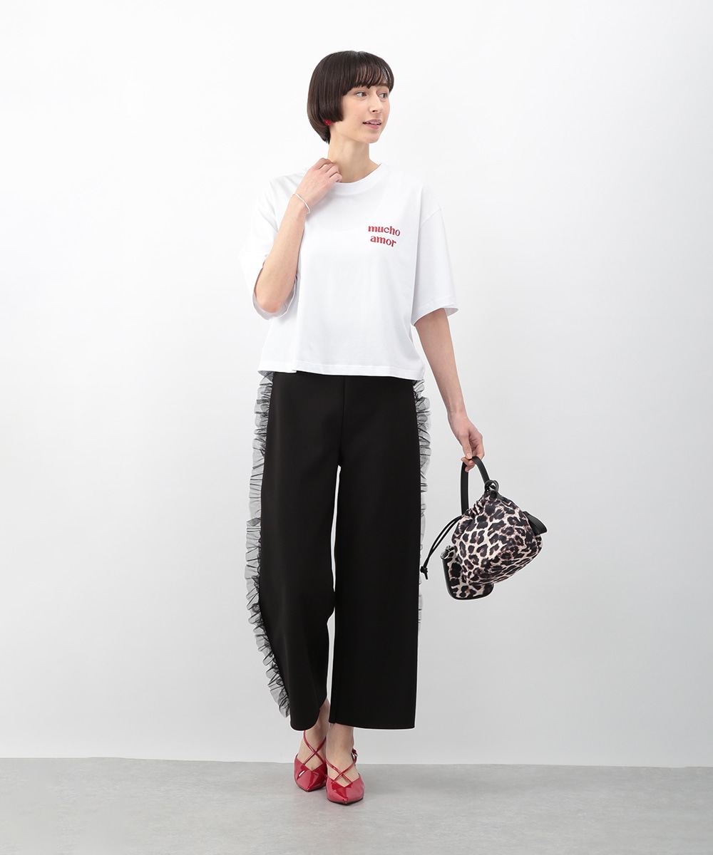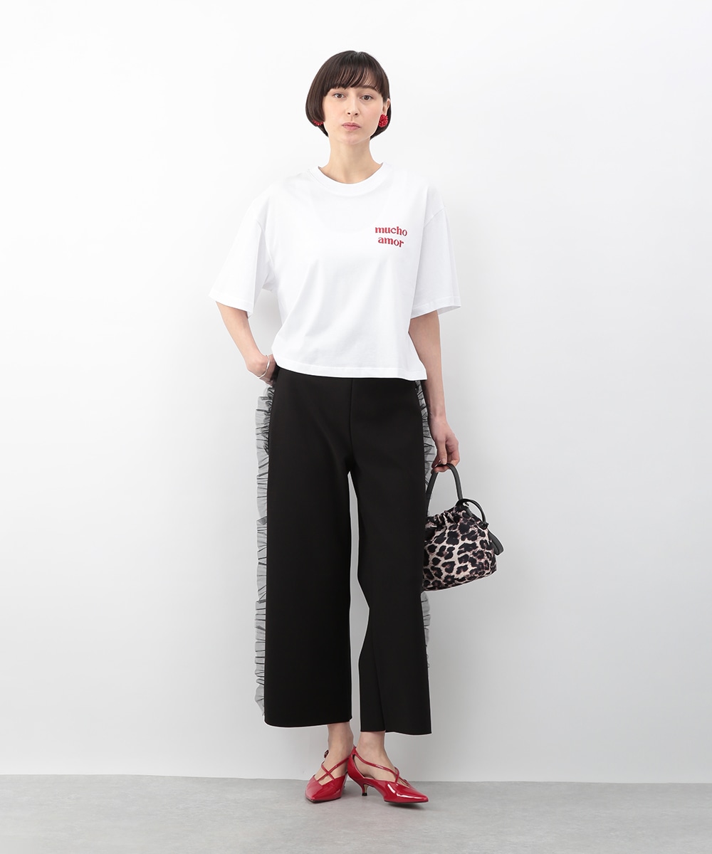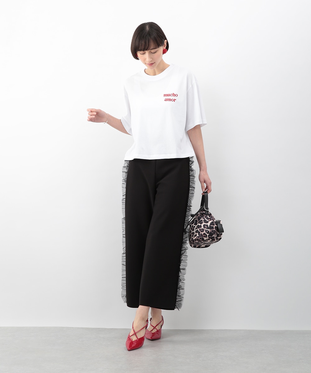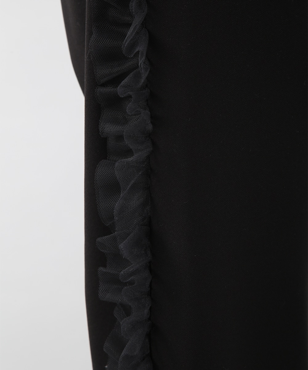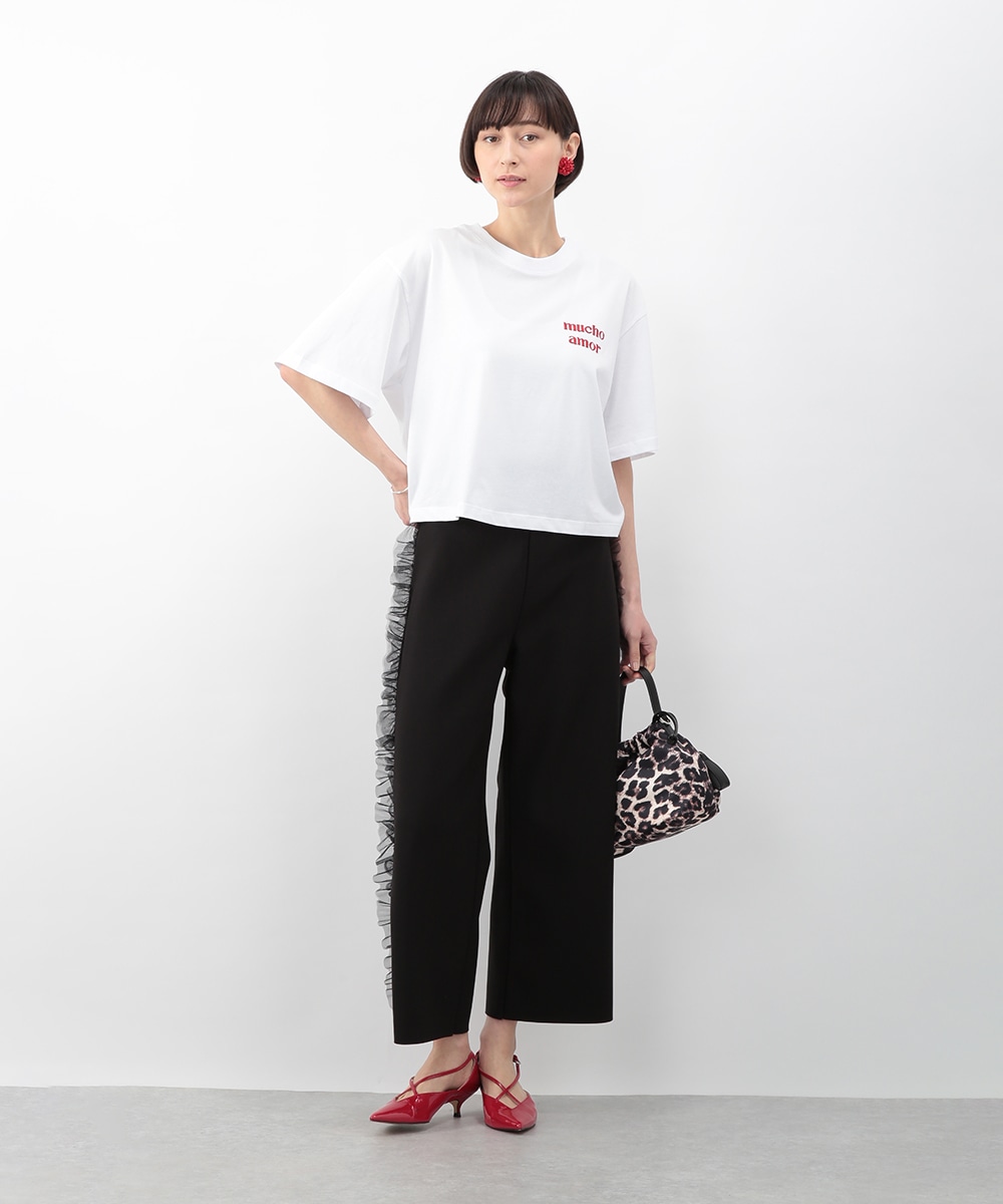 サイドにチュールフリルをあしらったカットワイドパンツ。伸びのあるカットソー素材で穿き心地がよく、ラフになり過ぎずきれいめな印象に仕上がります。程よいワイドシルエットが脚のラインを拾いにくく、動くたびに揺れるチュールが華やかなアクセントに。シンプルなトップスを合わせるだけでもバランス良く決まり、デイリーからお出かけまで活躍します。