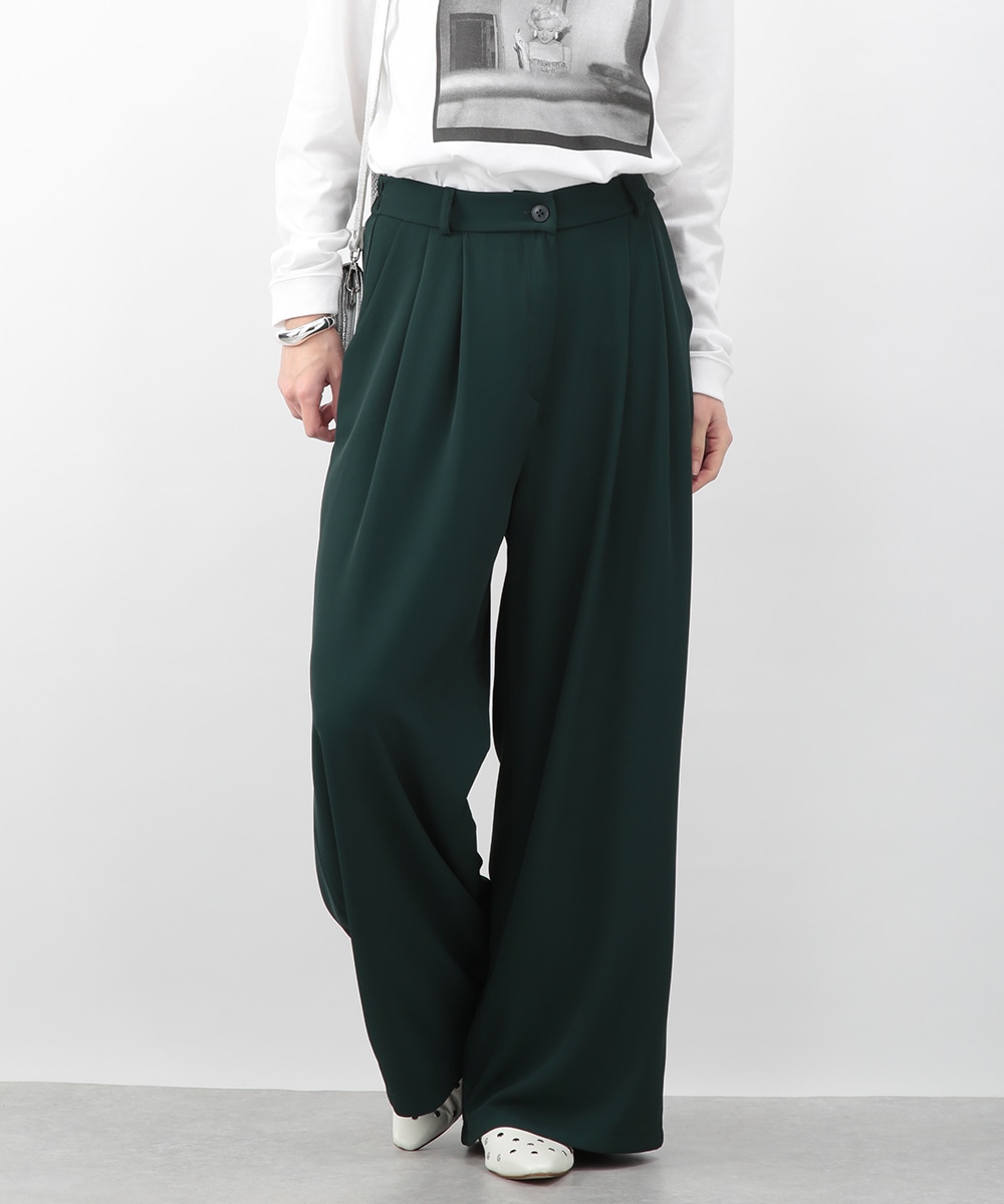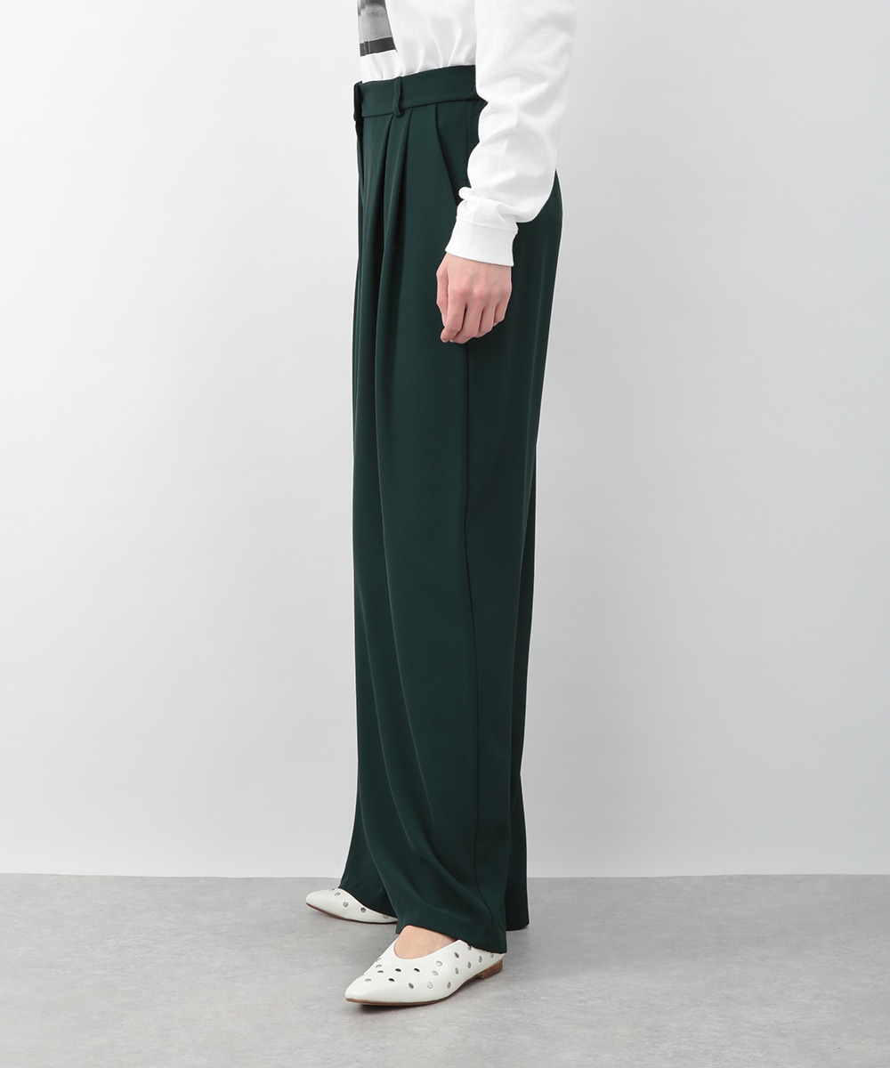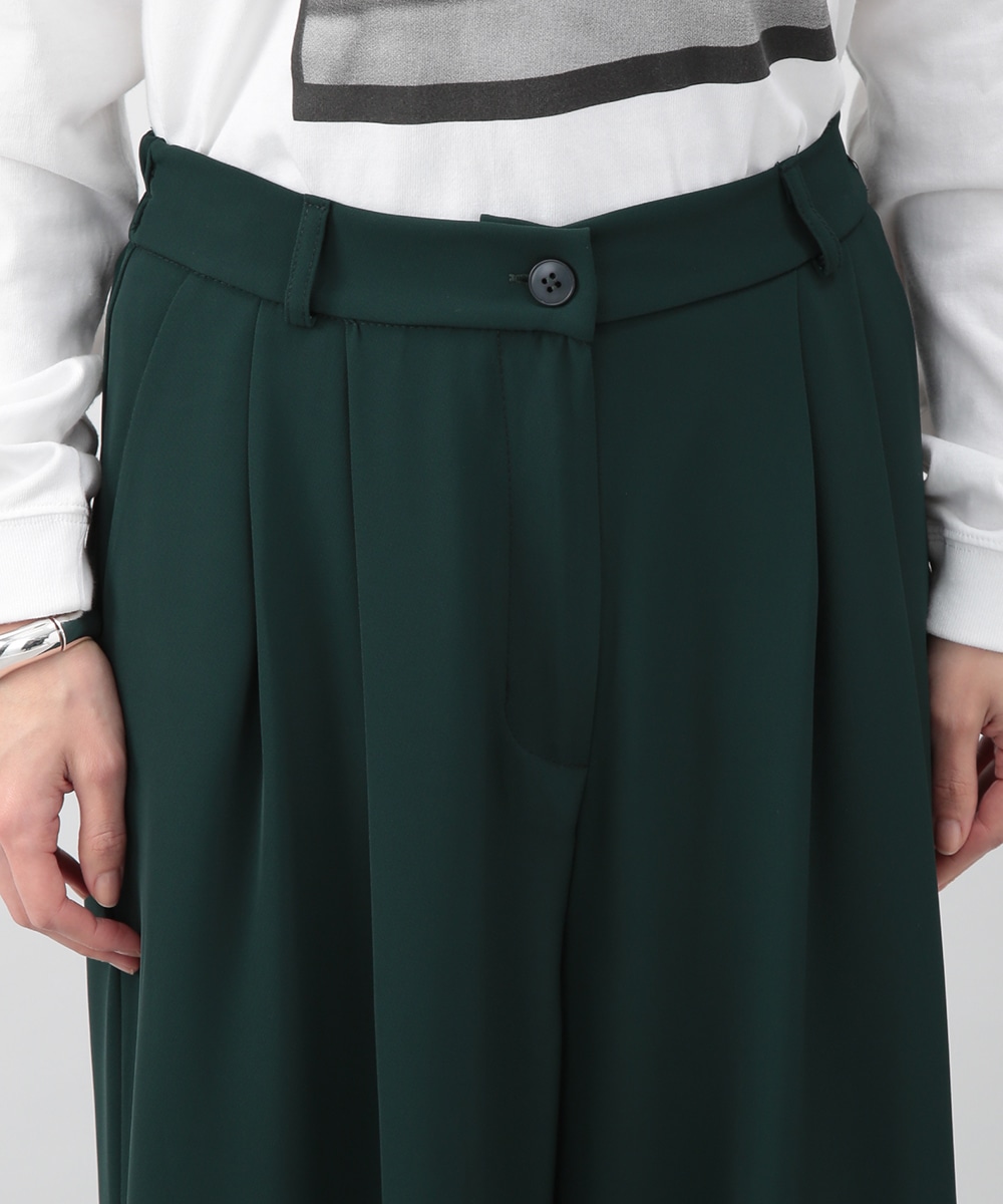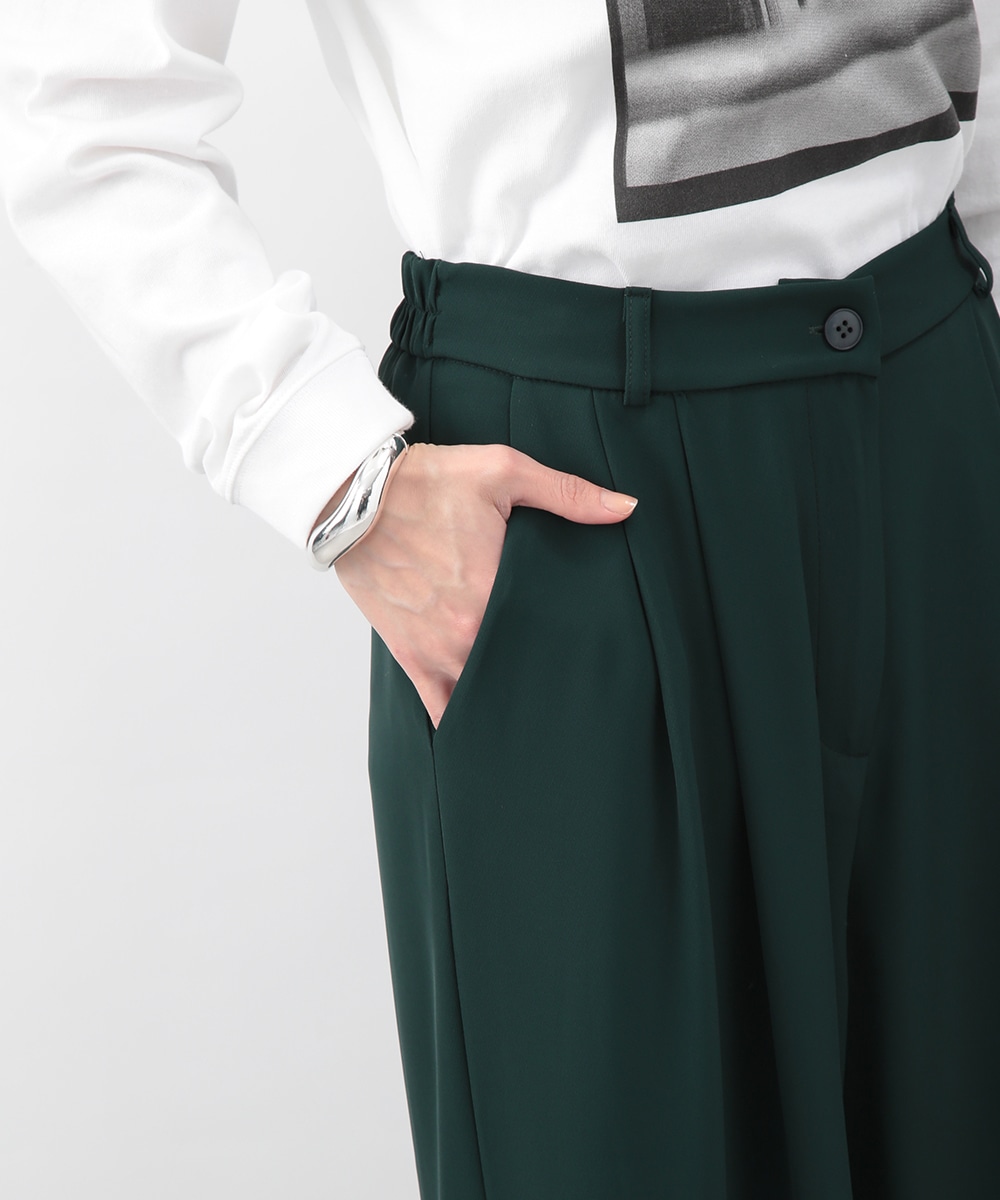 落ち感のある素材がつくる、しなやかなシルエットのワイドパンツ。フロントに入れたタックが立体感を生み、すっきりとした印象に仕上げています。深みのあるグリーンカラーが装いのアクセントに。コンパクトなトップスを合わせてバランス良く、ブラウスをインしてきれいめにも穿きやすい一枚です。