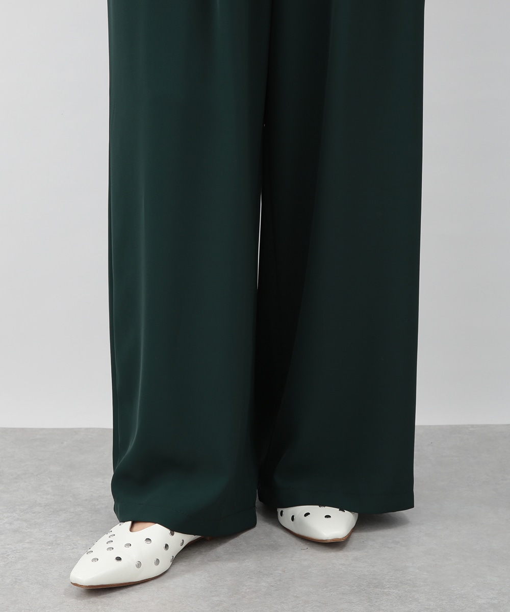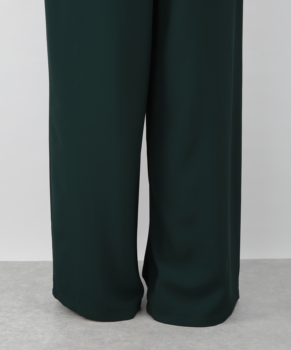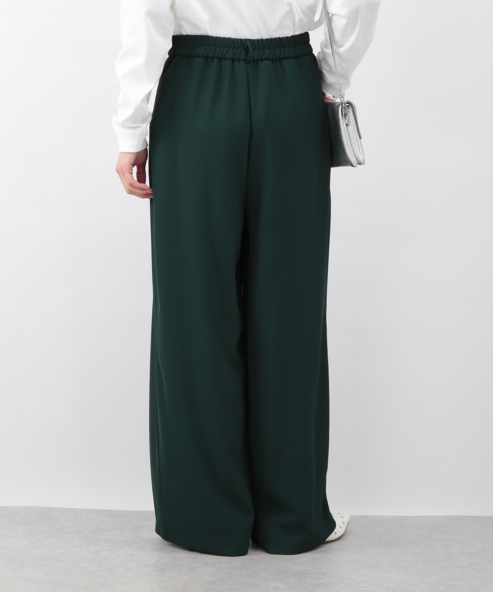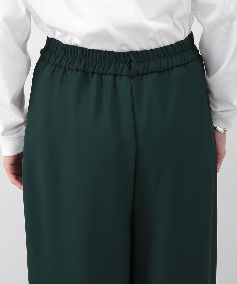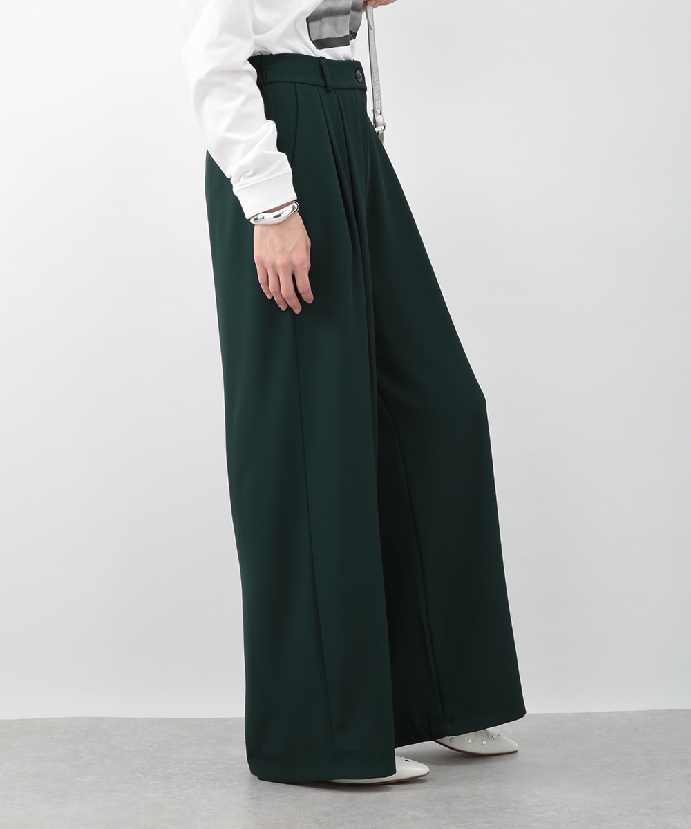 落ち感のある素材がつくる、しなやかなシルエットのワイドパンツ。フロントに入れたタックが立体感を生み、すっきりとした印象に仕上げています。深みのあるグリーンカラーが装いのアクセントに。コンパクトなトップスを合わせてバランス良く、ブラウスをインしてきれいめにも穿きやすい一枚です。
