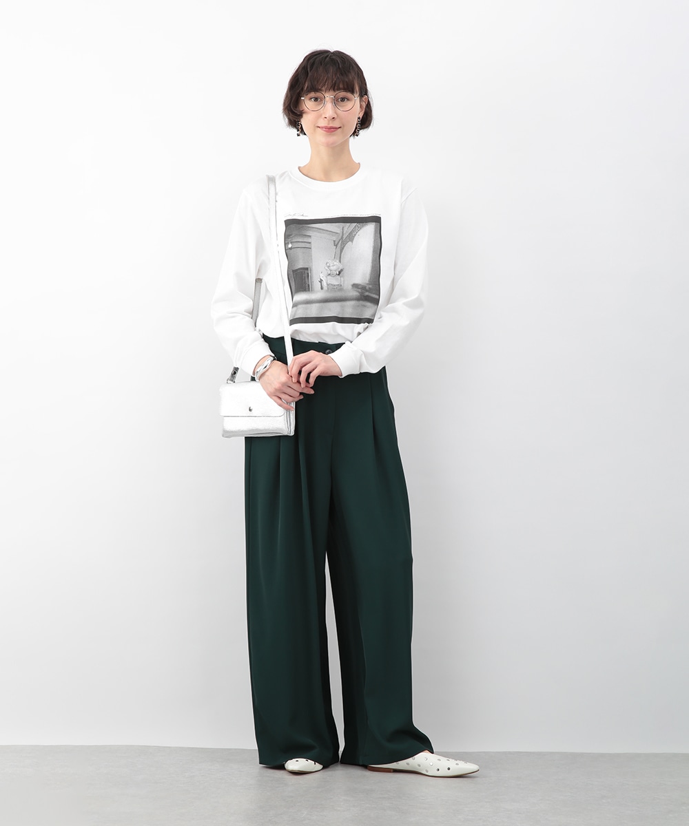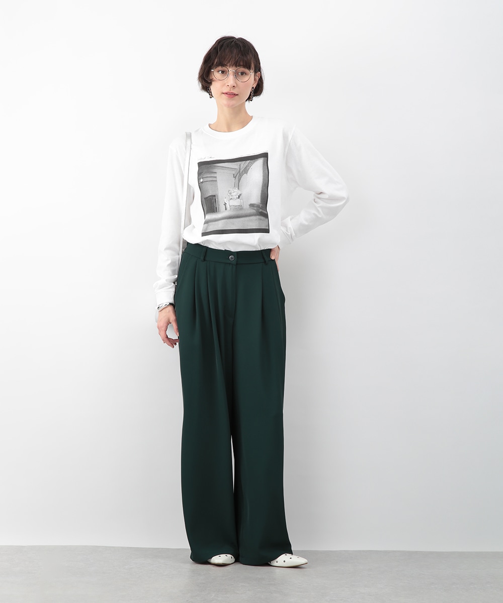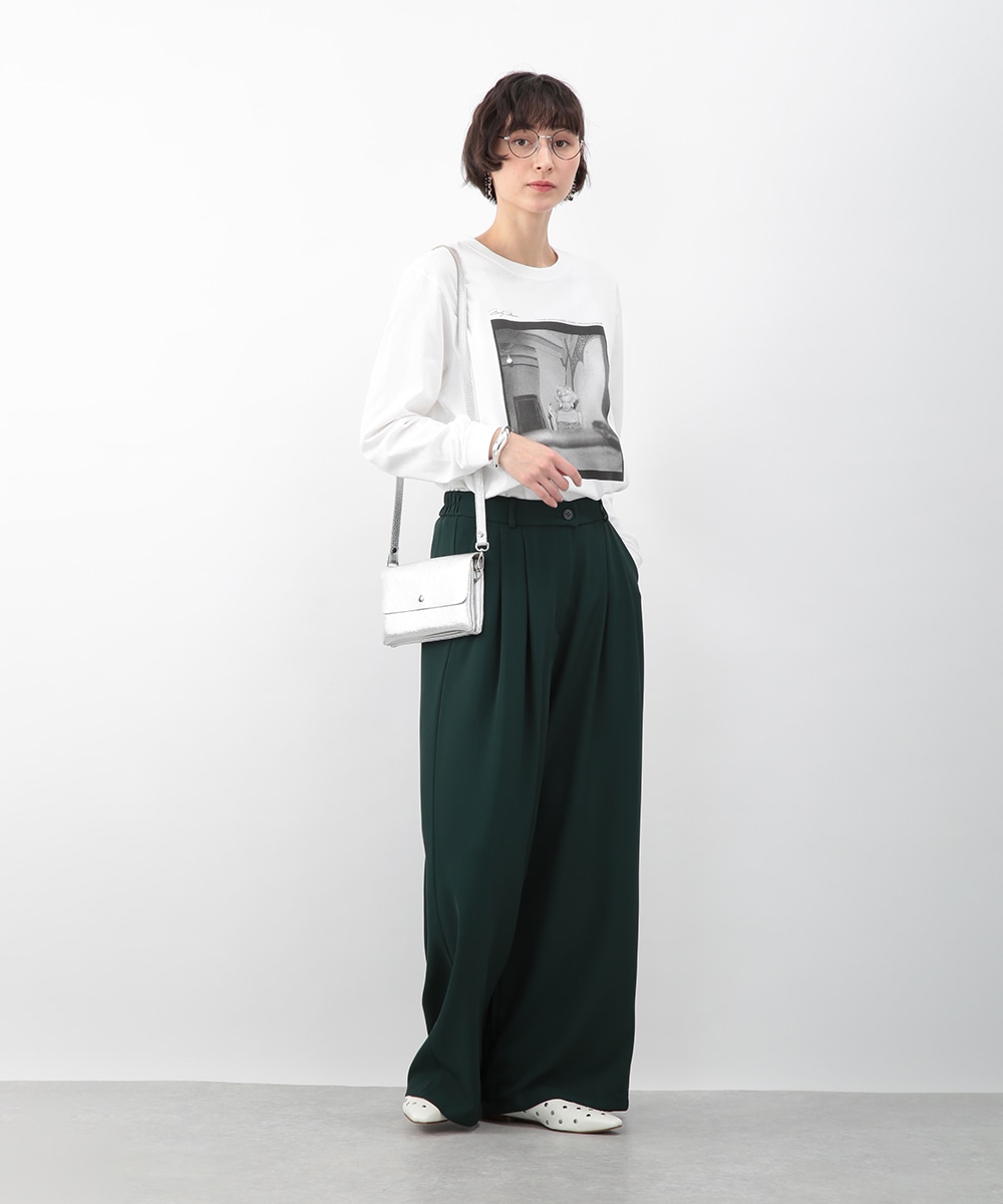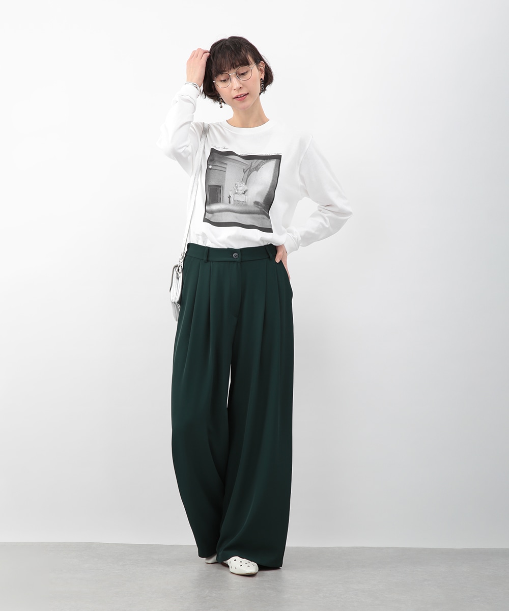 落ち感のある素材がつくる、しなやかなシルエットのワイドパンツ。フロントに入れたタックが立体感を生み、すっきりとした印象に仕上げています。深みのあるグリーンカラーが装いのアクセントに。コンパクトなトップスを合わせてバランス良く、ブラウスをインしてきれいめにも穿きやすい一枚です。