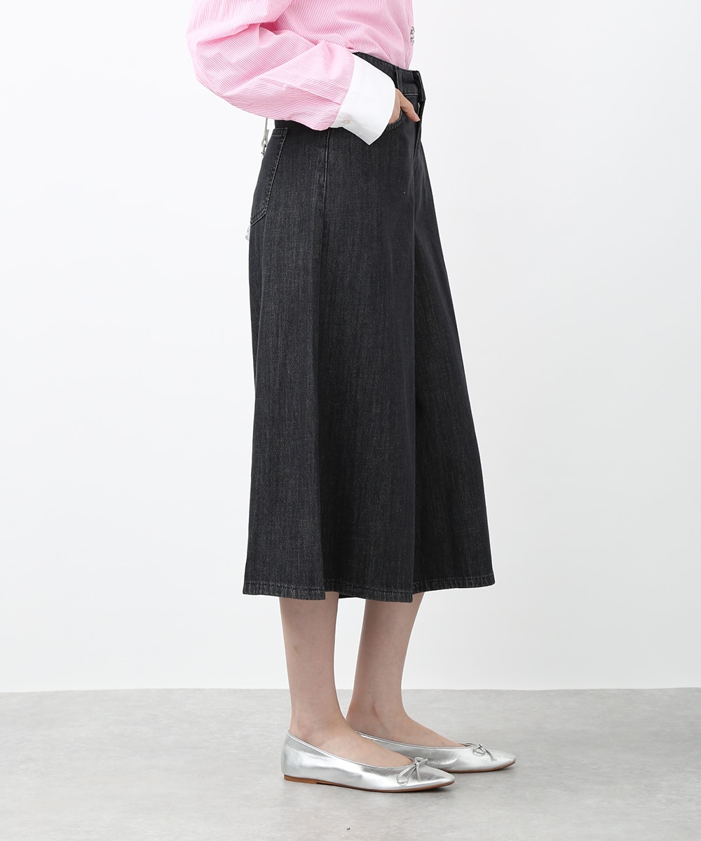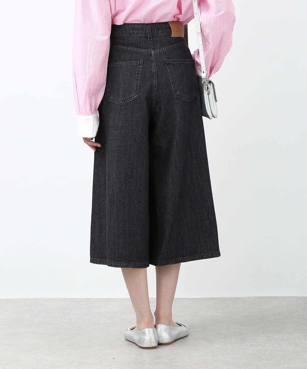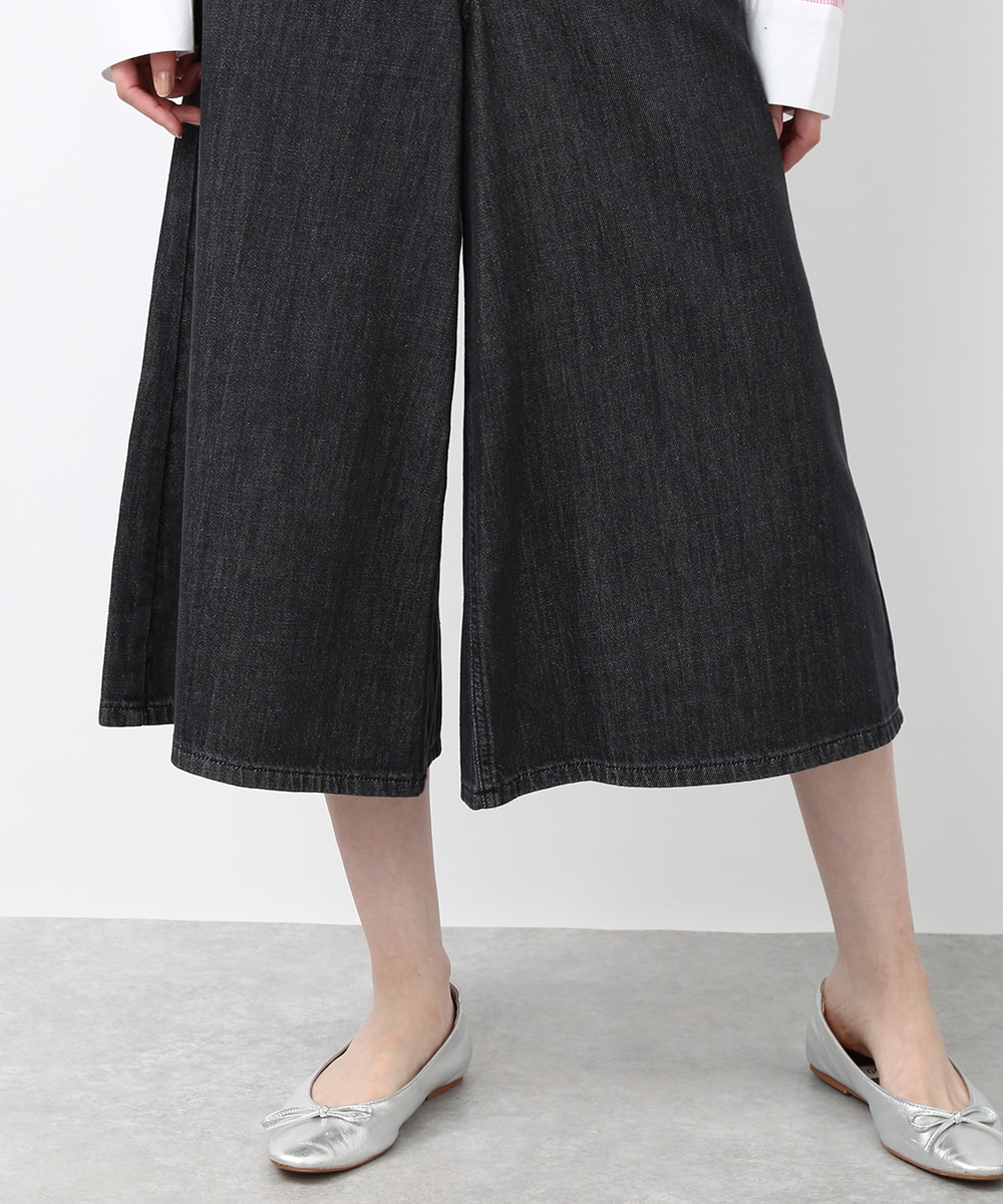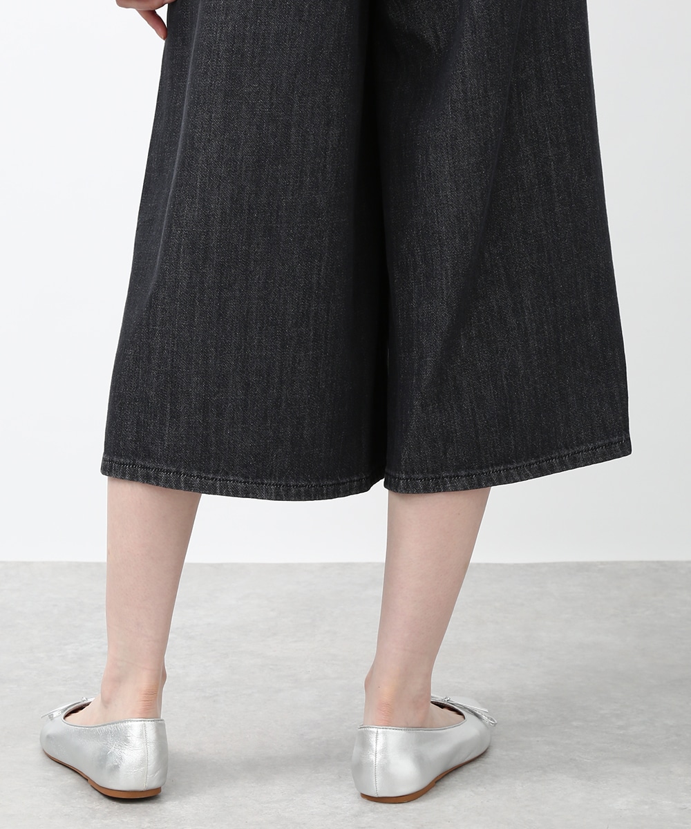 グレーカラーのデニムで仕立てたワイドキュロット。フレアに広がるシルエットが、カジュアルな中にやわらかな印象をプラスします。膝下丈でバランスが取りやすく、足元の合わせ次第で幅広いスタイリングが楽しめるのもポイント。シャツをインしてウエストまわりをすっきり見せ、程よくメリハリのある着こなしもおすすめです。