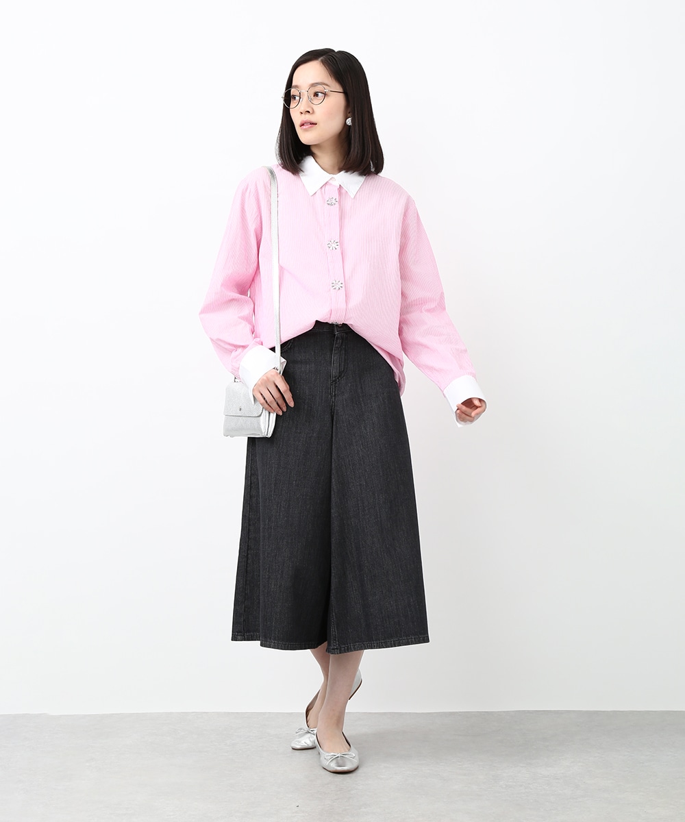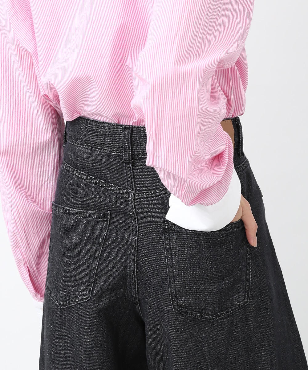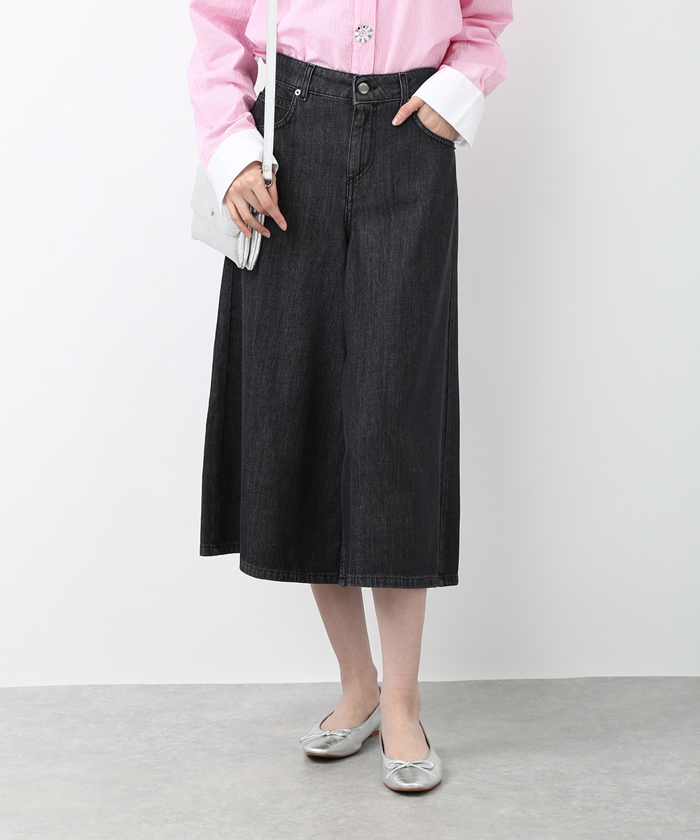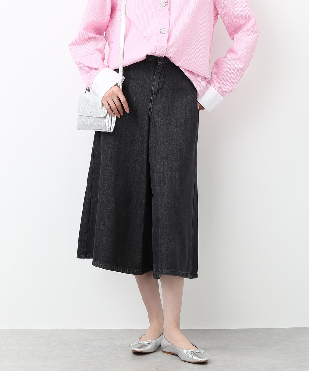 グレーカラーのデニムで仕立てたワイドキュロット。フレアに広がるシルエットが、カジュアルな中にやわらかな印象をプラスします。膝下丈でバランスが取りやすく、足元の合わせ次第で幅広いスタイリングが楽しめるのもポイント。シャツをインしてウエストまわりをすっきり見せ、程よくメリハリのある着こなしもおすすめです。