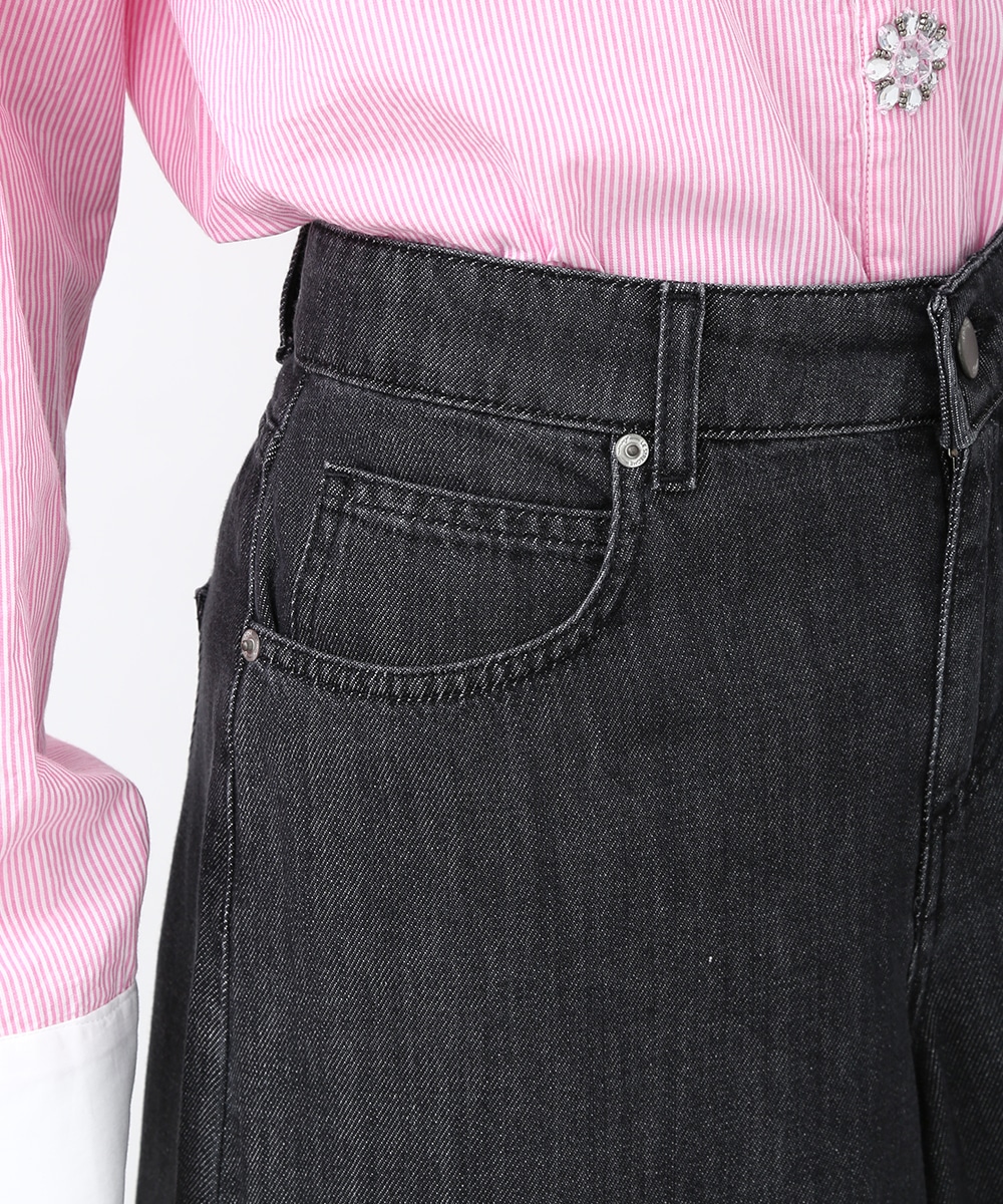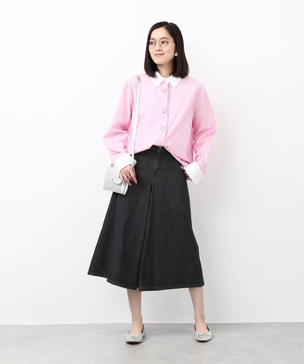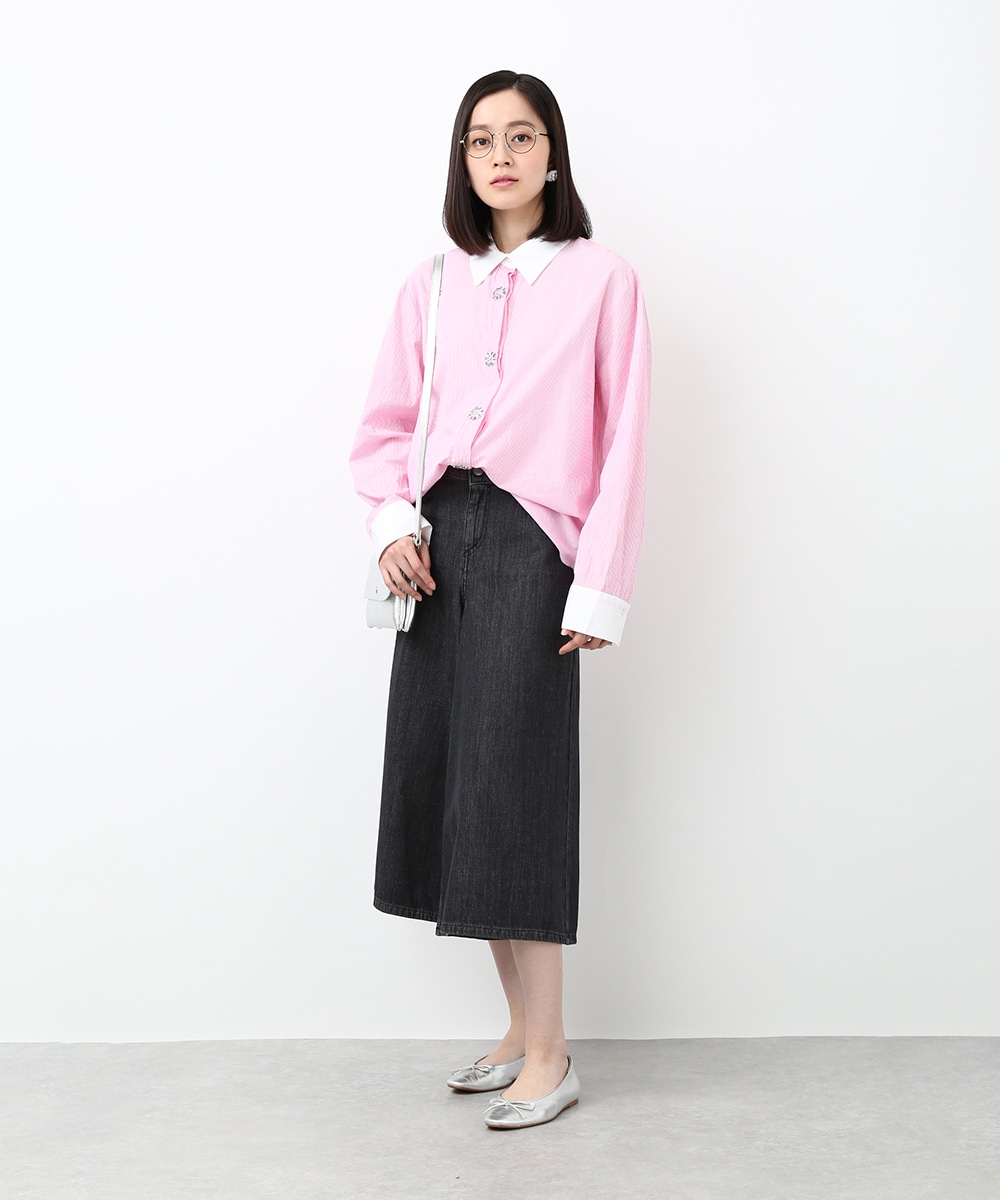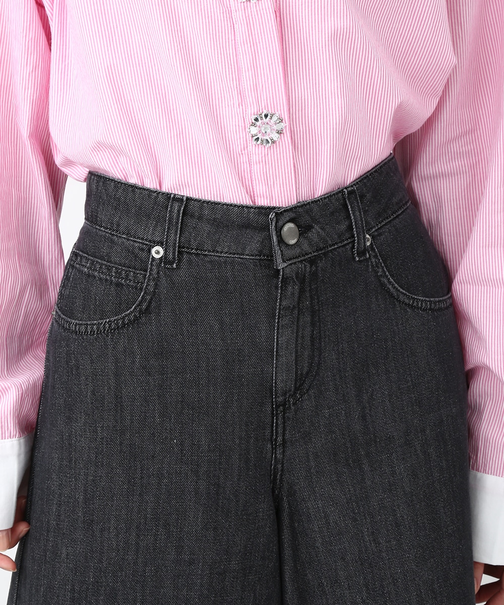 グレーカラーのデニムで仕立てたワイドキュロット。フレアに広がるシルエットが、カジュアルな中にやわらかな印象をプラスします。膝下丈でバランスが取りやすく、足元の合わせ次第で幅広いスタイリングが楽しめるのもポイント。シャツをインしてウエストまわりをすっきり見せ、程よくメリハリのある着こなしもおすすめです。