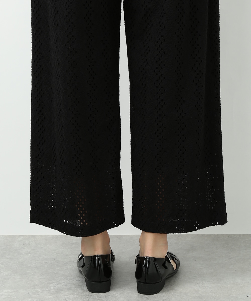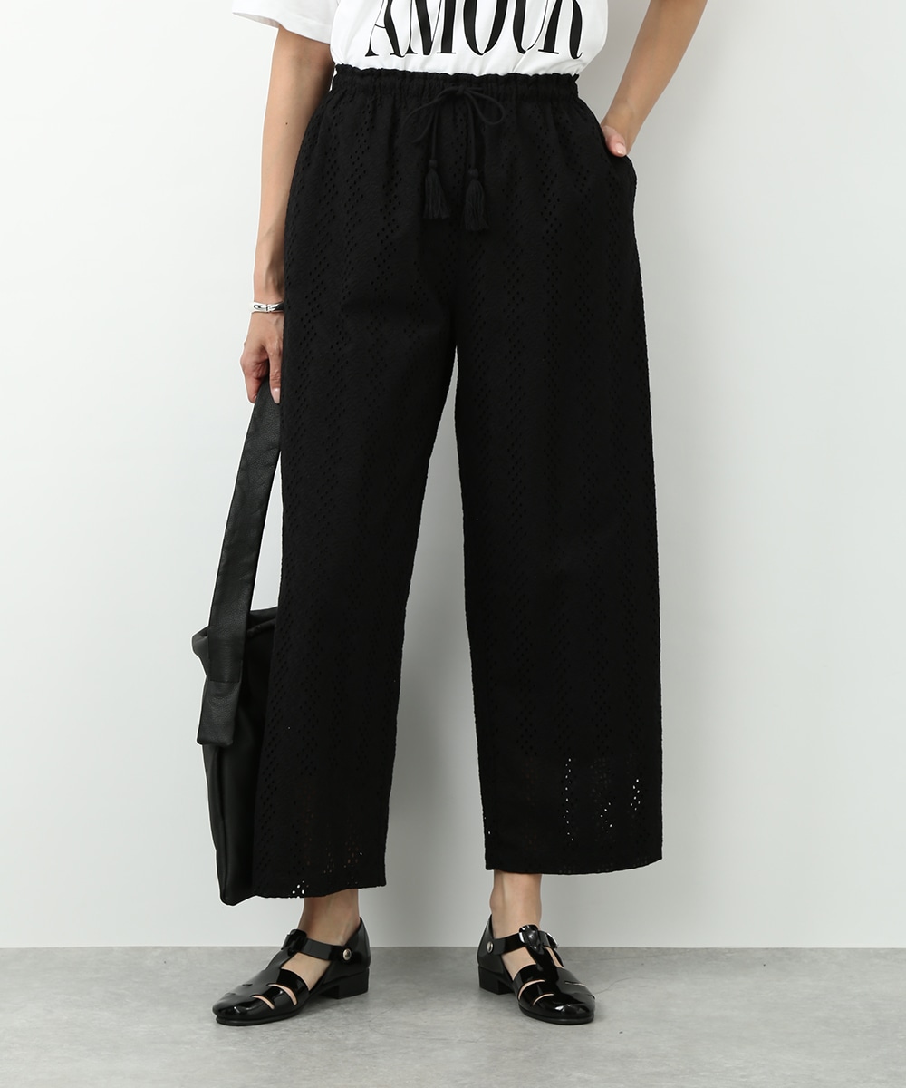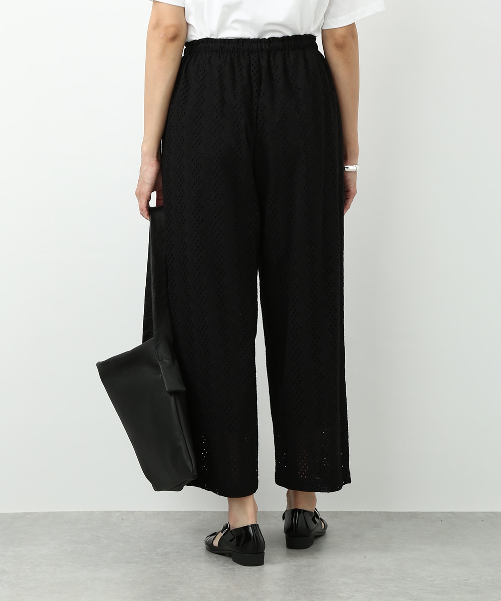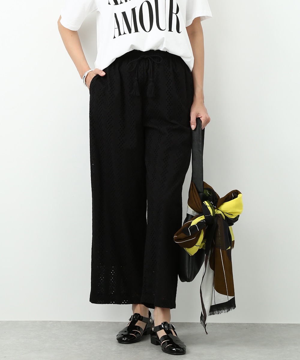 贅沢にアイレット刺繍を施したコットン100%素材のパンツ。通気性のよいナチュラルな風合いで、涼しく取り入れやすい仕上がりです。ロゴTを合わせてラフさをプラスしつつ、刺繍の表情で大人カジュアルにまとめた着こなしもおすすめです。シンプルな中にさりげない華やかさを加えてくれます。