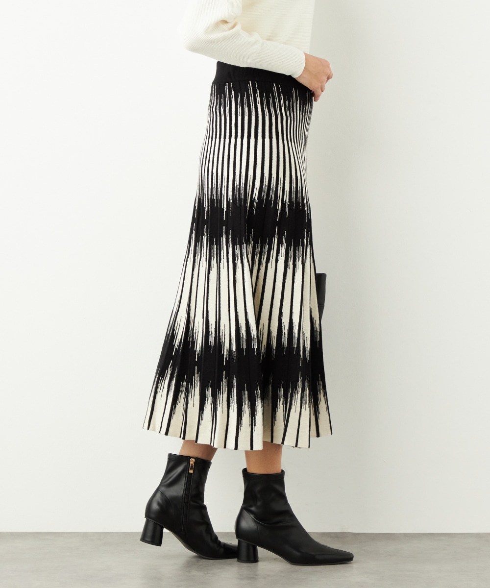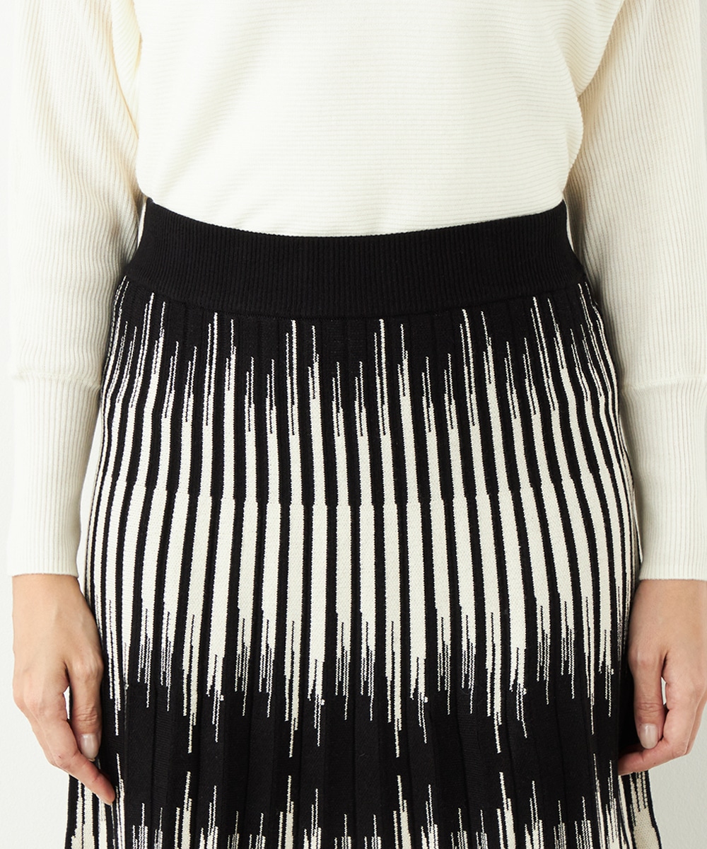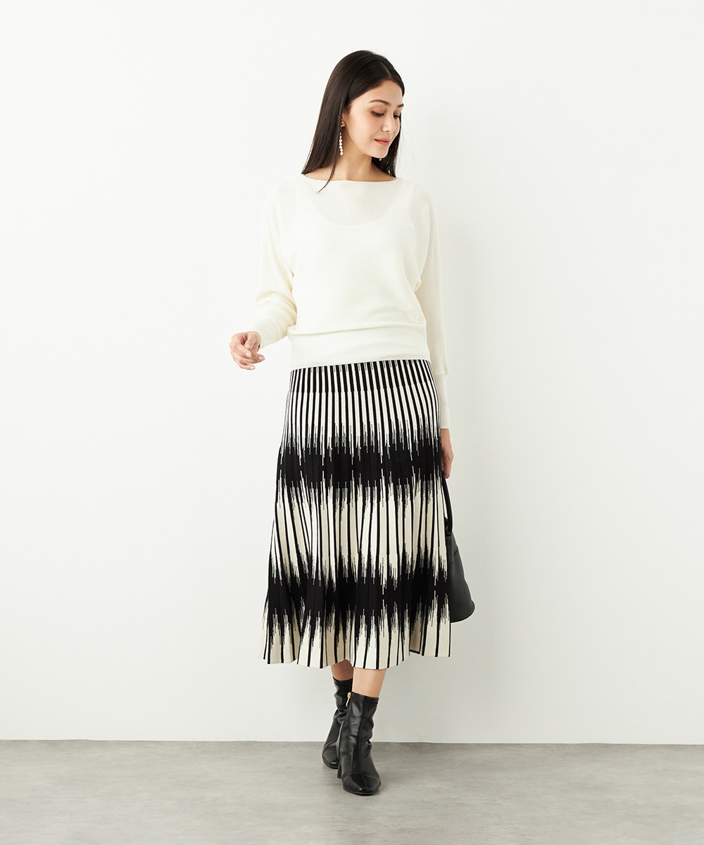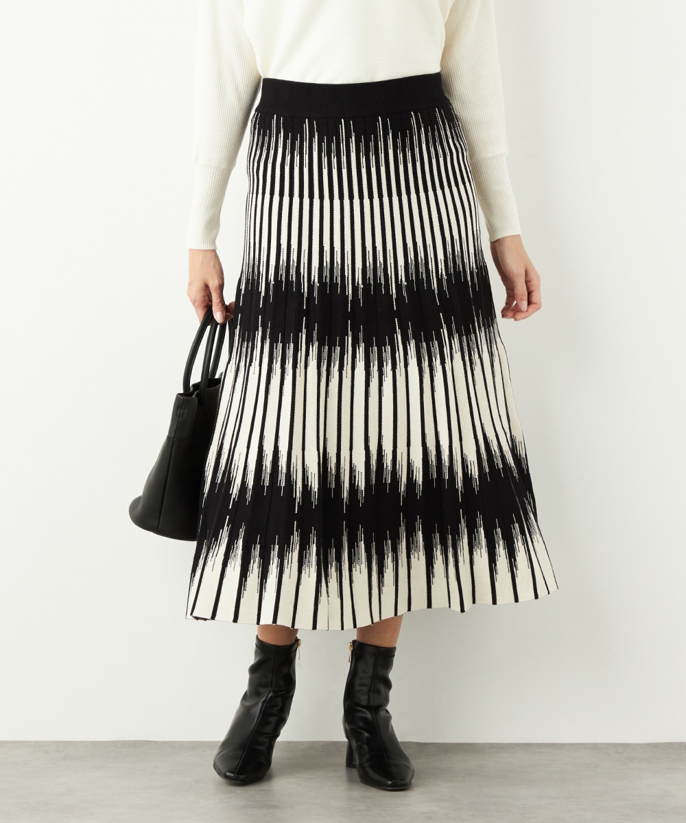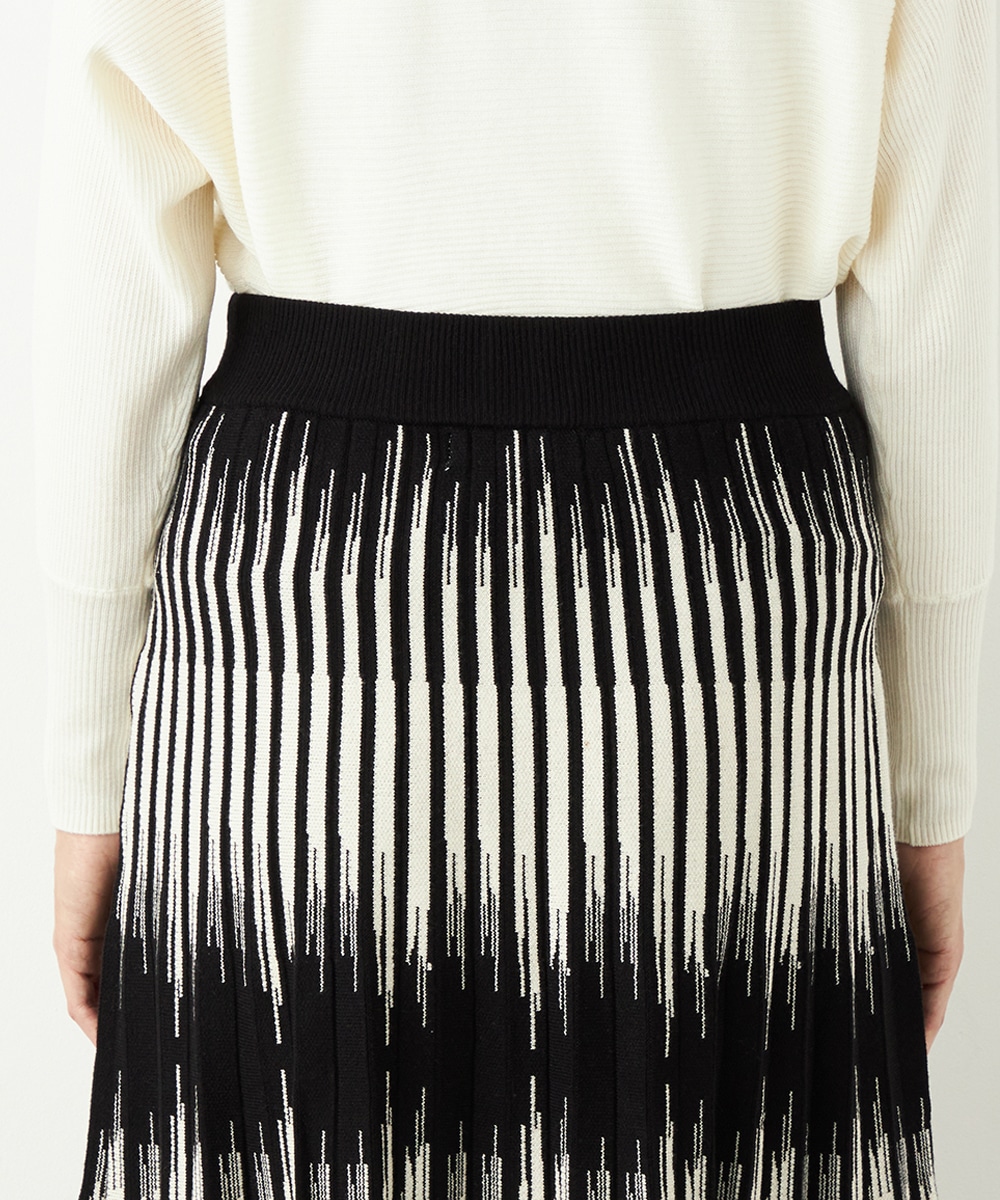パネルデザインのぼかし柄が独特の雰囲気を漂わせます。モノトーンカラーでトップスを選ばず、幅広いアレンジが可能です。ウエスト部分はすっきりと仕上げつつ、裾に向かってきれいに広がるフレアシルエットを作り出しました。上品さがある長めの着丈を採用しています。