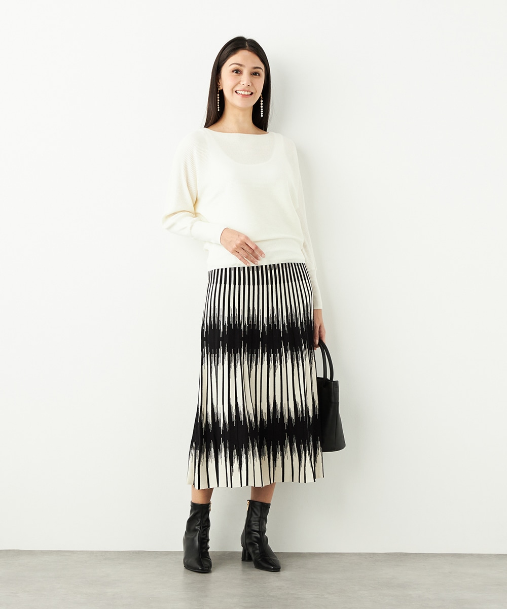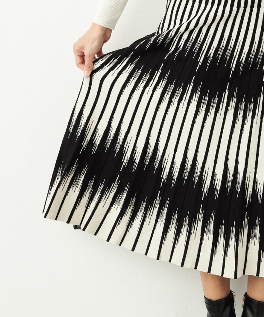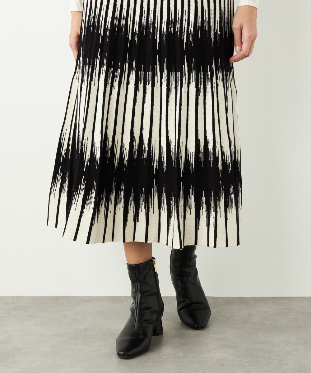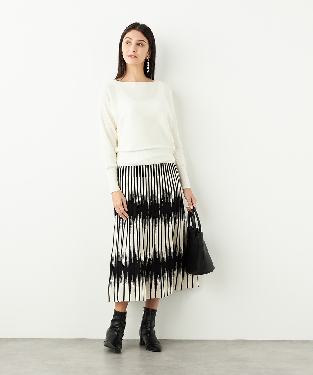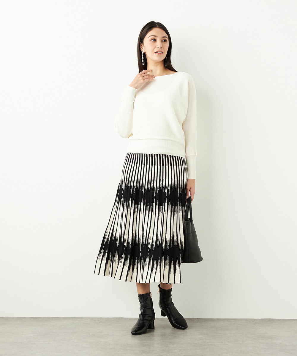 パネルデザインのぼかし柄が独特の雰囲気を漂わせます。モノトーンカラーでトップスを選ばず、幅広いアレンジが可能です。ウエスト部分はすっきりと仕上げつつ、裾に向かってきれいに広がるフレアシルエットを作り出しました。上品さがある長めの着丈を採用しています。