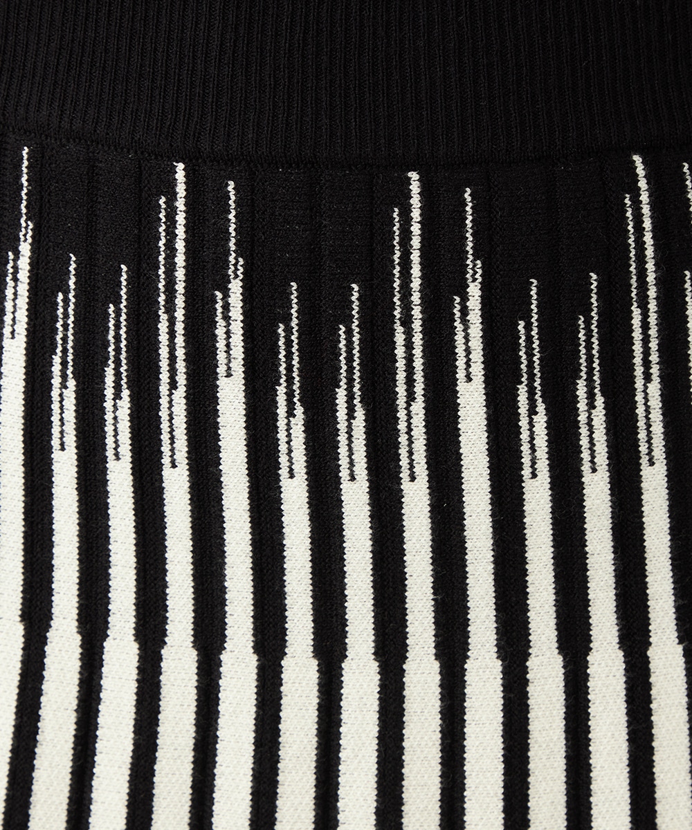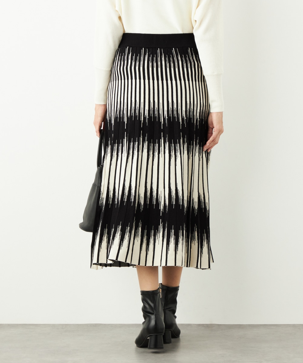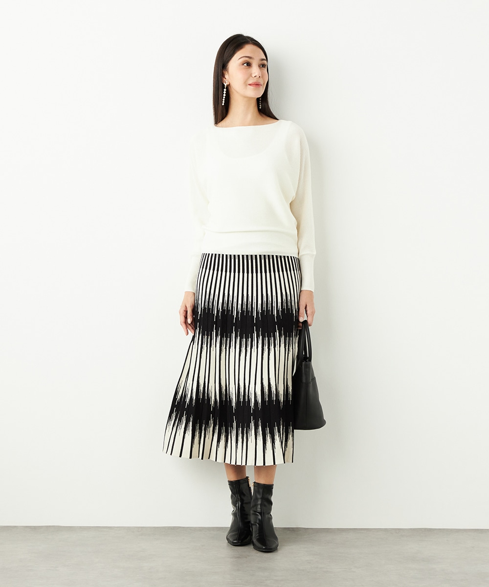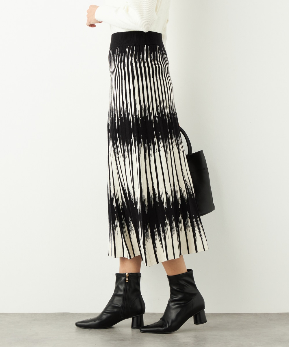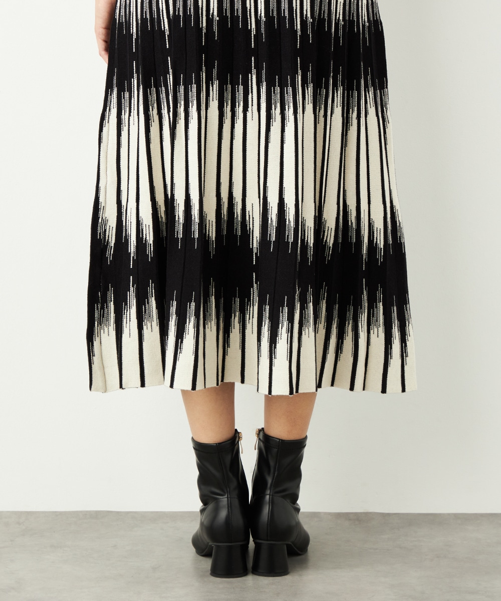 パネルデザインのぼかし柄が独特の雰囲気を漂わせます。モノトーンカラーでトップスを選ばず、幅広いアレンジが可能です。ウエスト部分はすっきりと仕上げつつ、裾に向かってきれいに広がるフレアシルエットを作り出しました。上品さがある長めの着丈を採用しています。