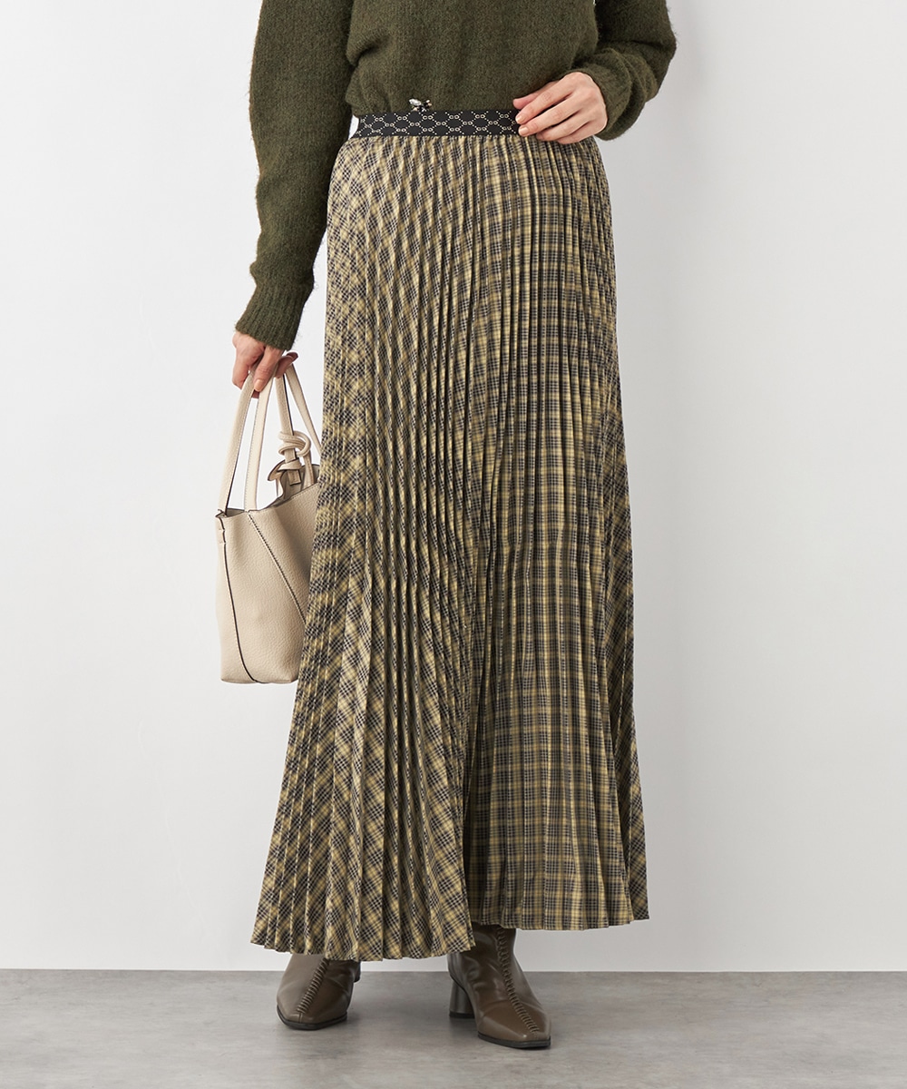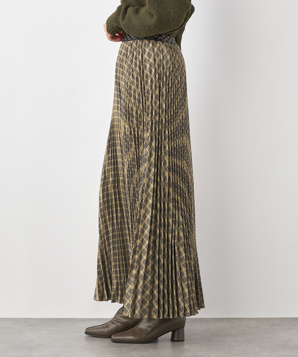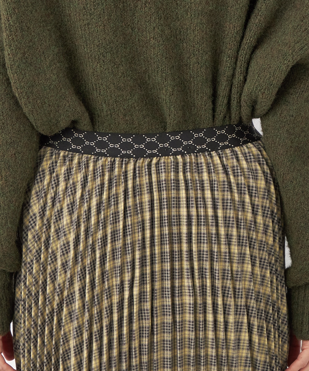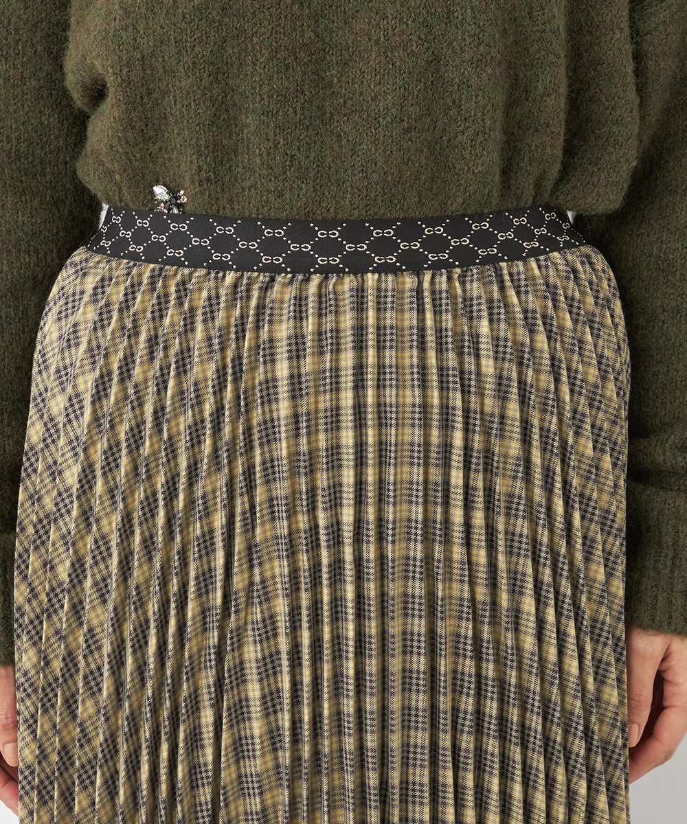 細かなプリーツにより動いた際の揺れ感がきれいに出て、フェミニンさを引き立てます。エレガントに穿きこなせるミディ丈のデザインです。ウエストバンドは幾何学的な柄のゴムバンドで切り替えて、細部にまでこだわって仕上げています。フィット感良く着用できるのも魅力です。