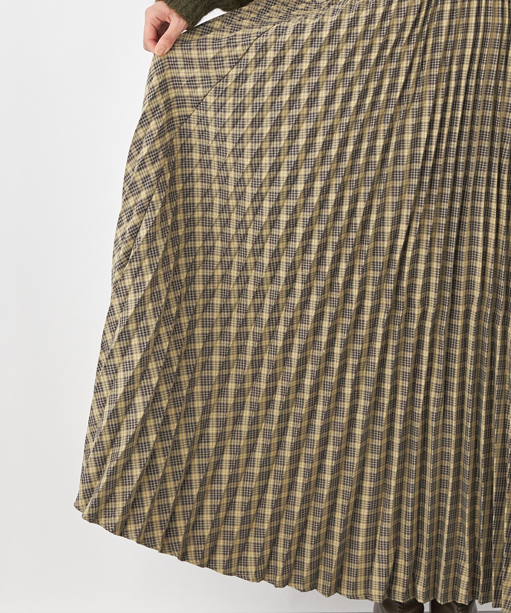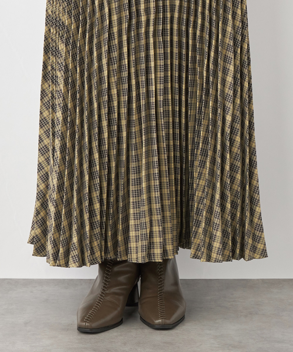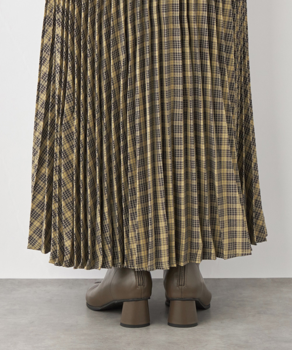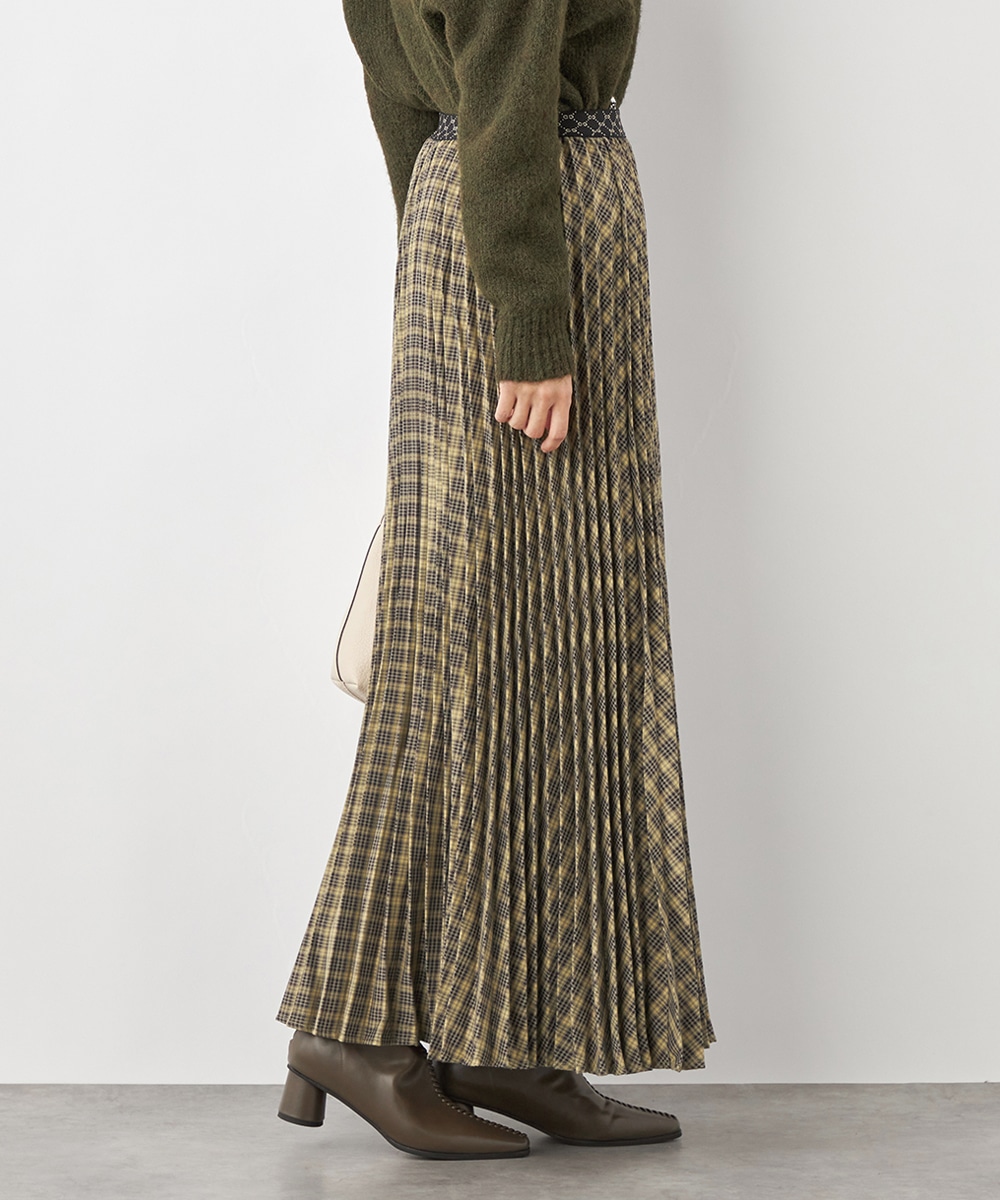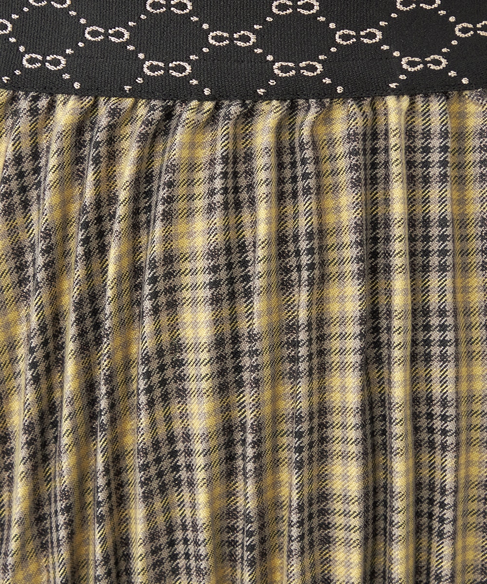 細かなプリーツにより動いた際の揺れ感がきれいに出て、フェミニンさを引き立てます。エレガントに穿きこなせるミディ丈のデザインです。ウエストバンドは幾何学的な柄のゴムバンドで切り替えて、細部にまでこだわって仕上げています。フィット感良く着用できるのも魅力です。