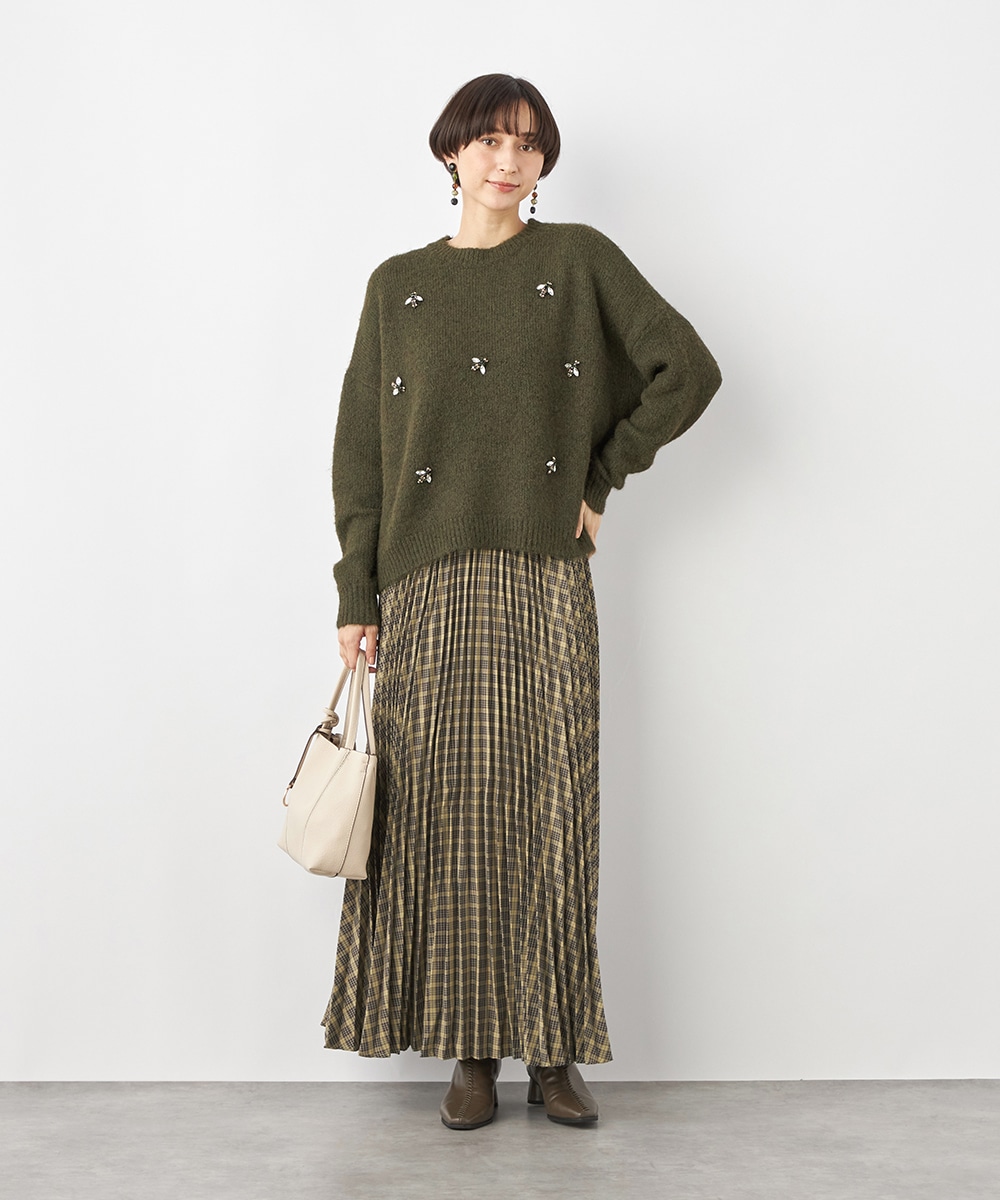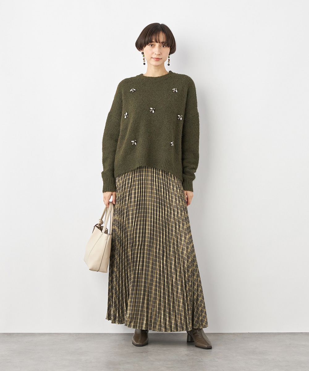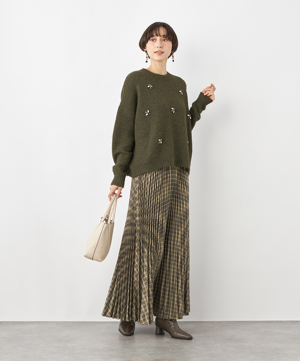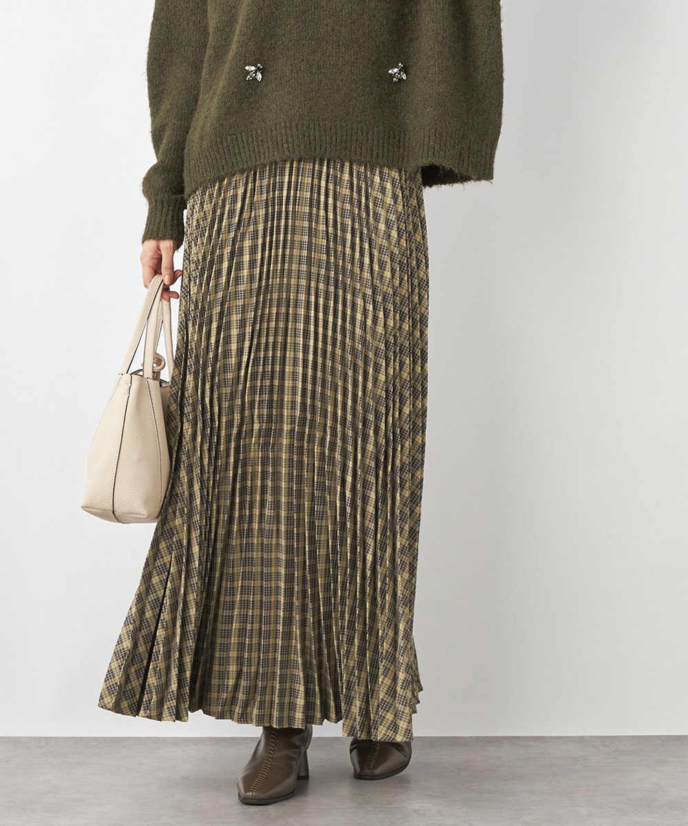 細かなプリーツにより動いた際の揺れ感がきれいに出て、フェミニンさを引き立てます。エレガントに穿きこなせるミディ丈のデザインです。ウエストバンドは幾何学的な柄のゴムバンドで切り替えて、細部にまでこだわって仕上げています。フィット感良く着用できるのも魅力です。