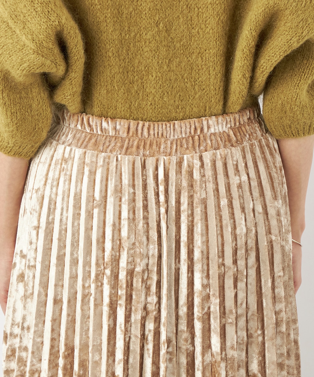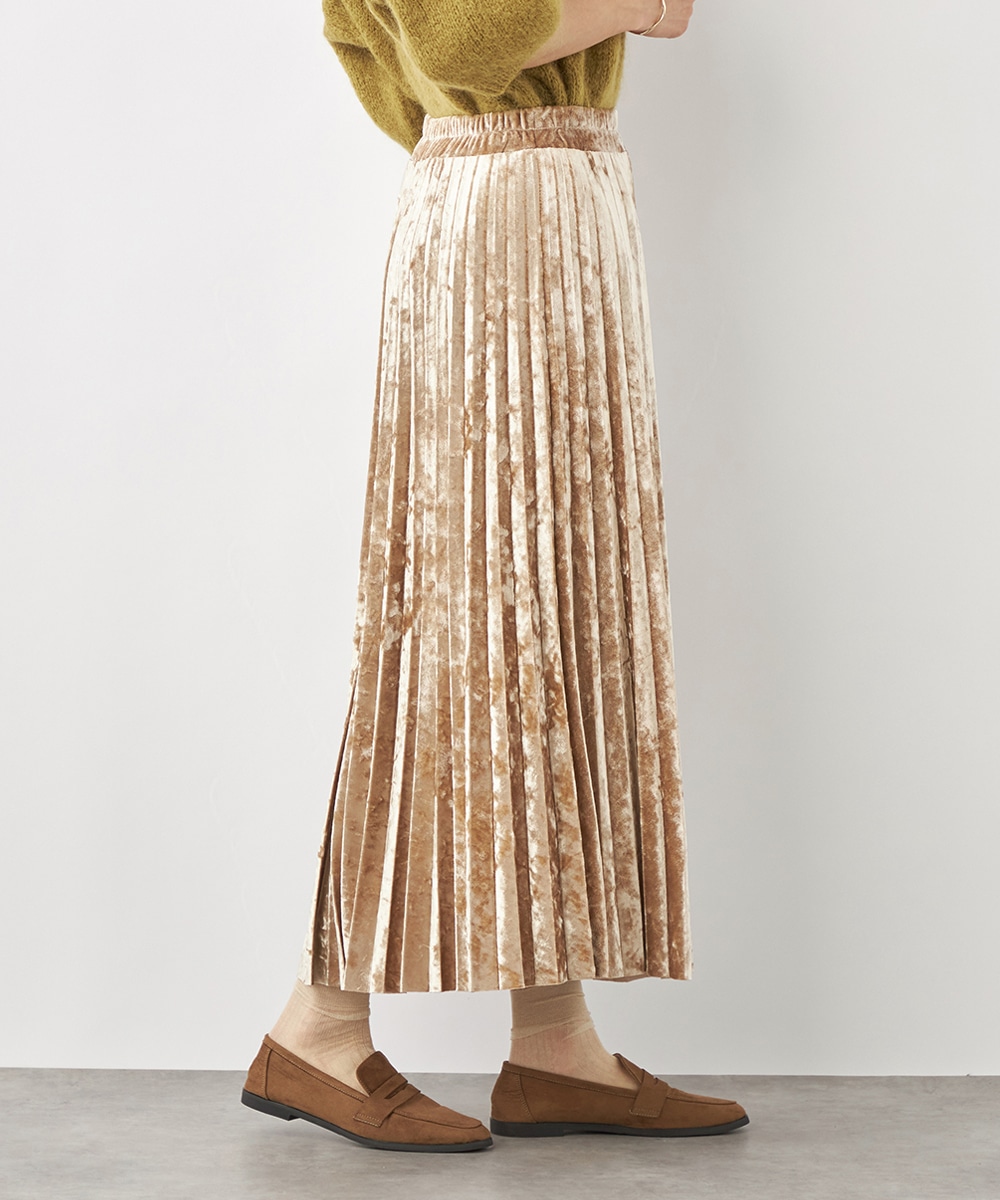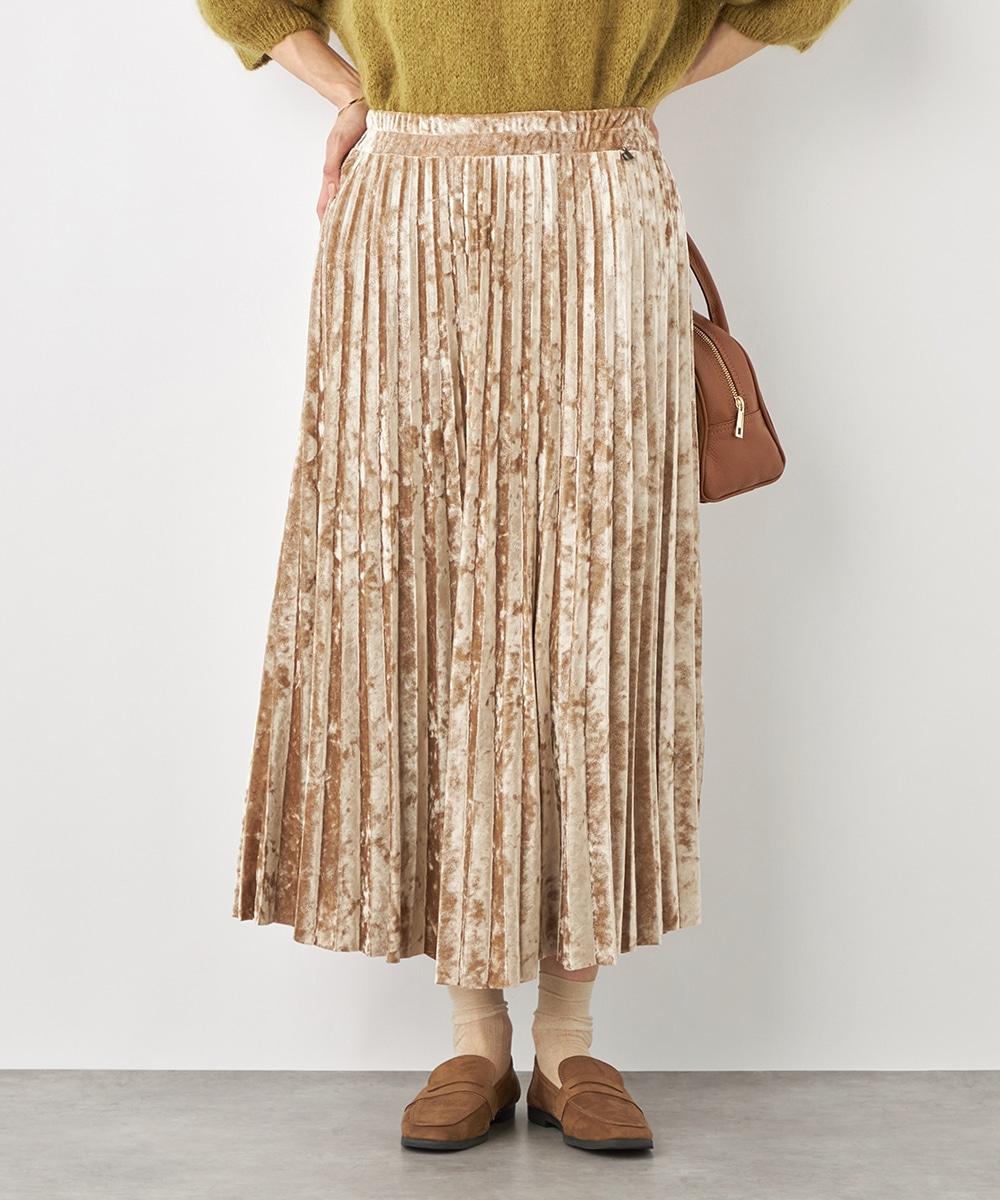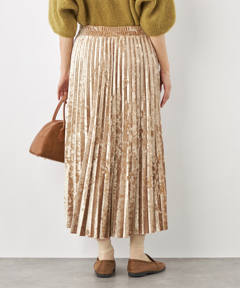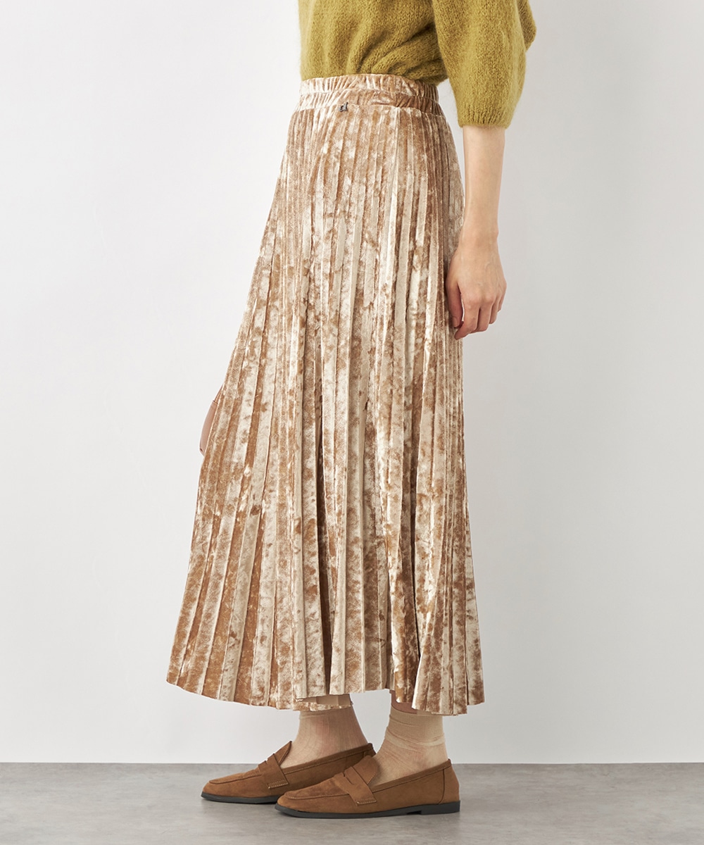 ベーシックなデザインに素材感やきれいな光沢が際立ちます。細かなプリーツが施されており、動いた際に揺れ感が出てエレガントな印象です。大人っぽく落ち着いたコーディネートに仕上がる長めの着丈を採用。ウエストは総ゴム仕様でフィット感が良く、快適な穿き心地です。