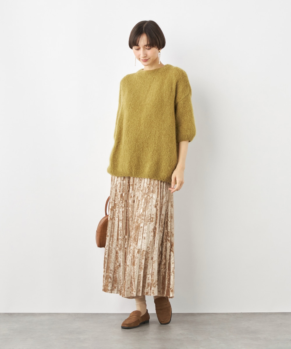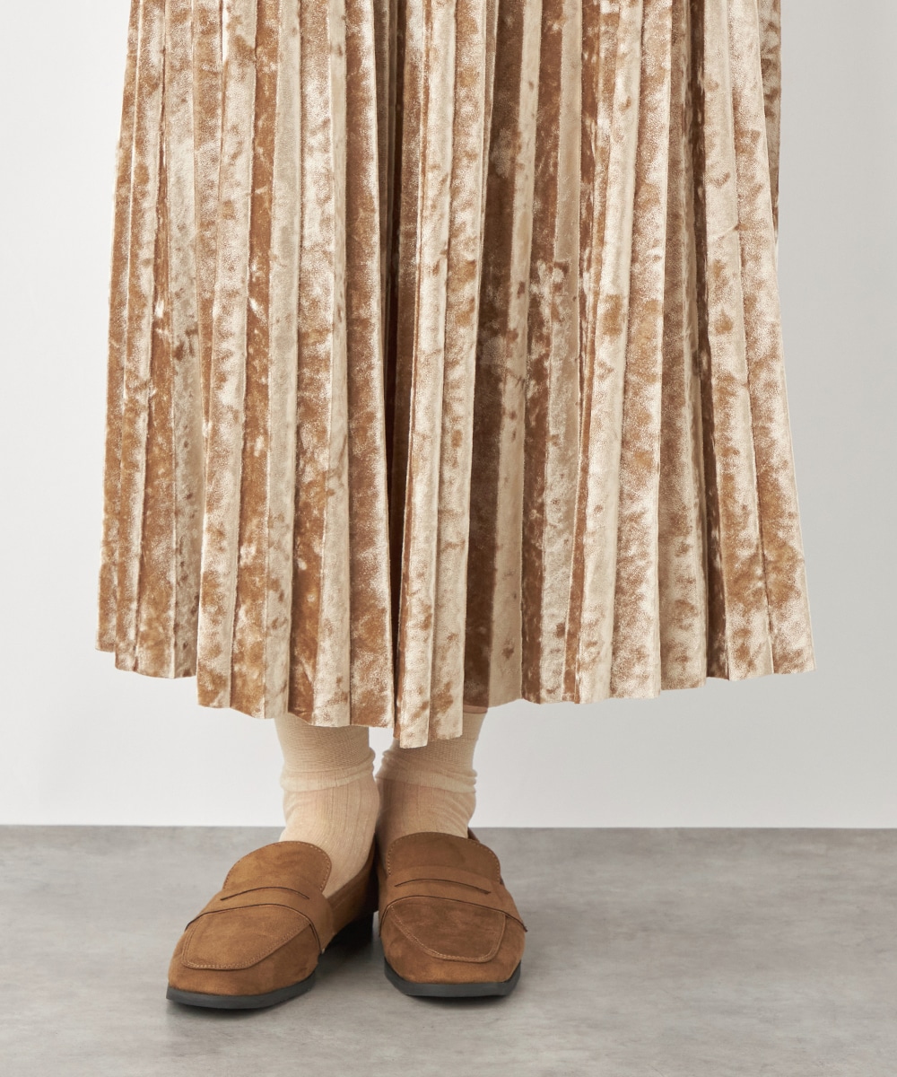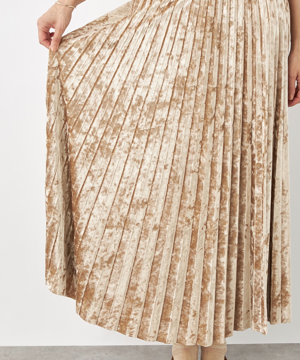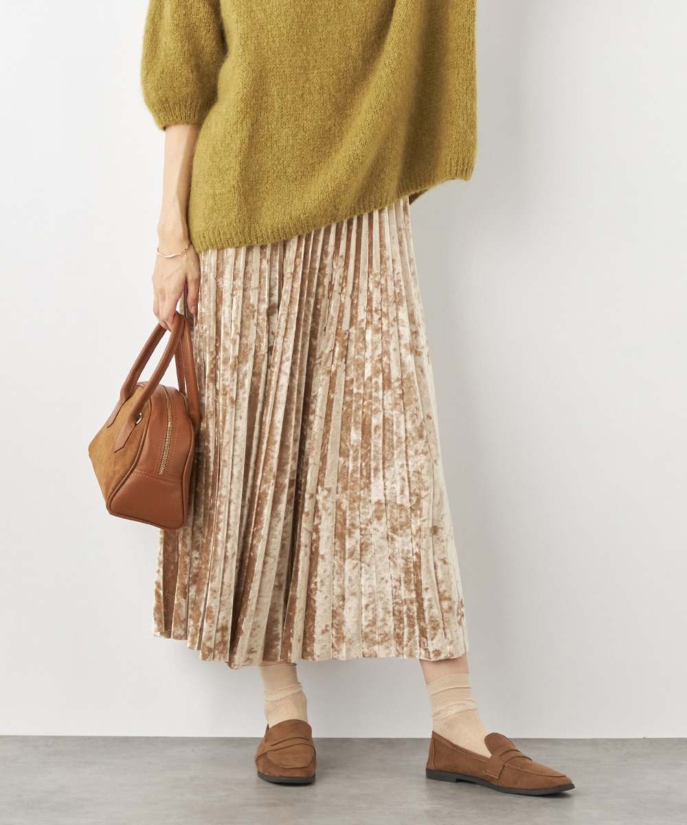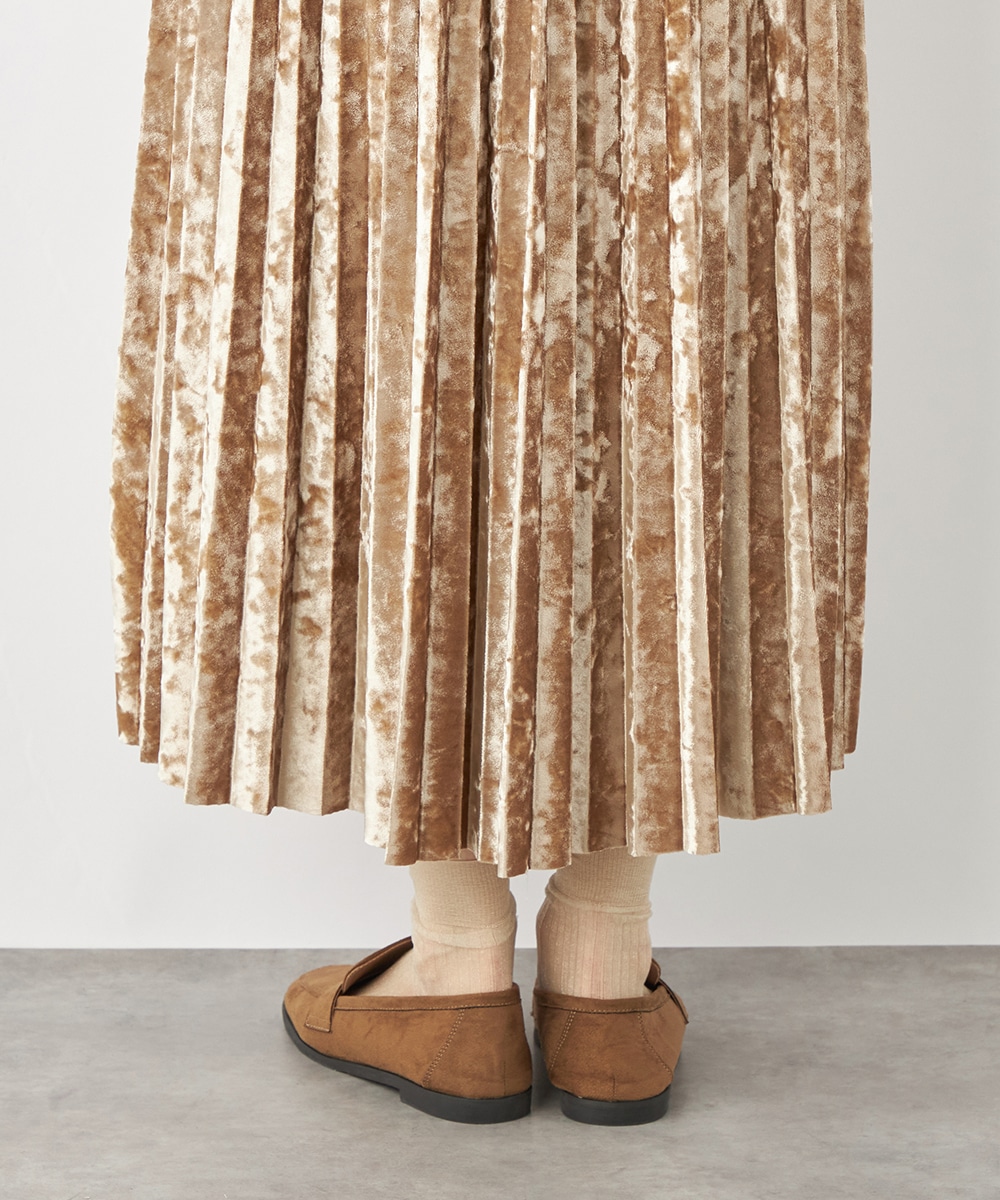 ベーシックなデザインに素材感やきれいな光沢が際立ちます。細かなプリーツが施されており、動いた際に揺れ感が出てエレガントな印象です。大人っぽく落ち着いたコーディネートに仕上がる長めの着丈を採用。ウエストは総ゴム仕様でフィット感が良く、快適な穿き心地です。