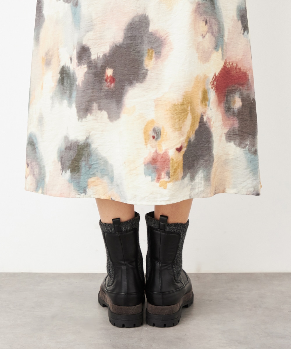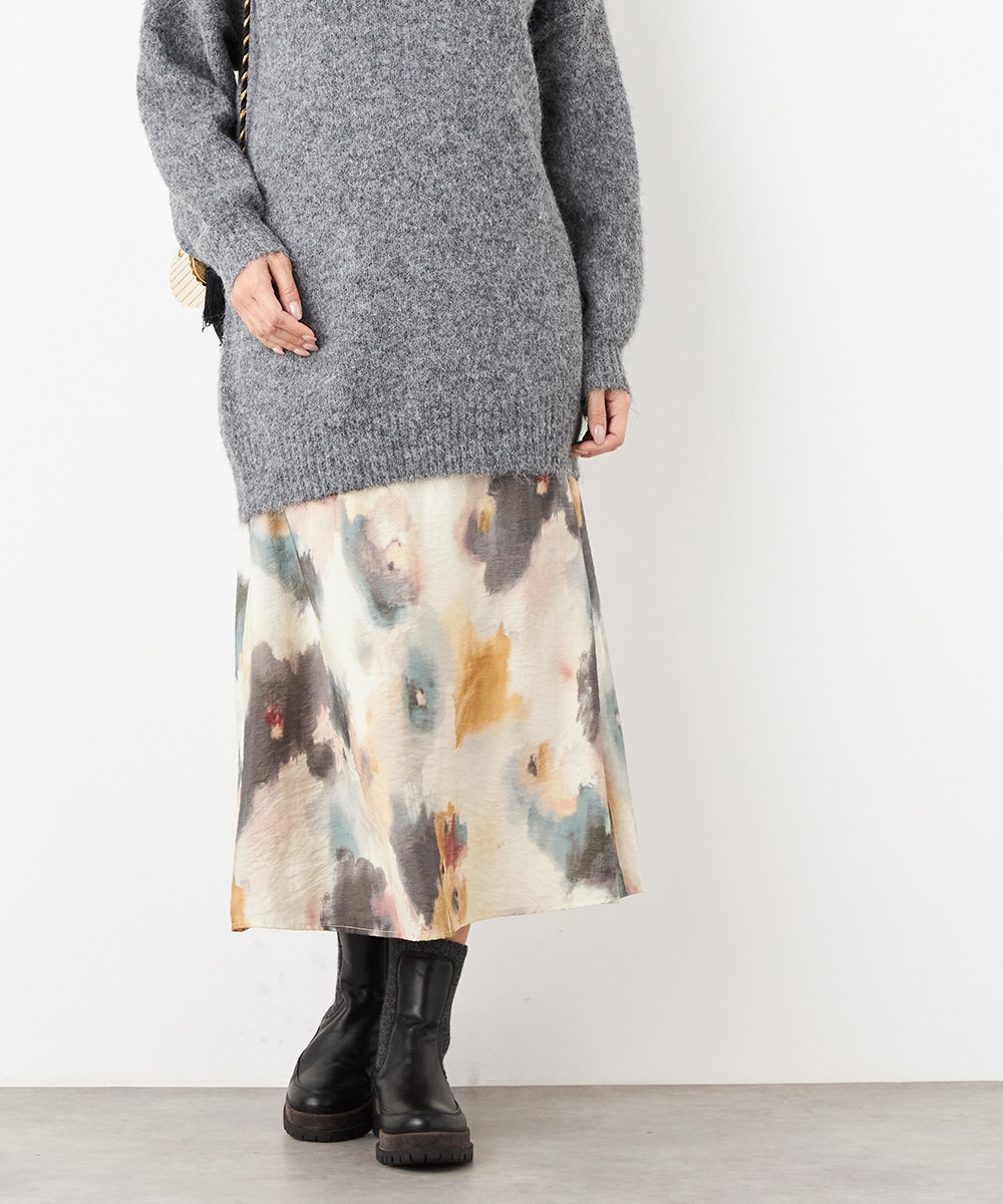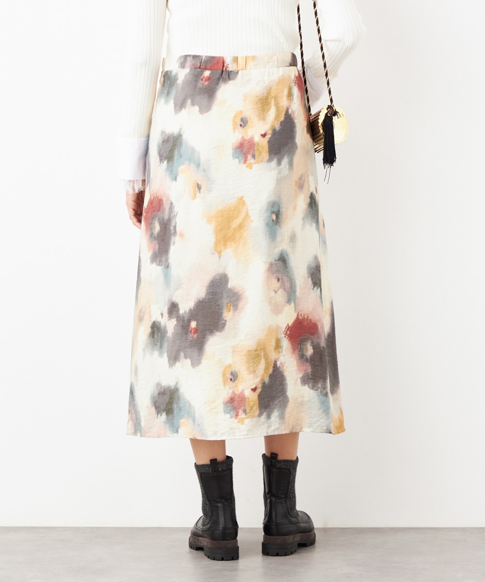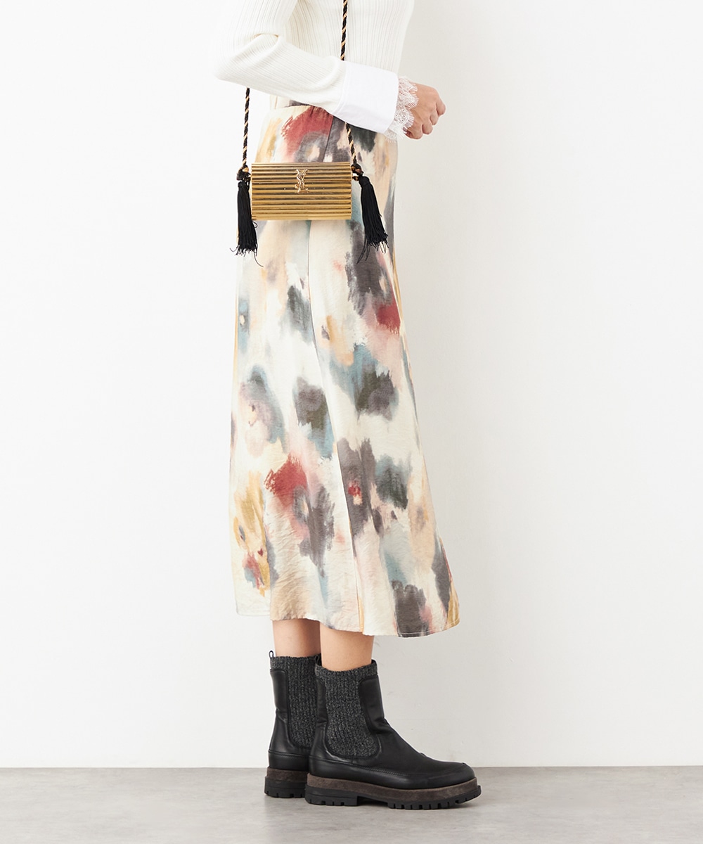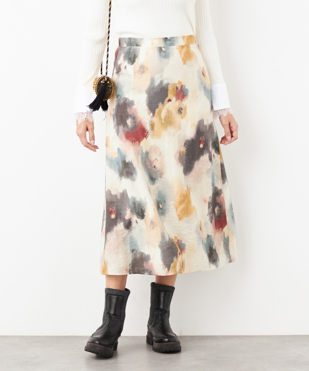 穿きこなしやすい、適度なボリューム感のフレアシルエットです。お腹回りがすっきりと見えて、ニットと合わせても好バランスのコーディネートを楽しめます。上品さがあり、お出かけにも適したロング丈のデザインです。後ろウエストにはゴムが入ってフィット感良く着用できます。