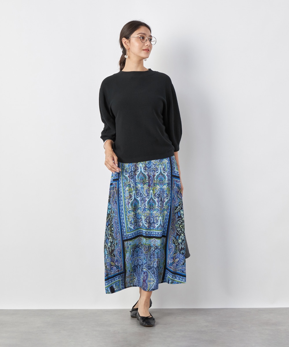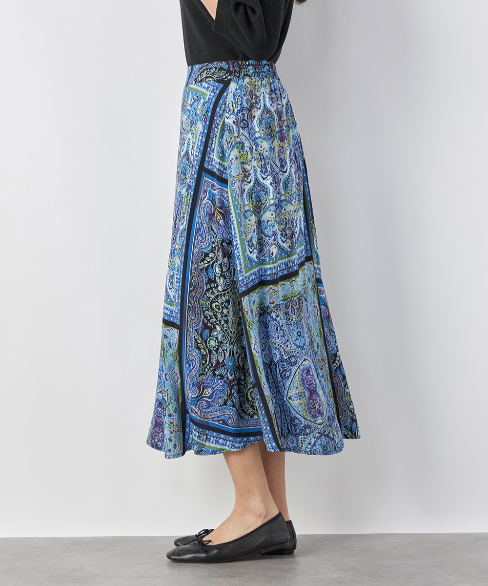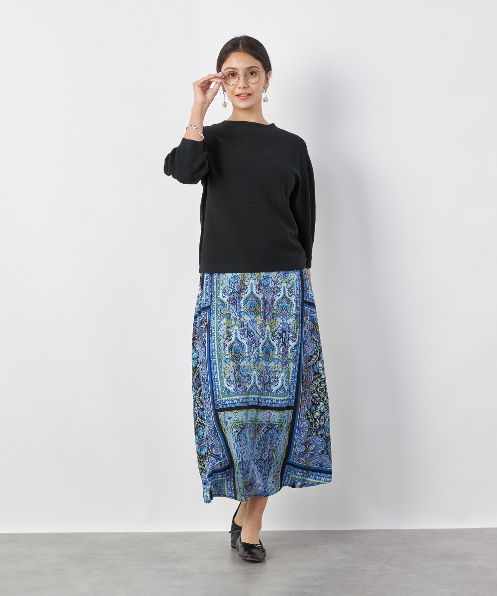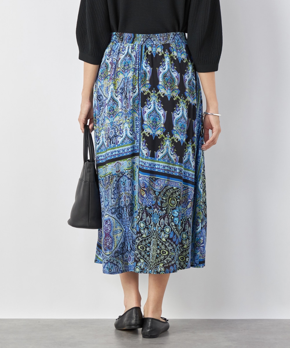 裾に向かってきれいに広がるよう、シルエットにこだわっています。ウエスト回りがすっきりと見えるのもポイントです。大人っぽくエレガントに穿きこなせる長めの丈感。生地はソフトな風合いを持ち、ドレープがエレガントな印象です。後ろウエストにゴムが入り、フィット感良く着用できます。