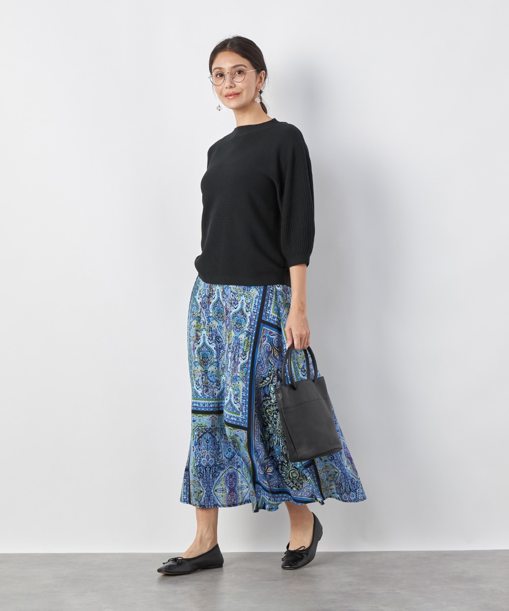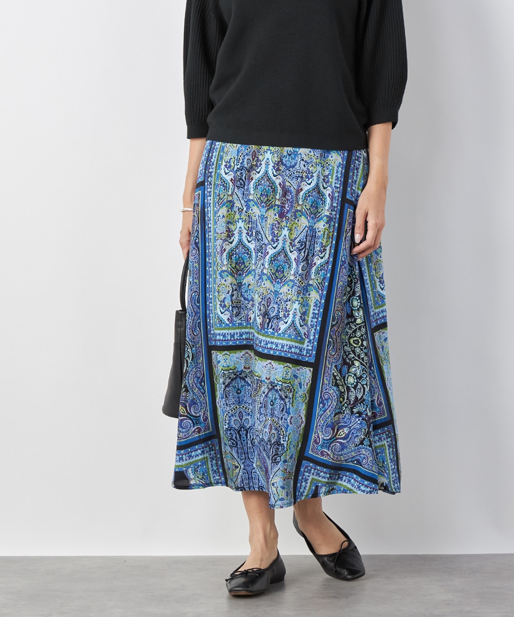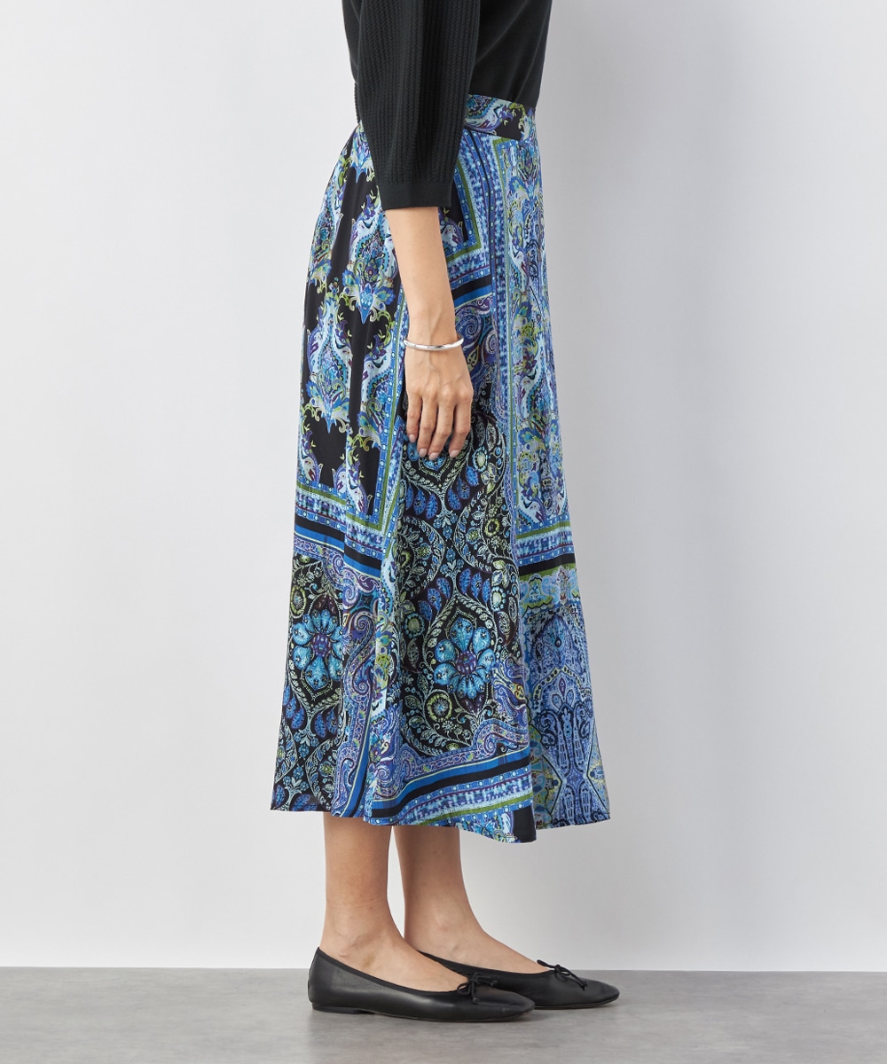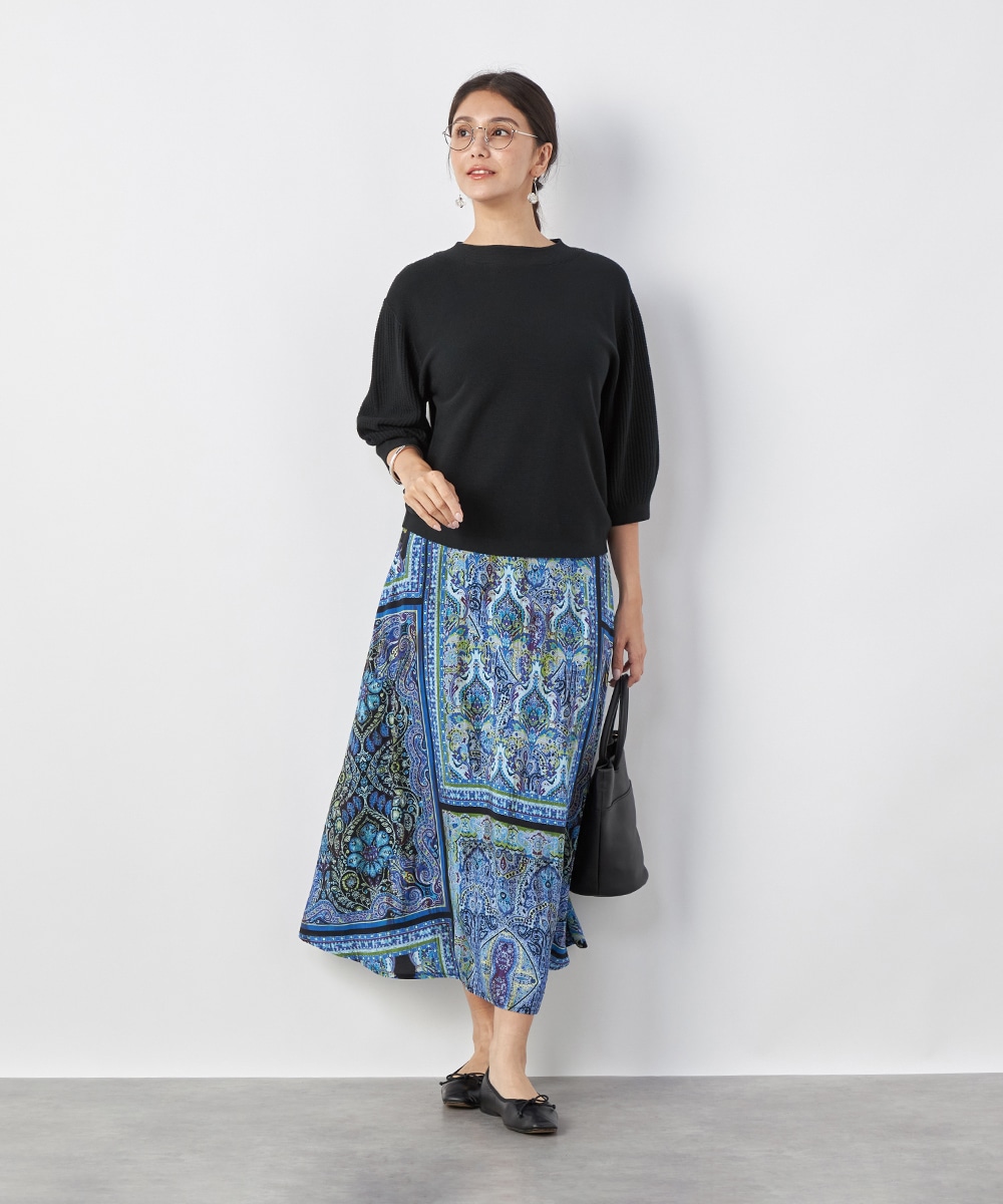 裾に向かってきれいに広がるよう、シルエットにこだわっています。ウエスト回りがすっきりと見えるのもポイントです。大人っぽくエレガントに穿きこなせる長めの丈感。生地はソフトな風合いを持ち、ドレープがエレガントな印象です。後ろウエストにゴムが入り、フィット感良く着用できます。