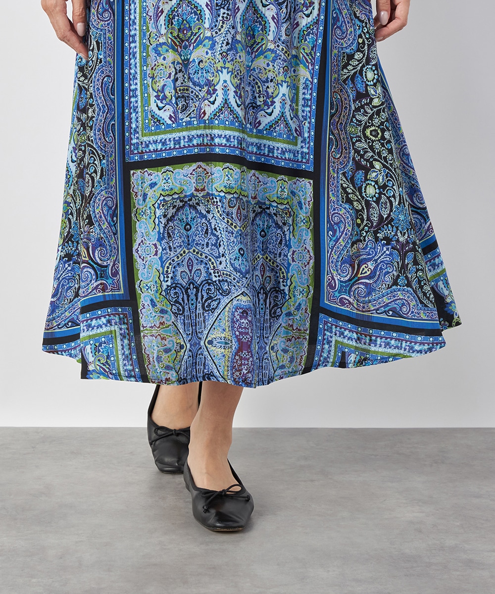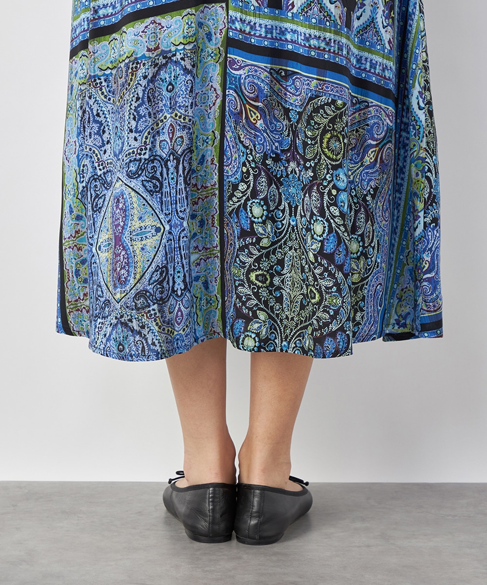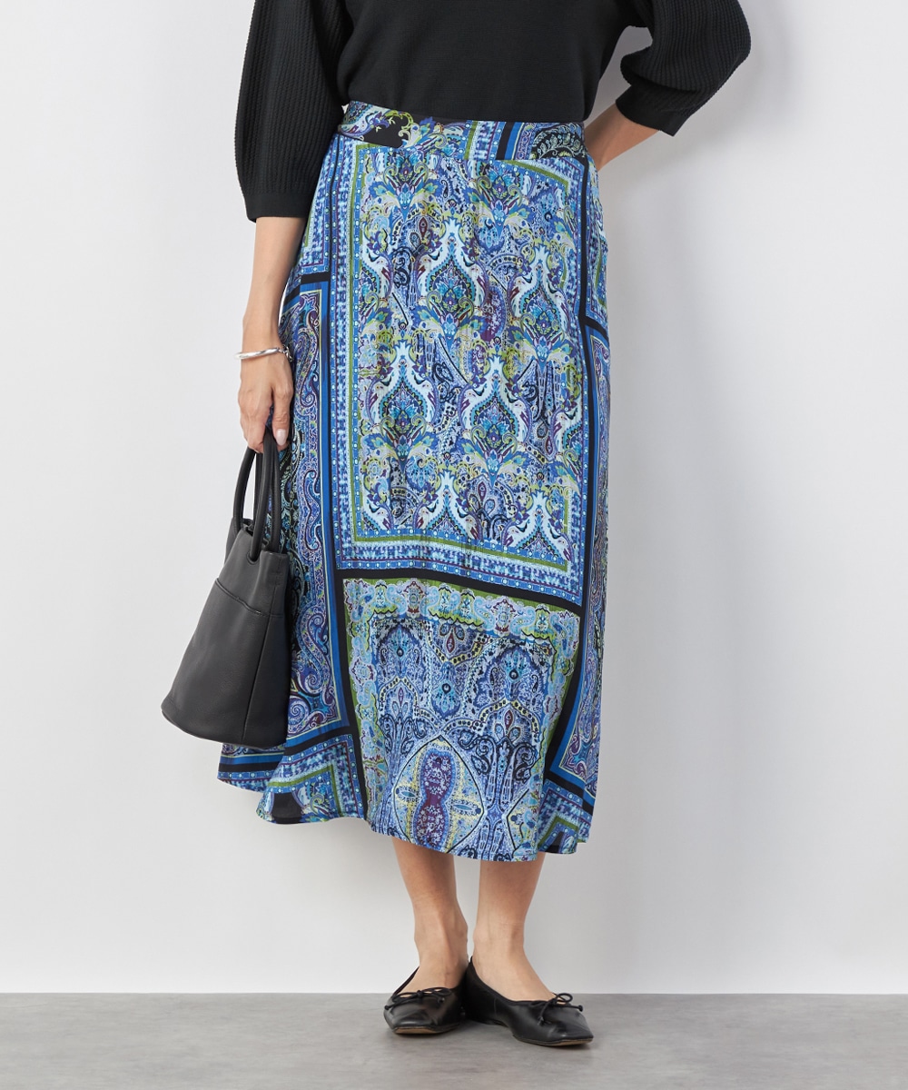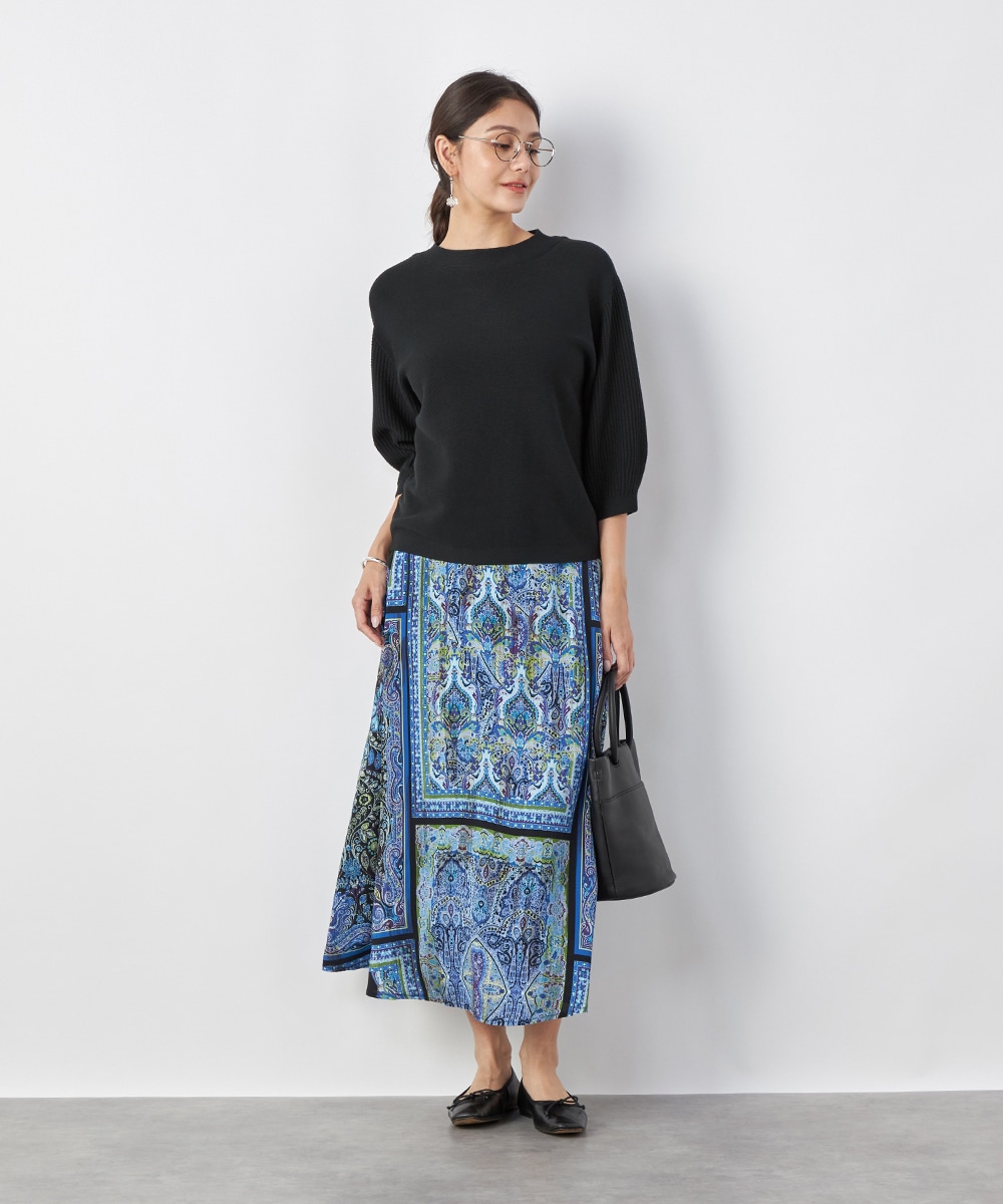 裾に向かってきれいに広がるよう、シルエットにこだわっています。ウエスト回りがすっきりと見えるのもポイントです。大人っぽくエレガントに穿きこなせる長めの丈感。生地はソフトな風合いを持ち、ドレープがエレガントな印象です。後ろウエストにゴムが入り、フィット感良く着用できます。