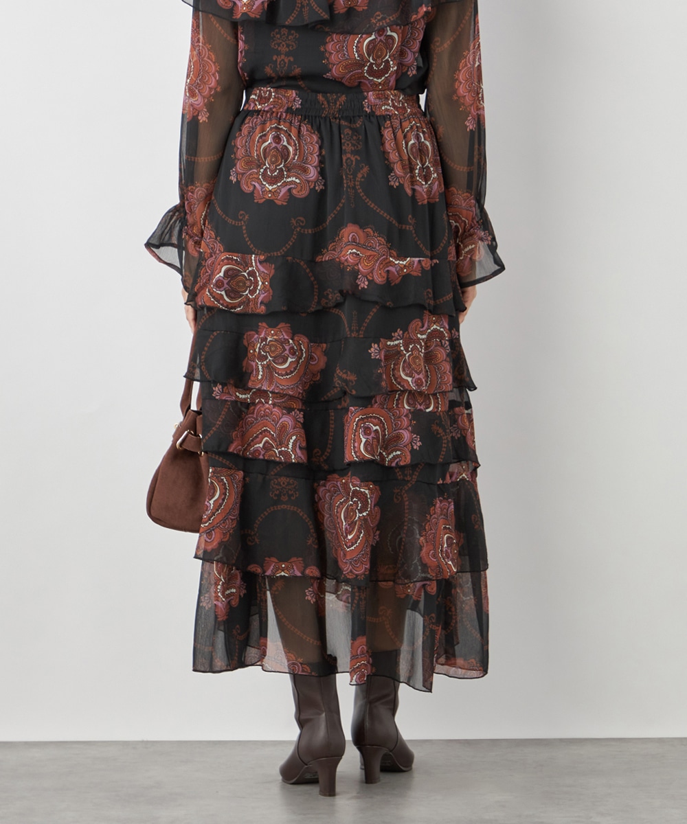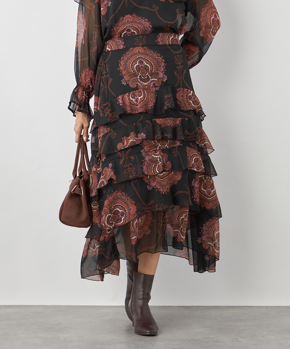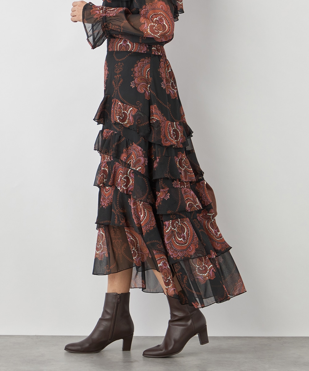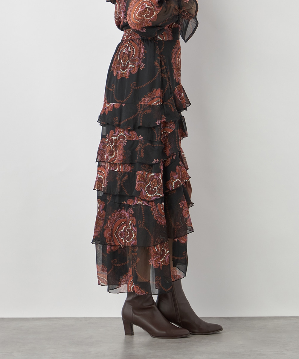 広がりすぎないシルエットに仕上げたことで、たっぷりのフリルデザインでもすっきりと穿きこなせます。大人っぽくエレガントな印象のロング丈を採用。後ろウエストにゴムが入り、フィット感良く身に着けられます。ざっくりとしたニットとのコーディネートがおすすめです。同素材のブラウスもございます。